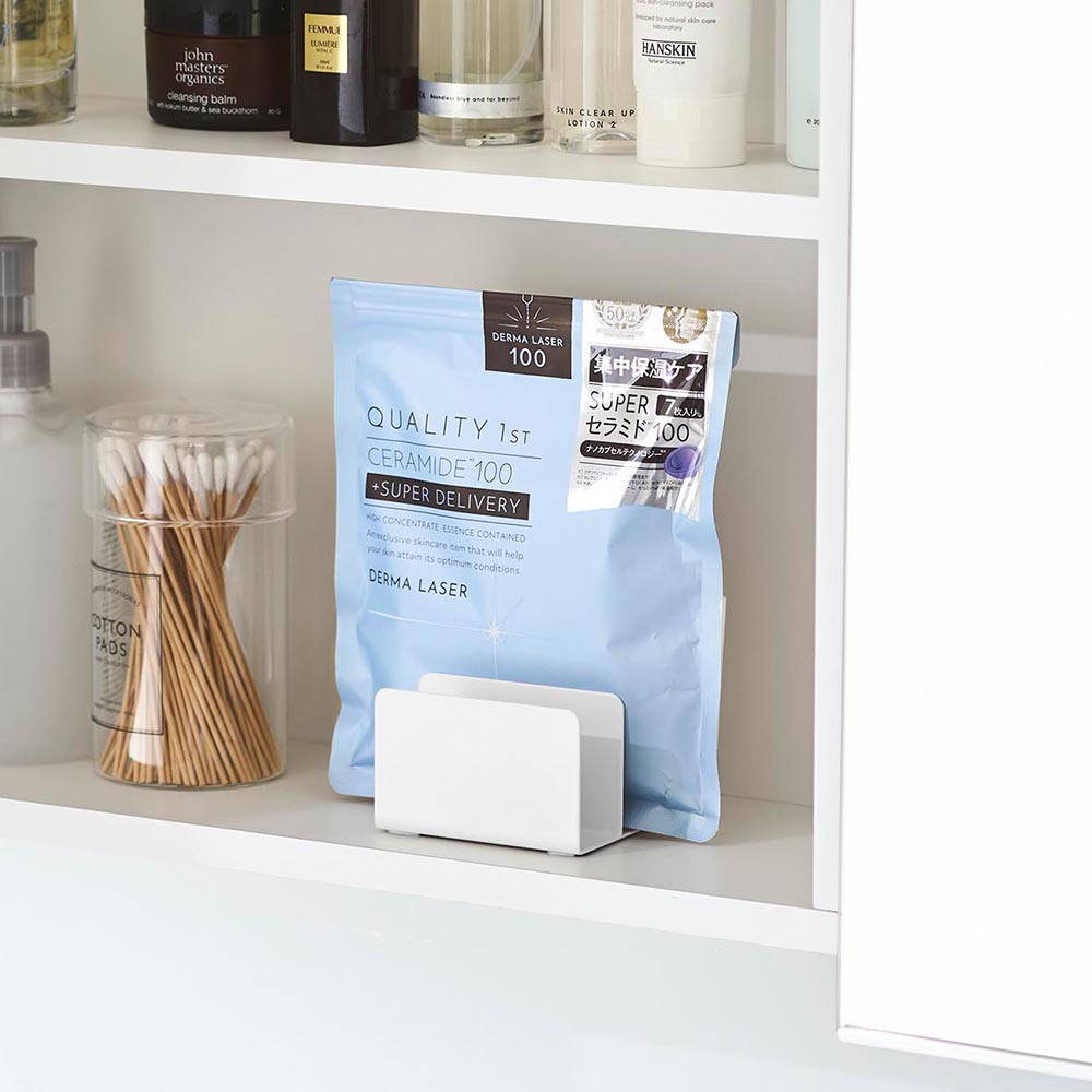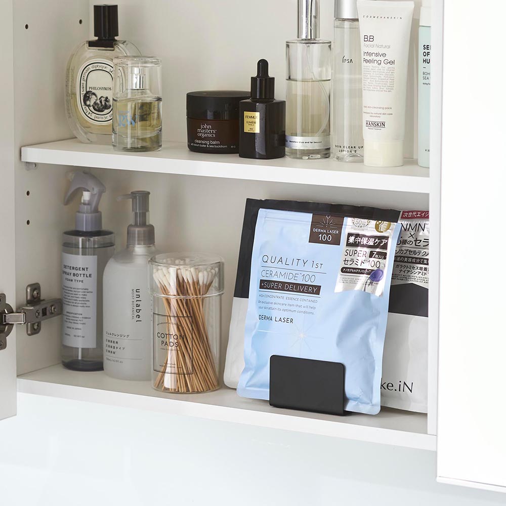 スタンド本体の奥行きは7.5cmと、洗面鏡中に置けるコンパクトなサイズ。自立させることで、洗面鏡中に収納しづらいフェイスマスクもスッキリ収納できます。スペースも無駄にしません。また、取り出しやすくなるのでスムーズにお手入れできます。引き出し中で使用しても便利です。