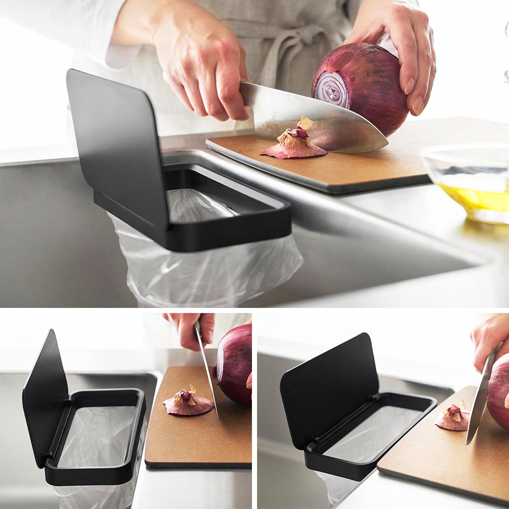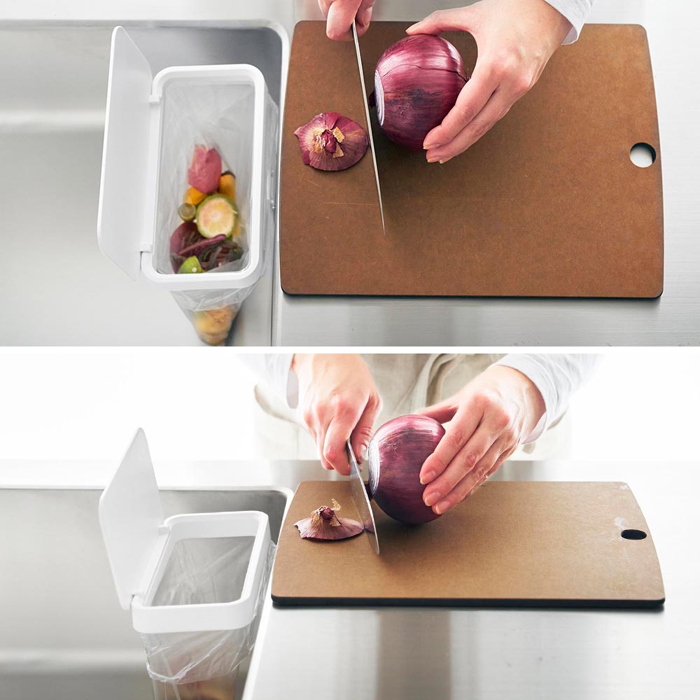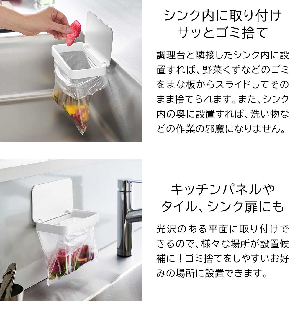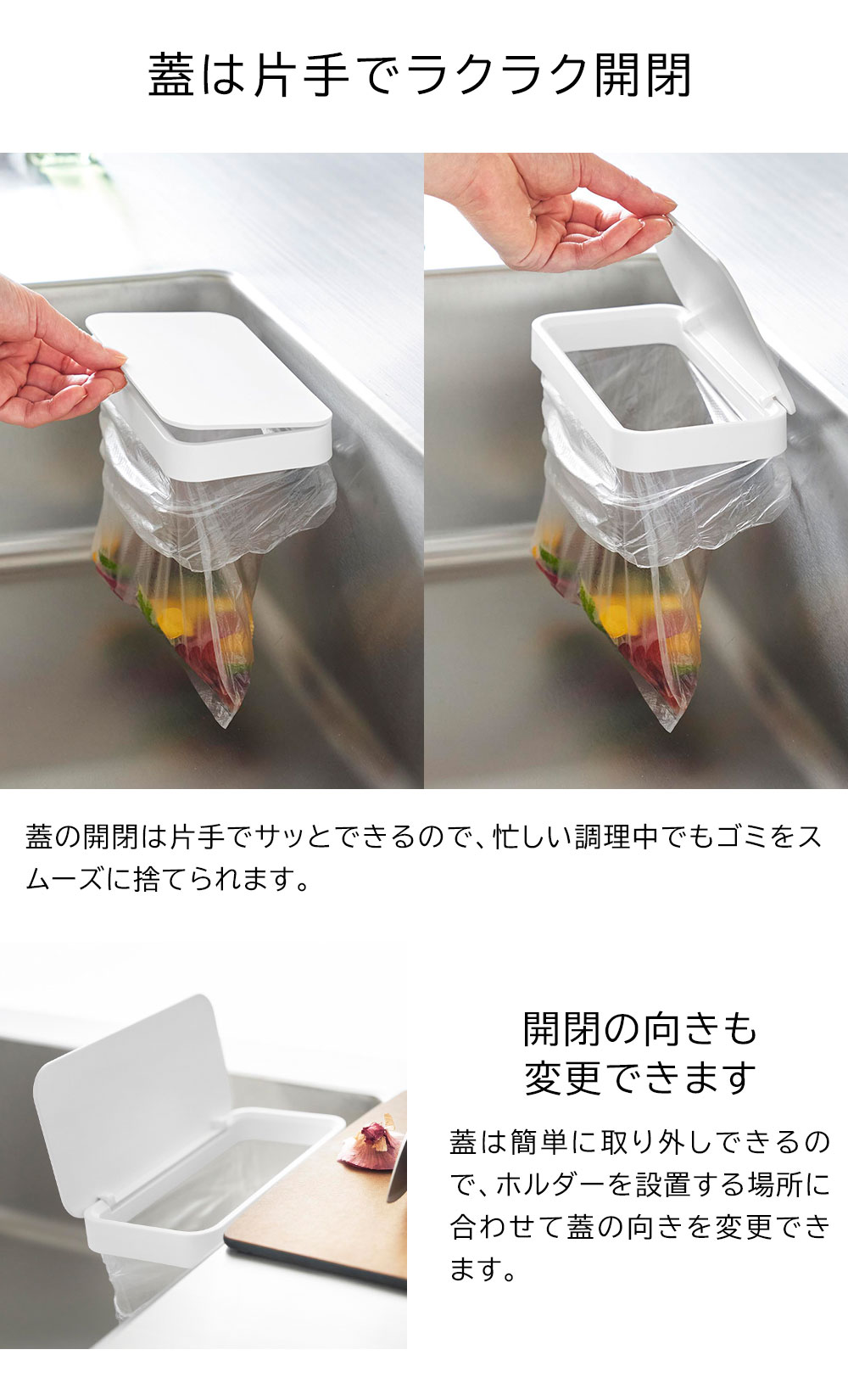 フィルムフックで簡単設置 フィルムフックに掛けるだけの簡単設置。お好みの場所でサッとゴミ捨てができる蓋付きのポリ袋ホルダーです。調理台近くのシンク内に取り付ければ、まな板から野菜くずなどのゴミをスライドして、そのまま捨てられて便利です。使用しない時は蓋をしめておけば、捨てたゴミが上から見えず、目隠しできて見た目にもスッキリ!臭いの軽減や虫の侵入防止にもなり衛生的です。 蓋は片手でサッと開閉できます。取り外しもできるので、ポリ袋の取り付けや交換も簡単。設置する場所に合わせて開閉の向きを変更できます。 ![]() ![]() ![]() ![]() ![]() ![]() ![]() ![]() ![]() ![]() ![]() ![]() ![]() ![]() ![]() |