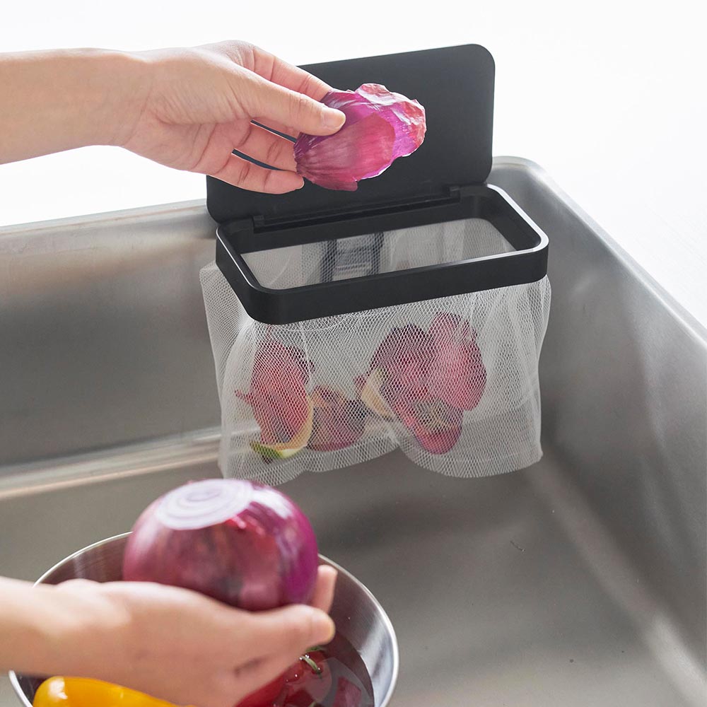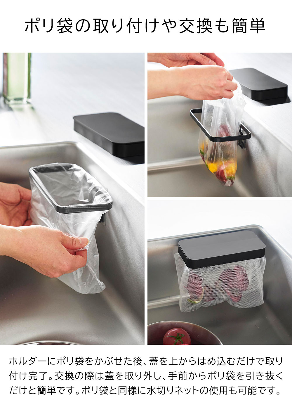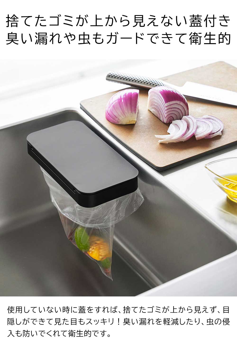 フィルムフックで簡単設置 フィルムフックに掛けるだけの簡単設置。お好みの場所でサッとゴミ捨てができる蓋付きのポリ袋ホルダーです。調理台近くのシンク内に取り付ければ、まな板から野菜くずなどのゴミをスライドして、そのまま捨てられて便利です。使用しない時は蓋をしめておけば、捨てたゴミが上から見えず、目隠しできて見た目にもスッキリ!臭いの軽減や虫の侵入防止にもなり衛生的です。 蓋は片手でサッと開閉できます。取り外しもできるので、ポリ袋の取り付けや交換も簡単。設置する場所に合わせて開閉の向きを変更できます。 ![]() ![]() ![]() ![]() ![]() ![]() ![]() ![]() ![]() ![]() ![]() ![]() ![]() ![]() ![]() |