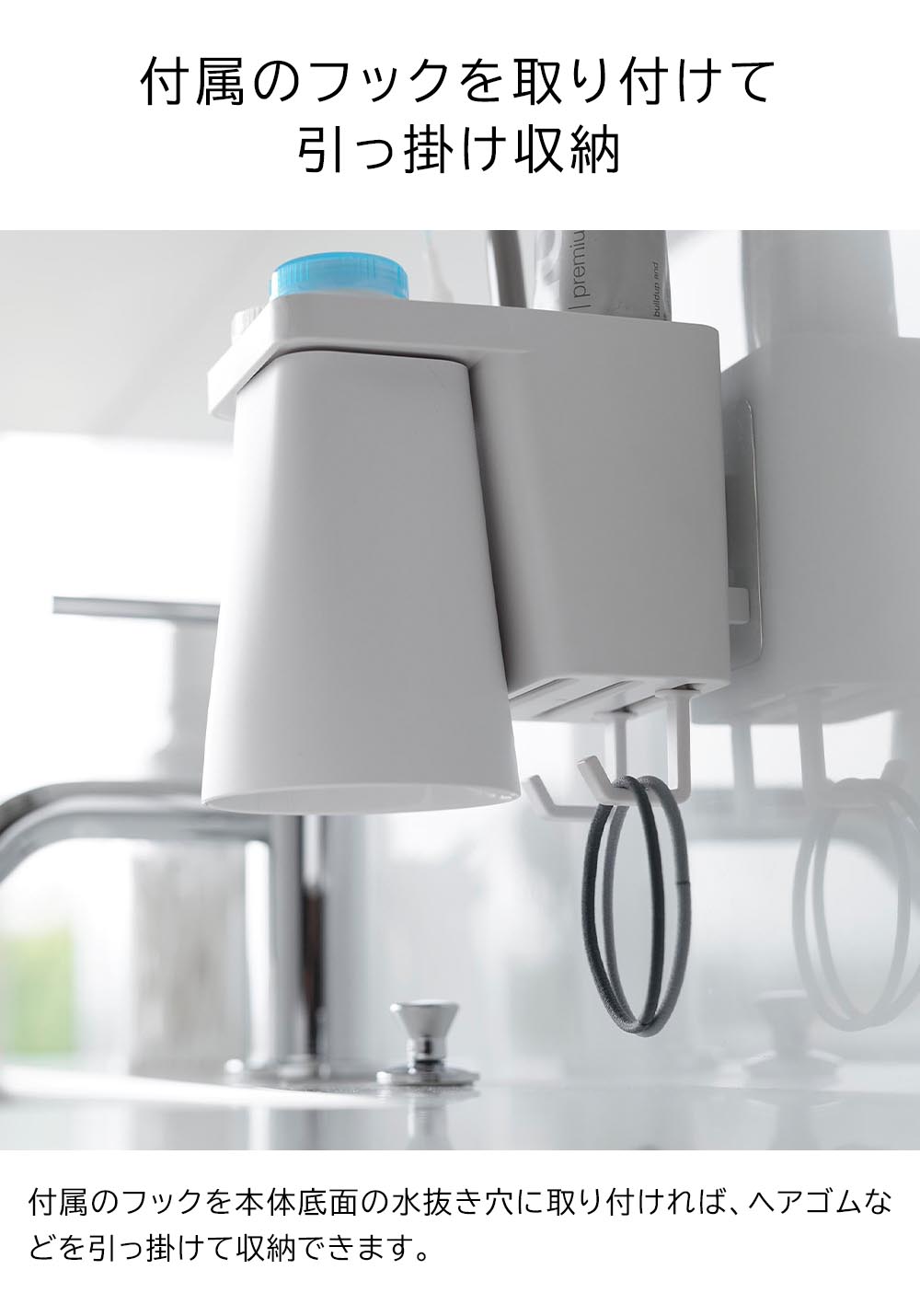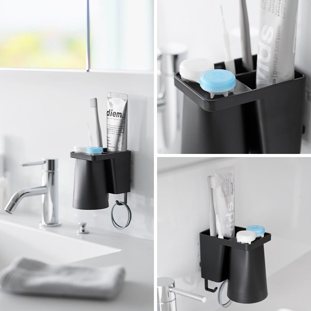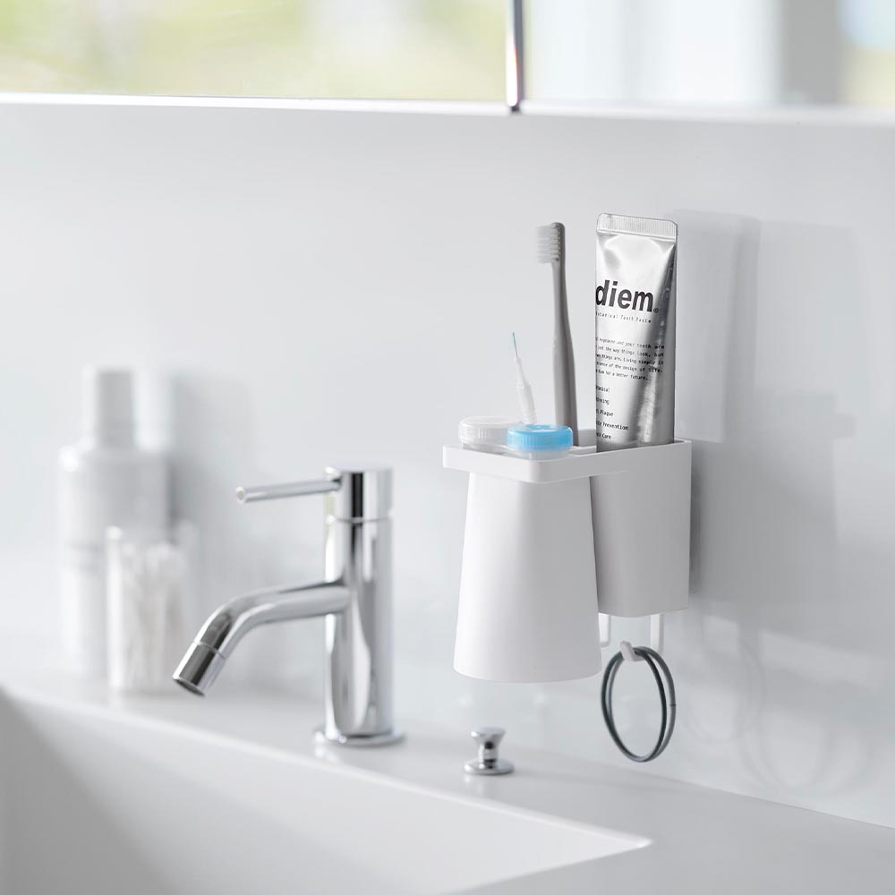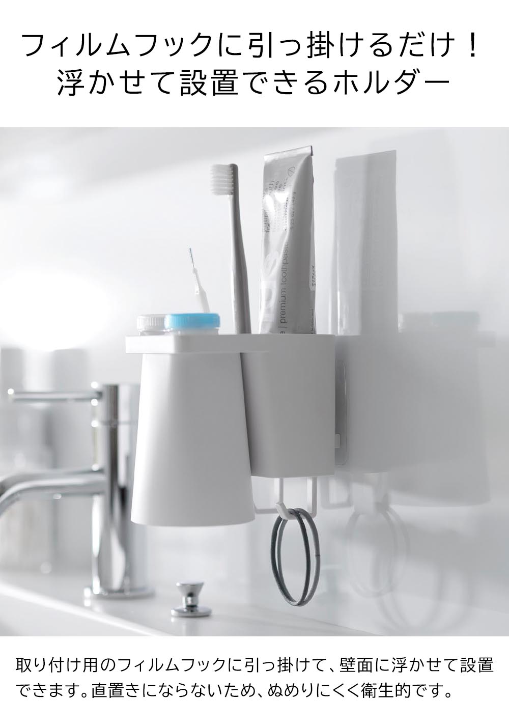 フィルムフックで簡単設置 歯ブラシ・歯間ブラシ・歯磨き粉など、1人分の歯磨きセットをひとまとめに収納できるタンブラー付きのホルダーです。 タンブラーの底面には、マグネットが内蔵されており、本体のホルダー部分にくっつけるだけで簡単に収納できます。タンブラーが逆さに収納できるため水切れが良く、乾かしながら収納できます。 歯磨きセット収納部は、仕切りでアイテムごとに分けられ取り出しもスムーズです。仕切り板は取り外せるから汚れたら丸ごと洗って清潔を保てます。 手前のトレーはコンタクトレンズのケースやヘアピンなどの小物を置く場所に。フチ付きで落下の心配はありません。 付属のフックを使えば、ヘアゴムなどを引っ掛けるのに便利です。 フィルムフックでバスルームや洗面スペースの壁面に取り付けられるので、ぬめりにくく風通し良い浮かせる収納が簡単に作れます。 ![]() ![]() ![]() ![]() ![]() ![]() ![]() ![]() ![]() ![]() ![]() ![]() ![]() ![]() |