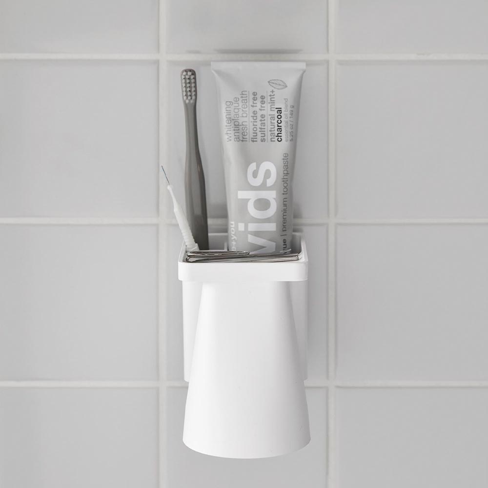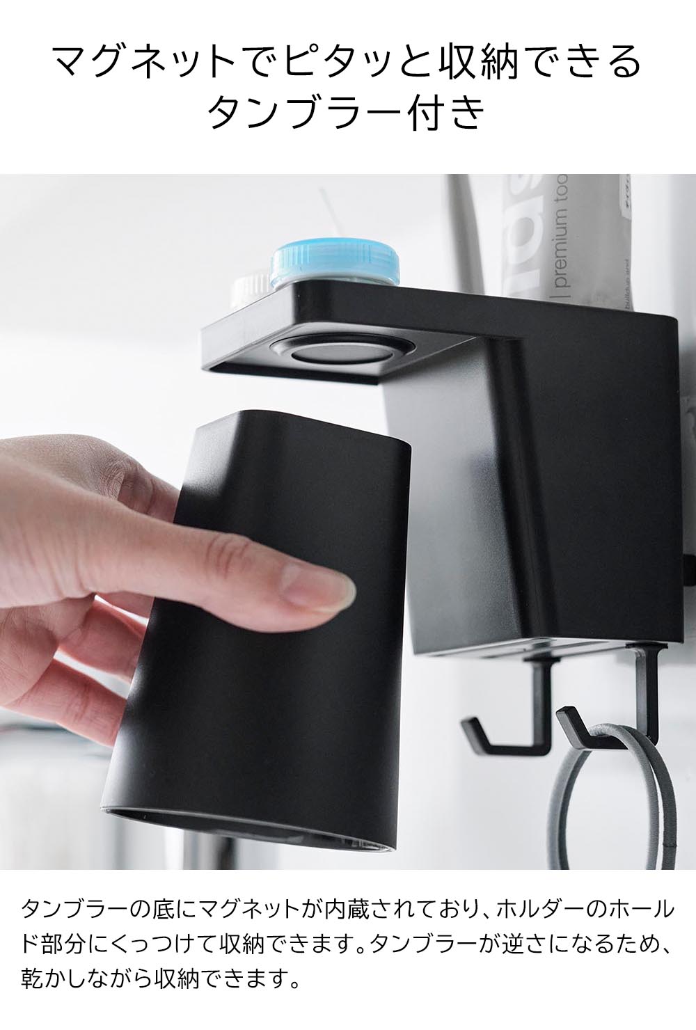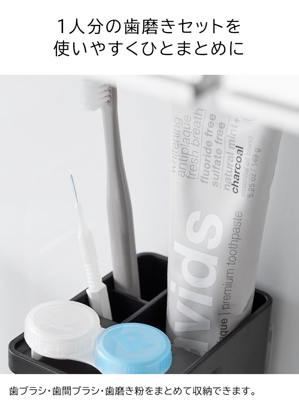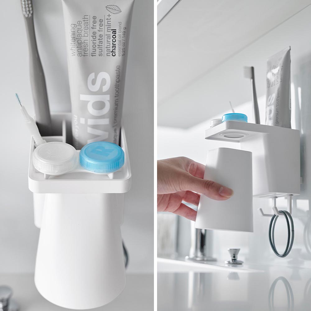 フィルムフックで簡単設置 歯ブラシ・歯間ブラシ・歯磨き粉など、1人分の歯磨きセットをひとまとめに収納できるタンブラー付きのホルダーです。 タンブラーの底面には、マグネットが内蔵されており、本体のホルダー部分にくっつけるだけで簡単に収納できます。タンブラーが逆さに収納できるため水切れが良く、乾かしながら収納できます。 歯磨きセット収納部は、仕切りでアイテムごとに分けられ取り出しもスムーズです。仕切り板は取り外せるから汚れたら丸ごと洗って清潔を保てます。 手前のトレーはコンタクトレンズのケースやヘアピンなどの小物を置く場所に。フチ付きで落下の心配はありません。 付属のフックを使えば、ヘアゴムなどを引っ掛けるのに便利です。 フィルムフックでバスルームや洗面スペースの壁面に取り付けられるので、ぬめりにくく風通し良い浮かせる収納が簡単に作れます。 ![]() ![]() ![]() ![]() ![]() ![]() ![]() ![]() ![]() ![]() ![]() ![]() ![]() ![]() |