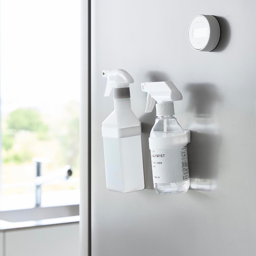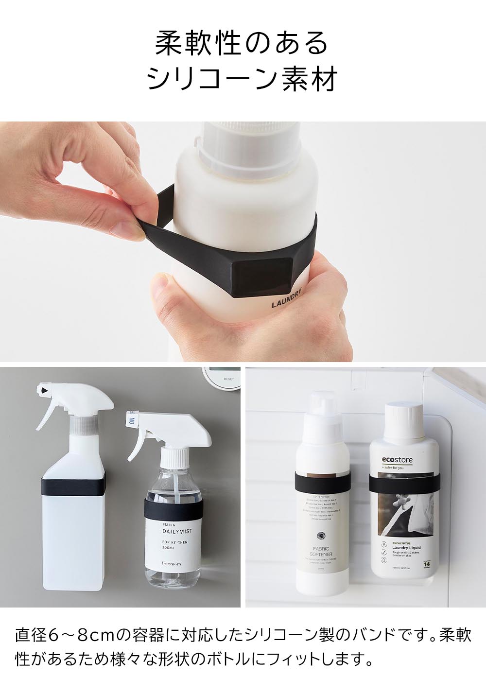 お掃除用のスプレーボトルや洗剤ボトル、ドリンクボトルなど、直置きするしかなかったボトル類をマグネットで簡単に浮かせて収納できるバンドです。