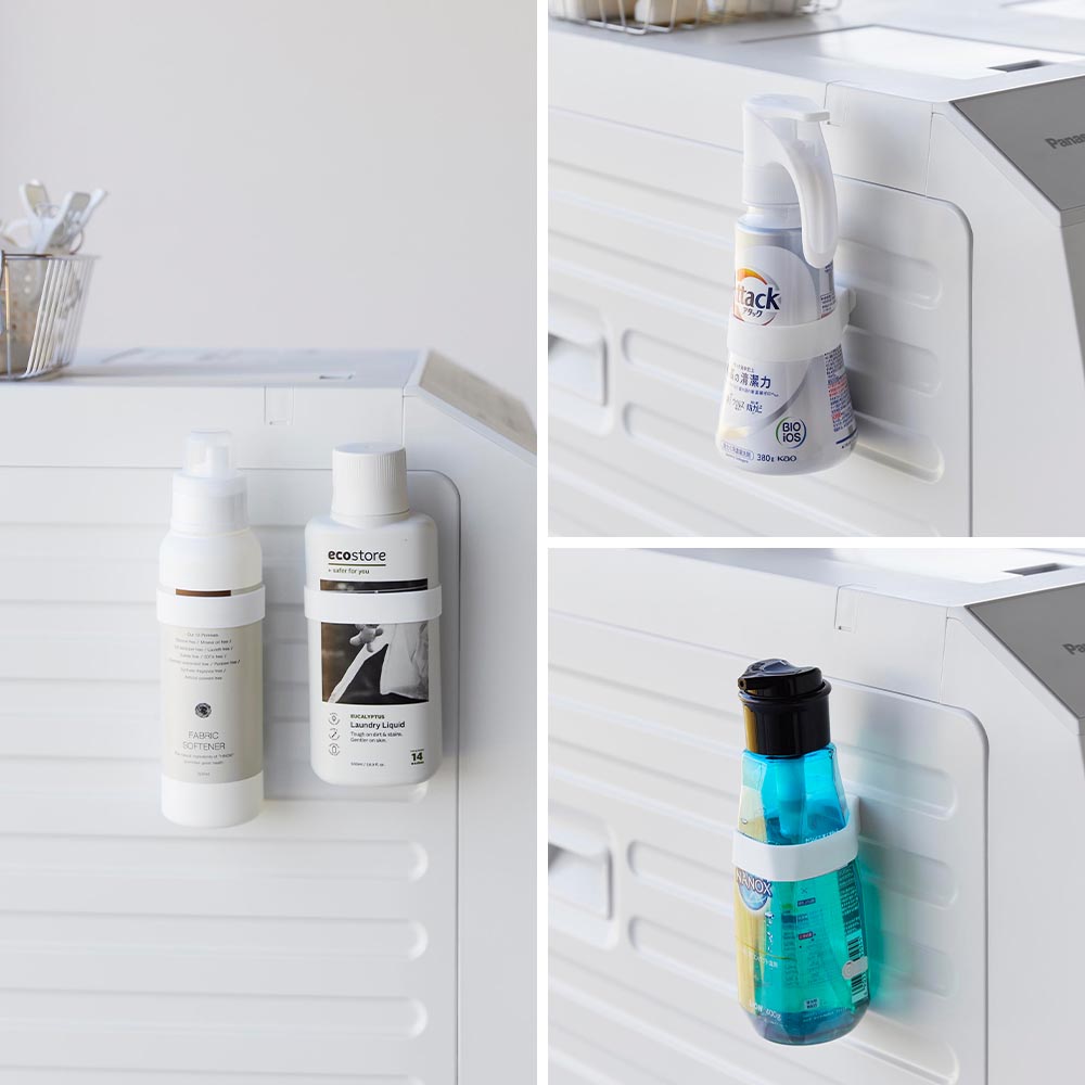 シリコーン製のバンドにマグネットが内蔵されており、冷蔵庫横や洗濯機横、バスルームの壁などにピタッと手軽に貼り付けて収納できます。