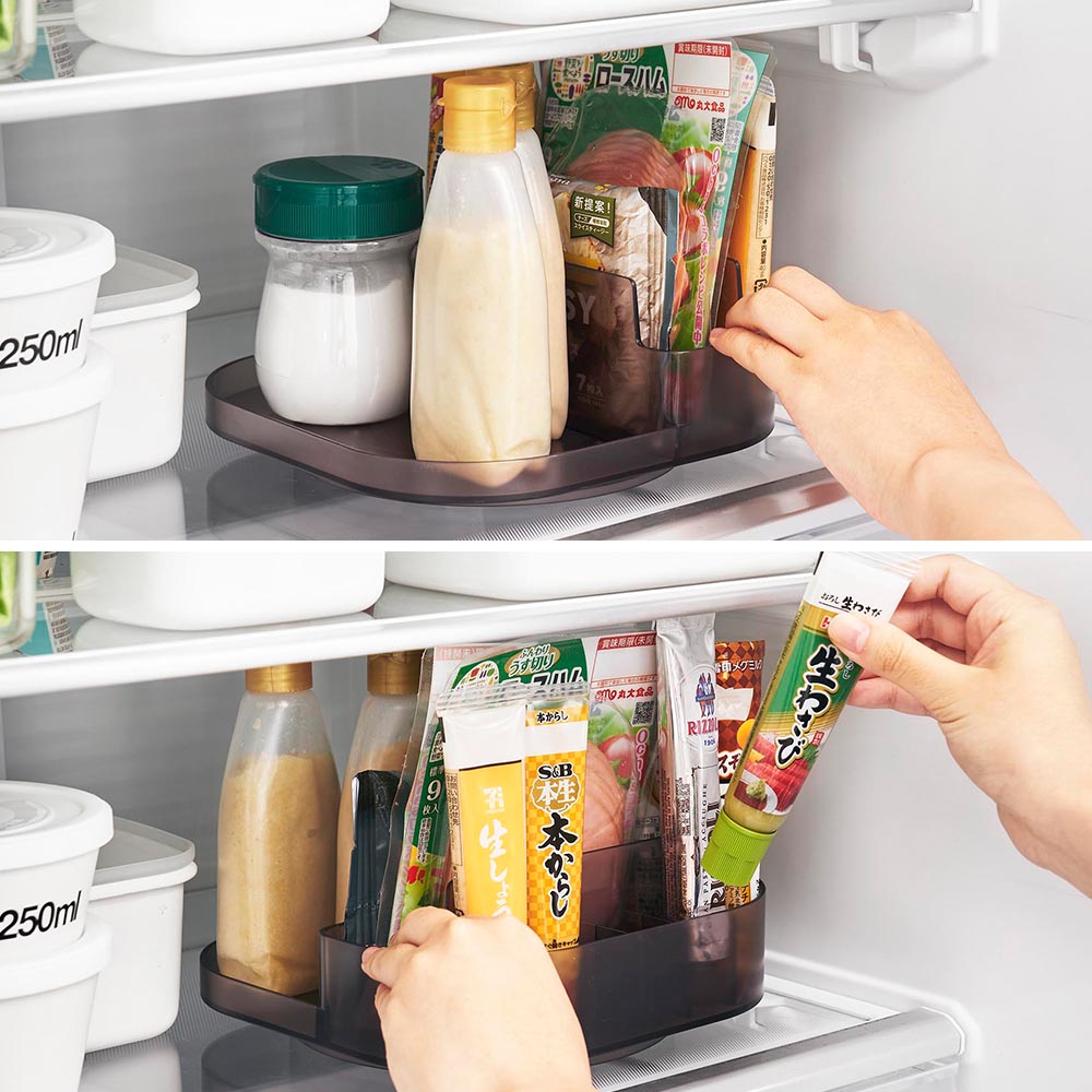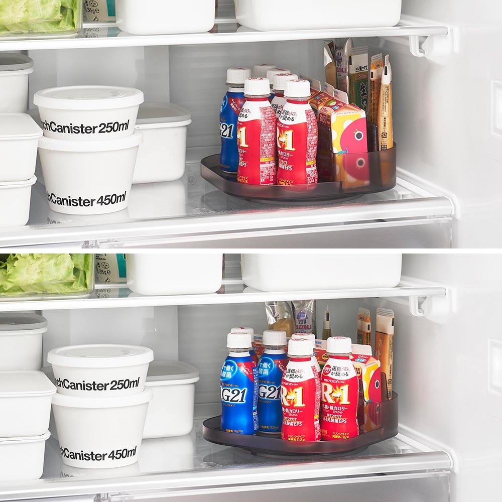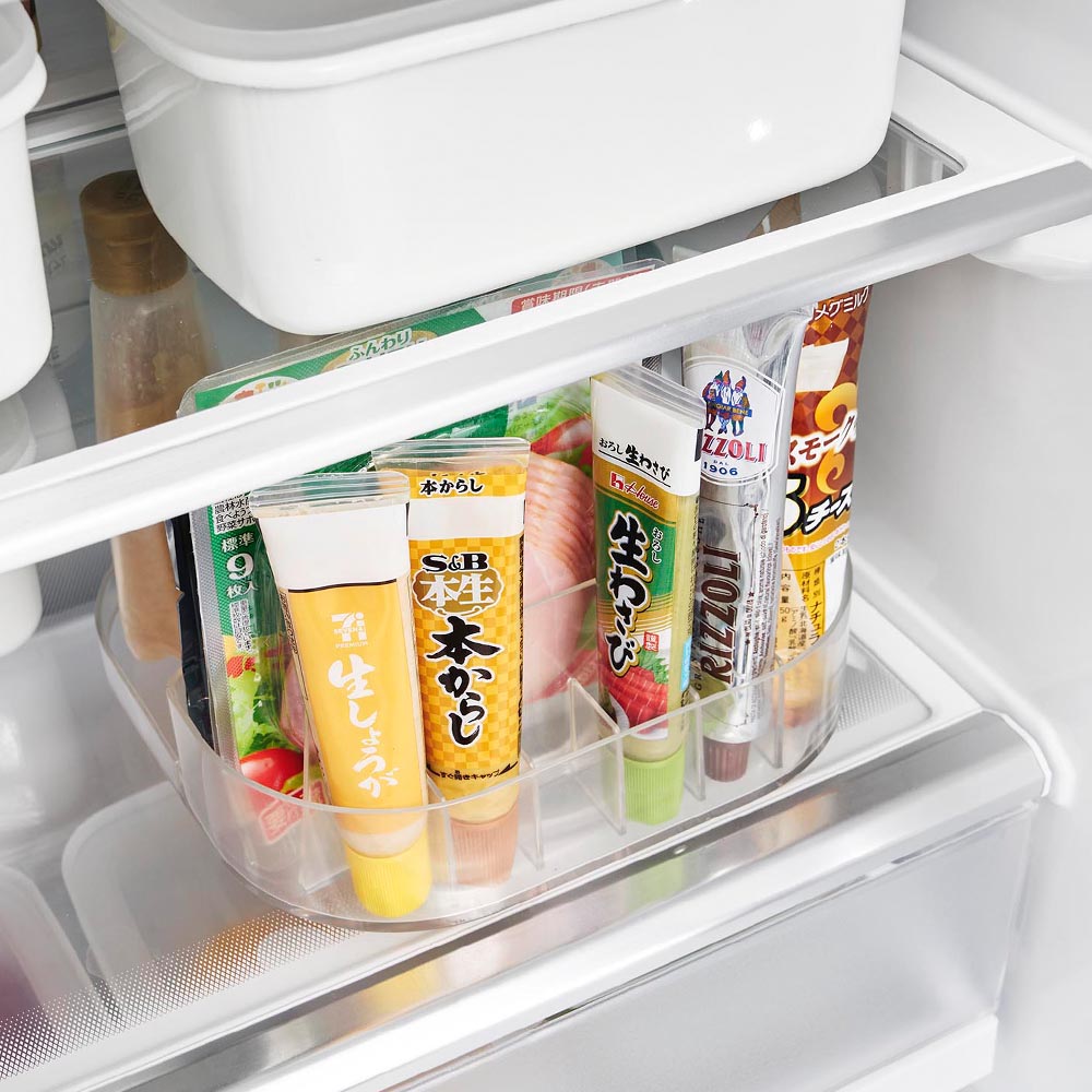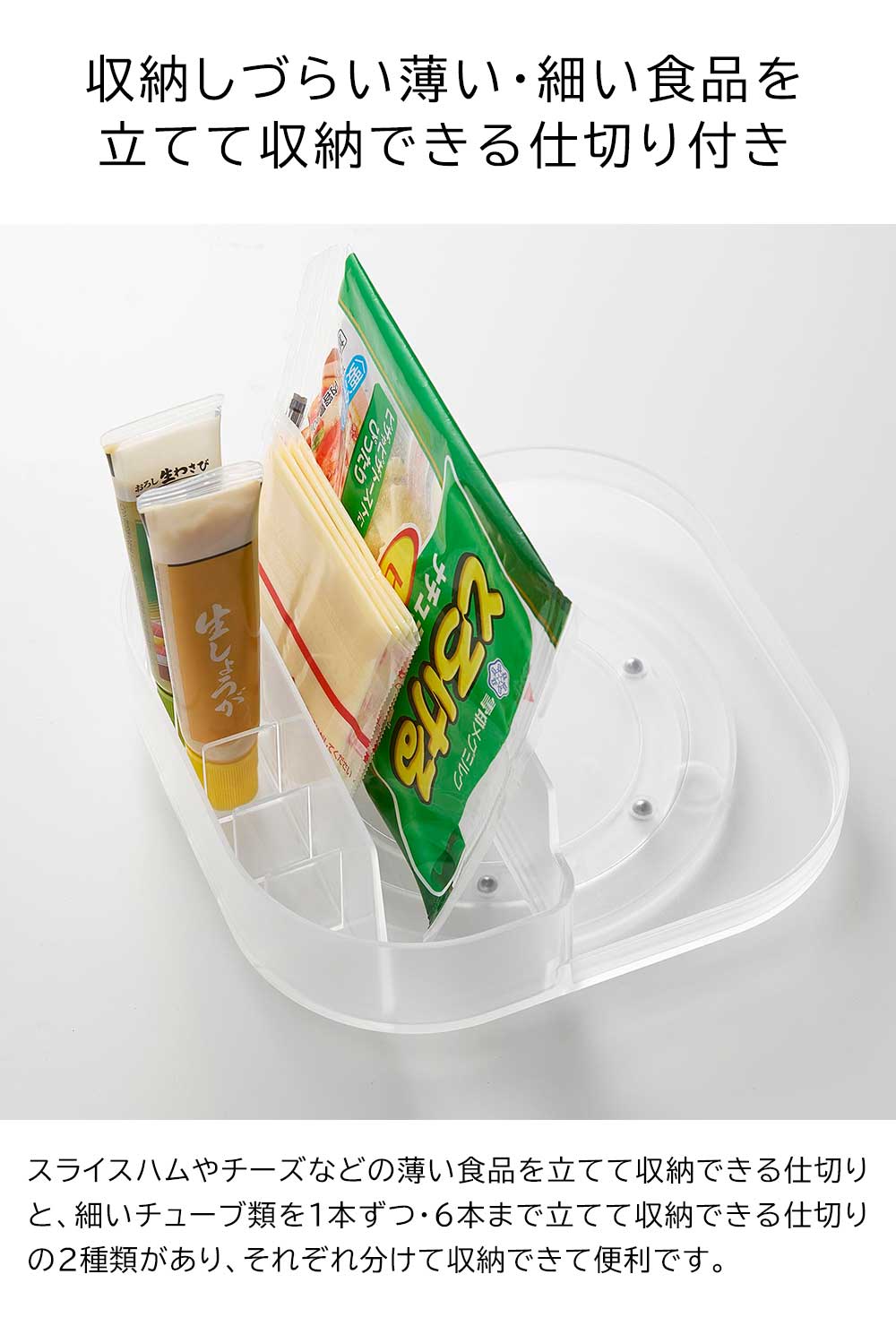 冷蔵庫奥にしまった調味料や 冷蔵庫内の調味料や細々とした食品をまとめてスッキリ整頓!冷蔵庫奥にしまっても取り出しやすい仕切り付きの回転式のトレーです。トレーは360度クルッと回転。奥にしまった物を手前に簡単に移動でき、楽に取り出すことができます。底面には滑り止めがついているのでトレーを回転させてもずれにくく安心。冷蔵庫内で収納しづらいスライスハムやチーズ、細いチューブ類を立てて収納できる仕切りも付いています。 トレーの形状はスクエア型なので、冷蔵庫内に無駄な隙間を作ることなく、スッキリと整頓・収納できます。また、フチの浅いトレー側には、高さのある調味料を出し入れしやすく便利です。 ![]() ![]() ![]() ![]() ![]() ![]() ![]() ![]() ![]() ![]() ![]() |
