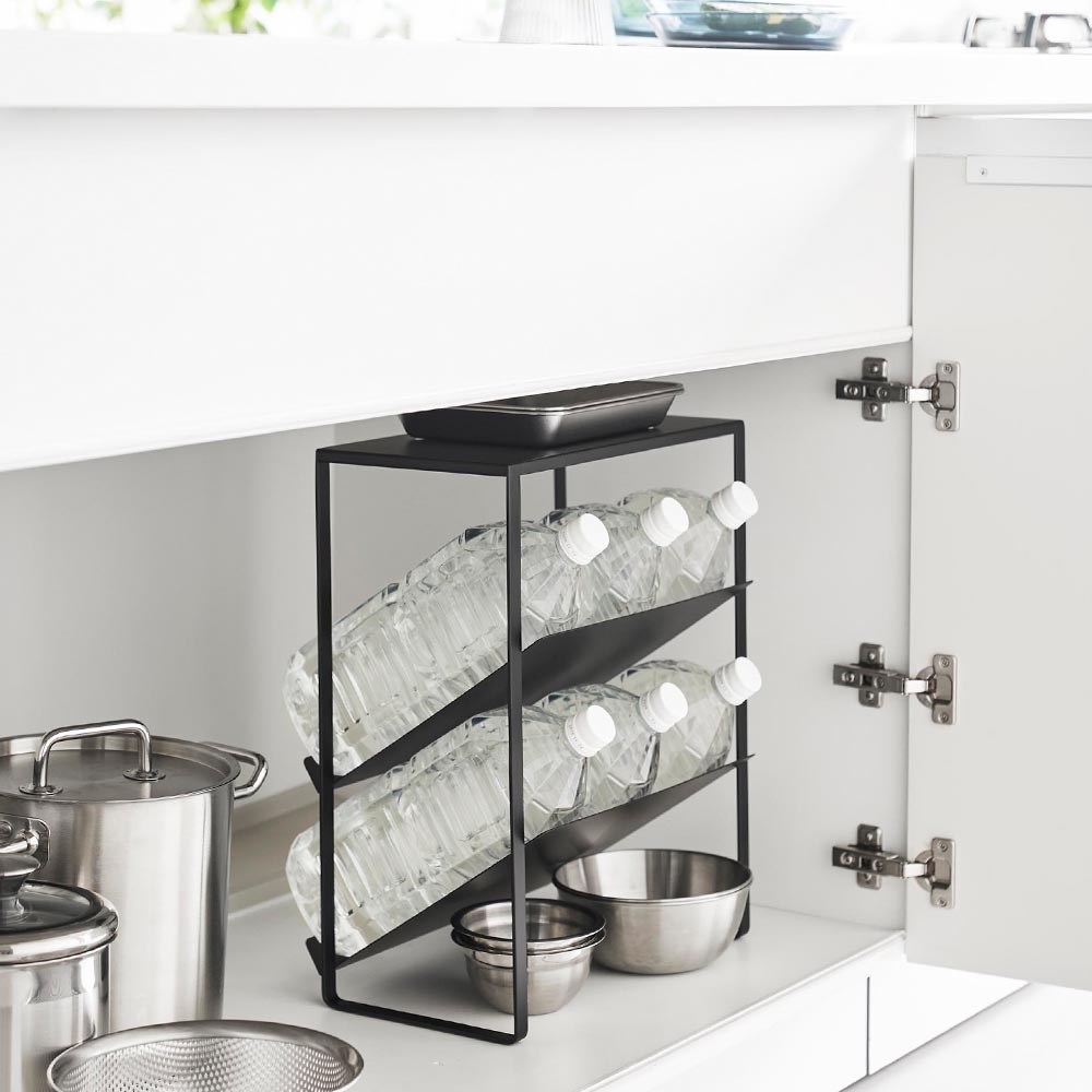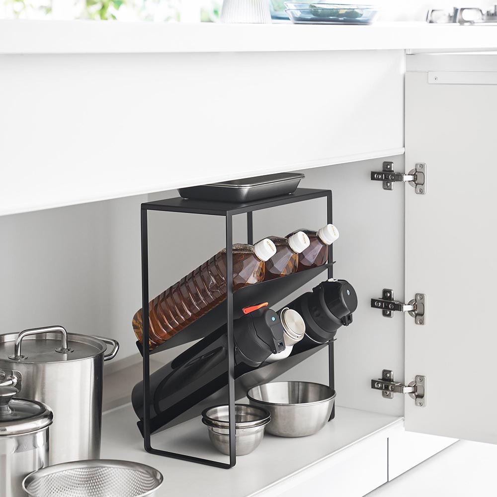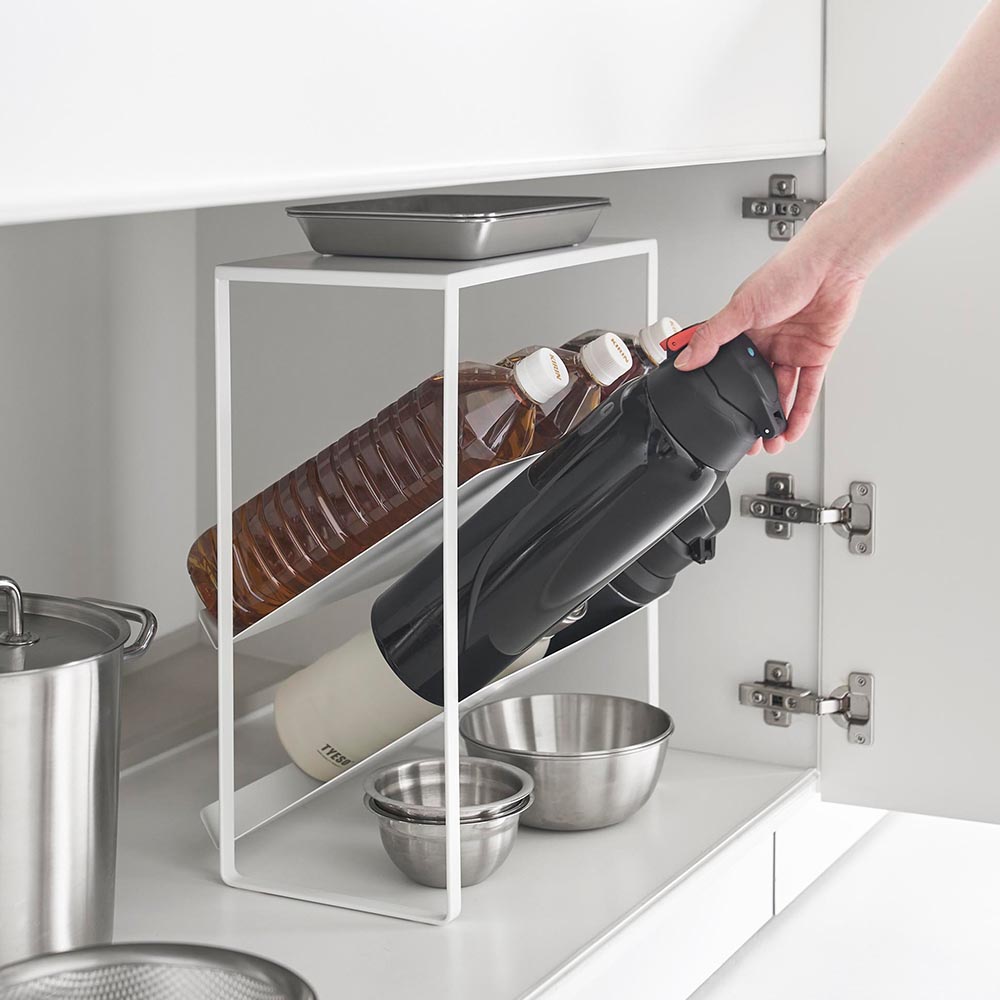 収納に困る大きなボトルを 1.5L程のやや大きめの水筒や2Lのペットボトルなど、収納に困る大きなボトルをキッチンシンク下にスッキリと収納できるボトルストッカーです。奥行きと高さがあり、デッドスペースが生まれがちなシンク下の収納空間を無駄なく活用し、かさばる水筒やペットボトルを整理整頓できます。収納棚はボトルの出し入れがしやすい斜めの形状。天板付きなので、小物も置けます。 また、洗剤やシャンプーボトルなど、洗面台下の収納にも使えて便利です。 ![]() ![]() ![]() ![]() ![]() ![]() ![]() ![]() ![]() ![]() ![]() ![]() |