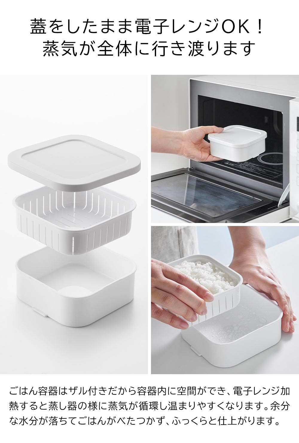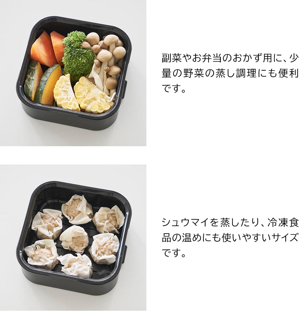 一膳分(150g)のごはんが入る冷凍ごはん容器は、ザルがあることで、電子レンジで加熱した際に蒸し器のように蒸気が全体に行き渡り、冷凍ごはんがふっくら炊き立てのように仕上がります。また、ザルから余分な水分が下に落ちるのでごはんがべたつきません。野菜やシュウマイを蒸したり、冷凍食品の温めにも便利です。