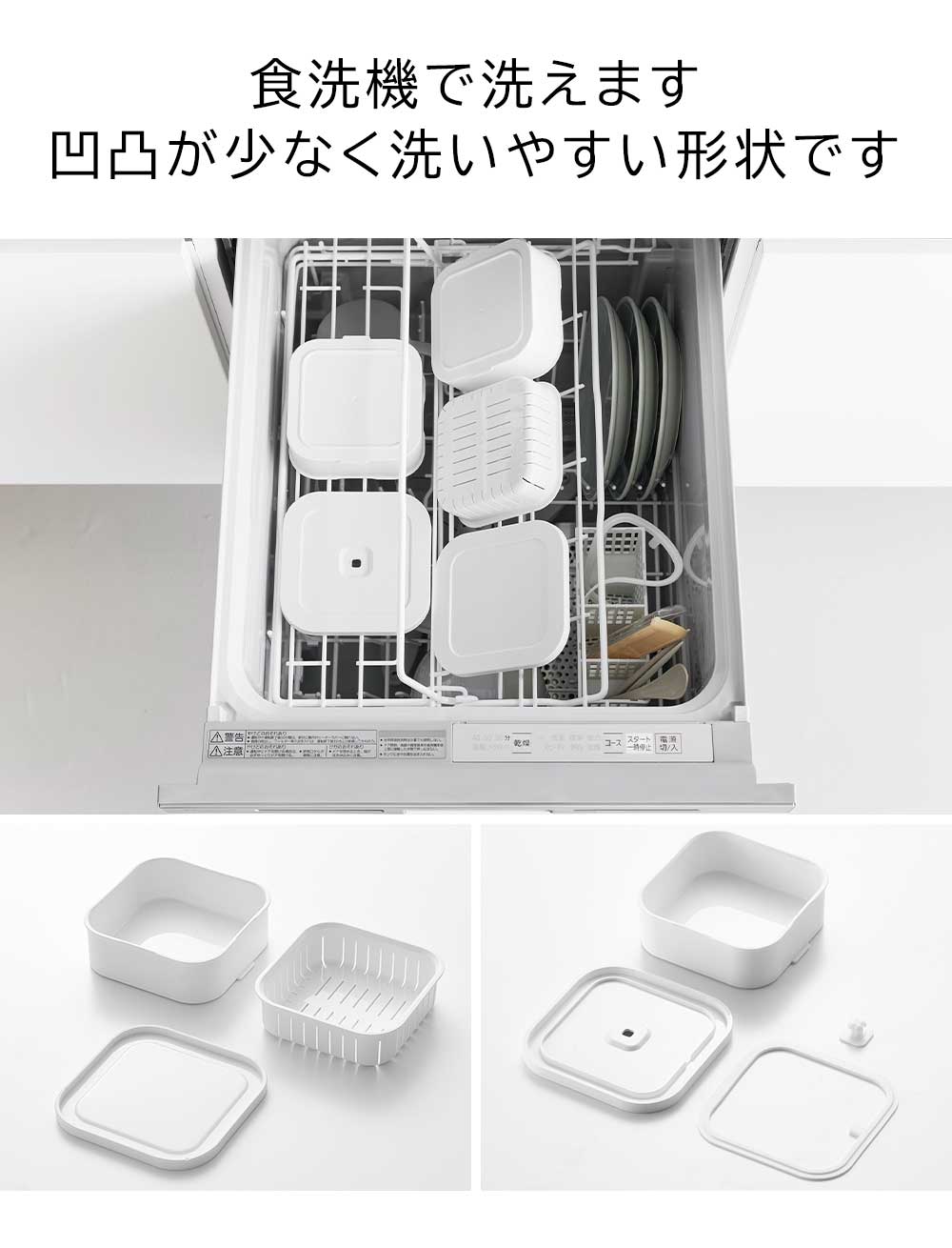 容器・ザル・蓋は全て、凹凸が少なく洗いやすいデザイン。バルブとパッキンも取り外して洗えます。食洗機が使えるので後片付けも簡単です。