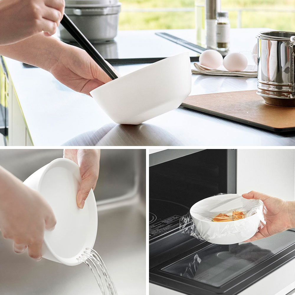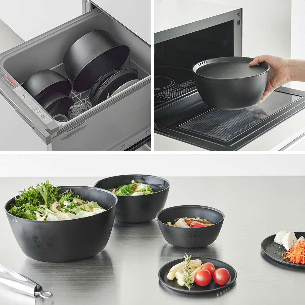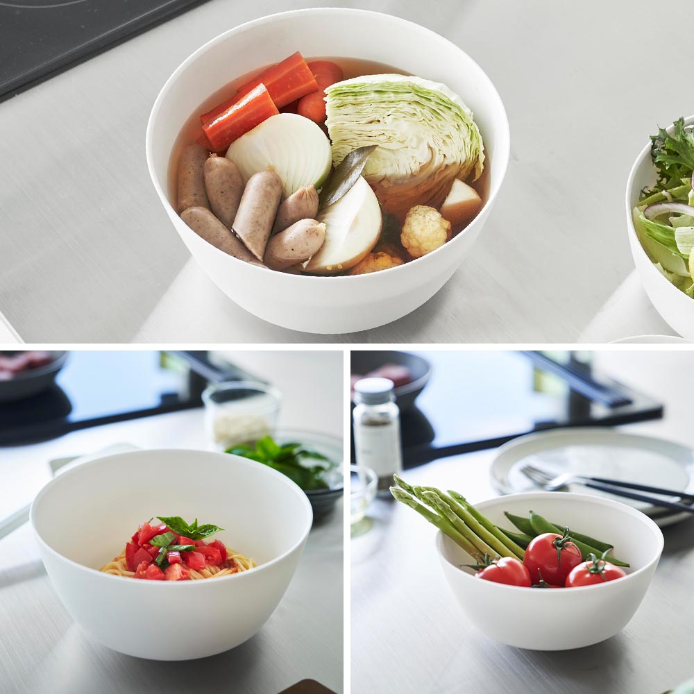 斜めをキープして混ぜやすい 傾けて軽く手で持つだけで、斜めの状態をラクにキープでき、食材を混ぜやすい調理ボウル3サイズとボウル専用の蓋2サイズの5点セット。ボウルは安定して混ぜられるので手にかかる負担も軽くなります。ボウルや蓋のサイズによって料理ごとに使い分けたり、食材別に分けておくなど、調理中の様々な場面に対応できます。蓋をしたまま電子レンジで加熱できるので、下ごしらえに便利。冷凍保存も可能です。ボウルに蓋をすることでスタッキングが可能になり、冷蔵庫内で場所をとらずに食材を保存できます。また、蓋には水抜け穴があり、水切りもできます。 スッキリとしたシンプルなデザインで、器としても使えます。食卓にそのまま出せるので、洗い物を減らせます。食洗機対応でお手入れも簡単です。 ![]() ![]() ![]() ![]() ![]() ![]() ![]() ![]() ![]() ![]() ![]() ![]() ![]() ![]() ![]() ![]() ![]() ![]() |