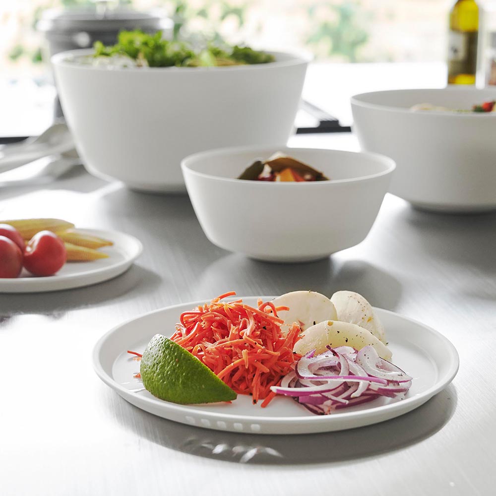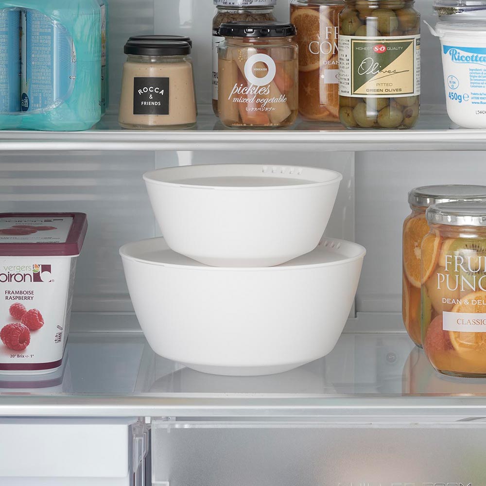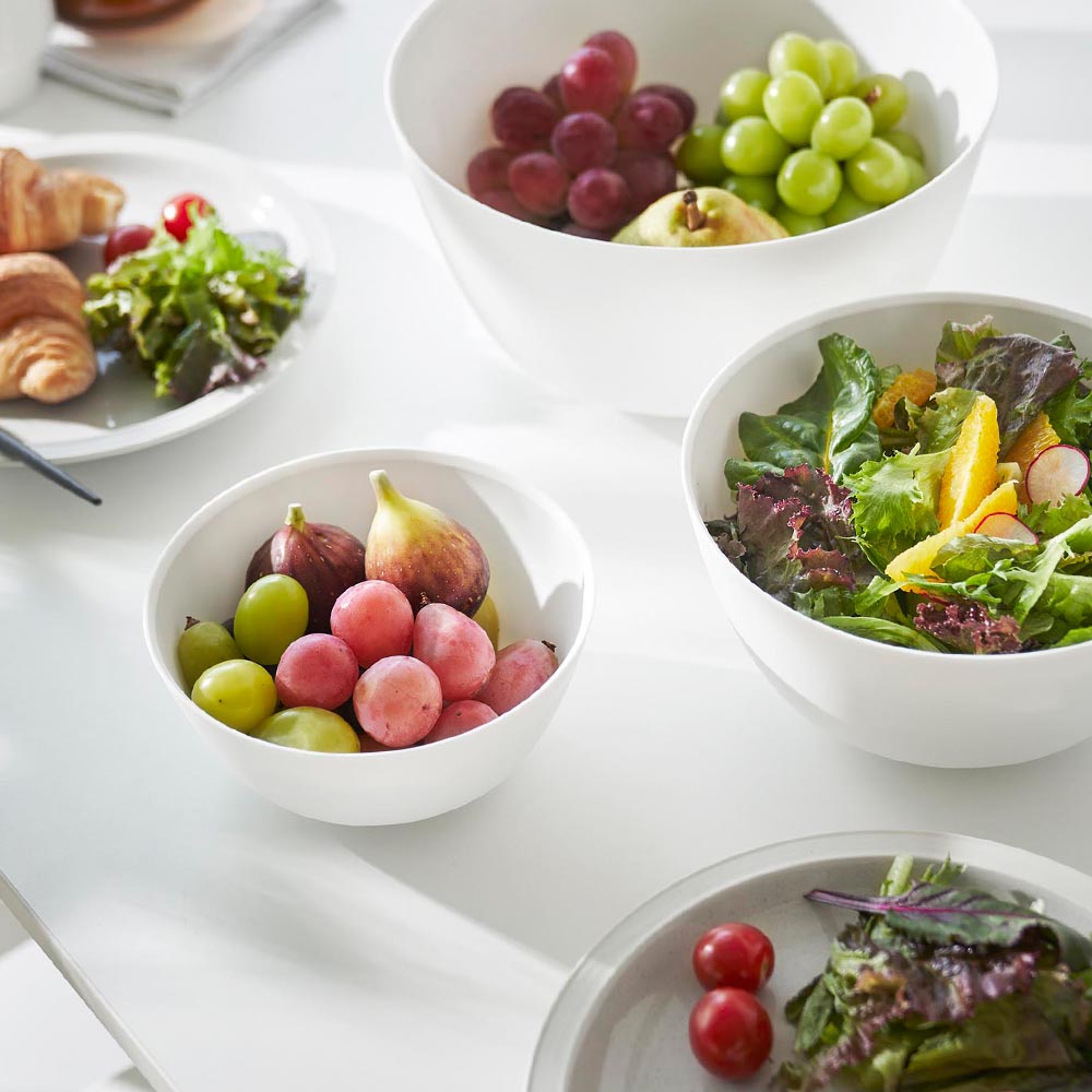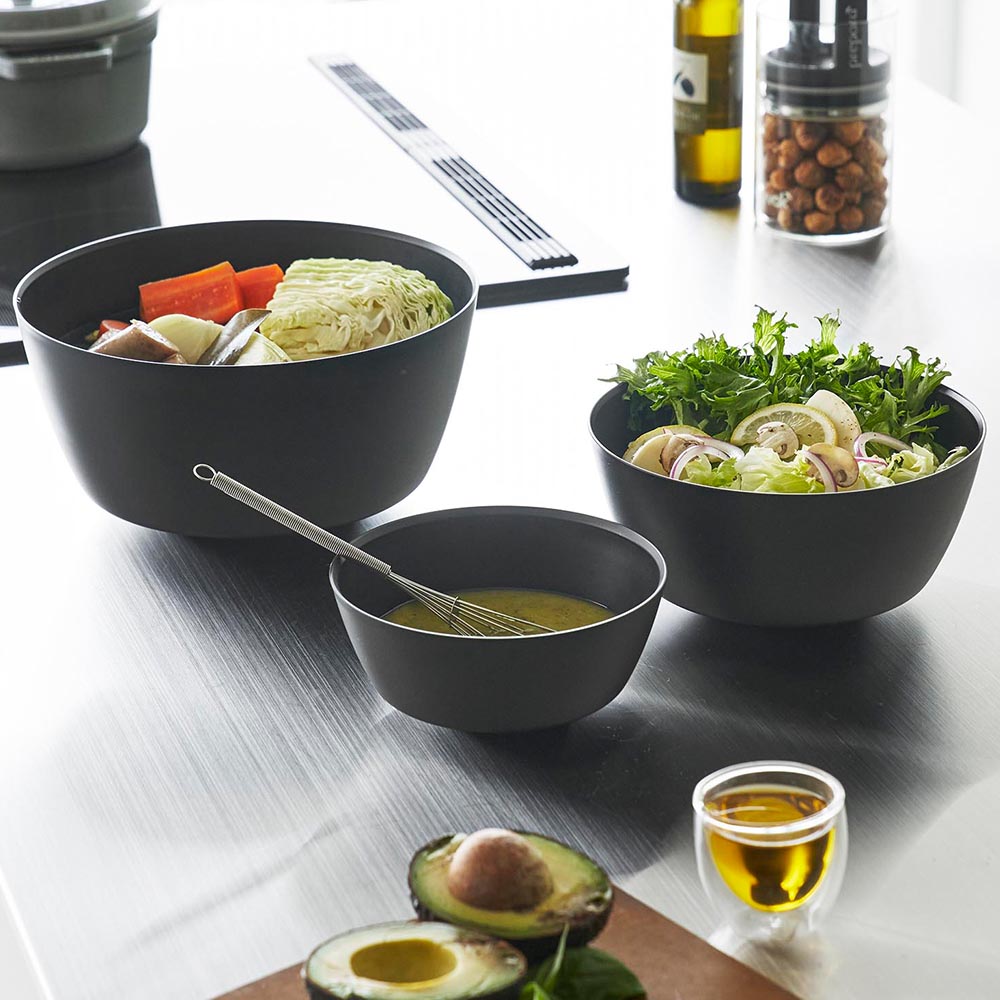 斜めをキープして混ぜやすい 傾けて軽く手で持つだけで、斜めの状態をラクにキープでき、食材を混ぜやすい調理ボウル3サイズとボウル専用の蓋2サイズの5点セット。ボウルは安定して混ぜられるので手にかかる負担も軽くなります。ボウルや蓋のサイズによって料理ごとに使い分けたり、食材別に分けておくなど、調理中の様々な場面に対応できます。蓋をしたまま電子レンジで加熱できるので、下ごしらえに便利。冷凍保存も可能です。ボウルに蓋をすることでスタッキングが可能になり、冷蔵庫内で場所をとらずに食材を保存できます。また、蓋には水抜け穴があり、水切りもできます。 スッキリとしたシンプルなデザインで、器としても使えます。食卓にそのまま出せるので、洗い物を減らせます。食洗機対応でお手入れも簡単です。 ![]() ![]() ![]() ![]() ![]() ![]() ![]() ![]() ![]() ![]() ![]() ![]() ![]() ![]() ![]() ![]() ![]() ![]() |