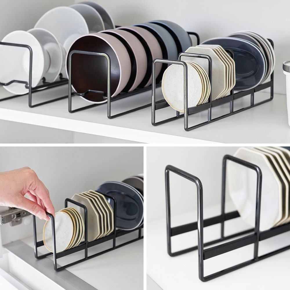 直径6~13cmの豆皿や小鉢などを立ててスリムに並べられます。仕切りがあることで形状が異なるお皿を分けて整頓でき、奥のお皿も見渡しやすくスムーズに出し入れできます。