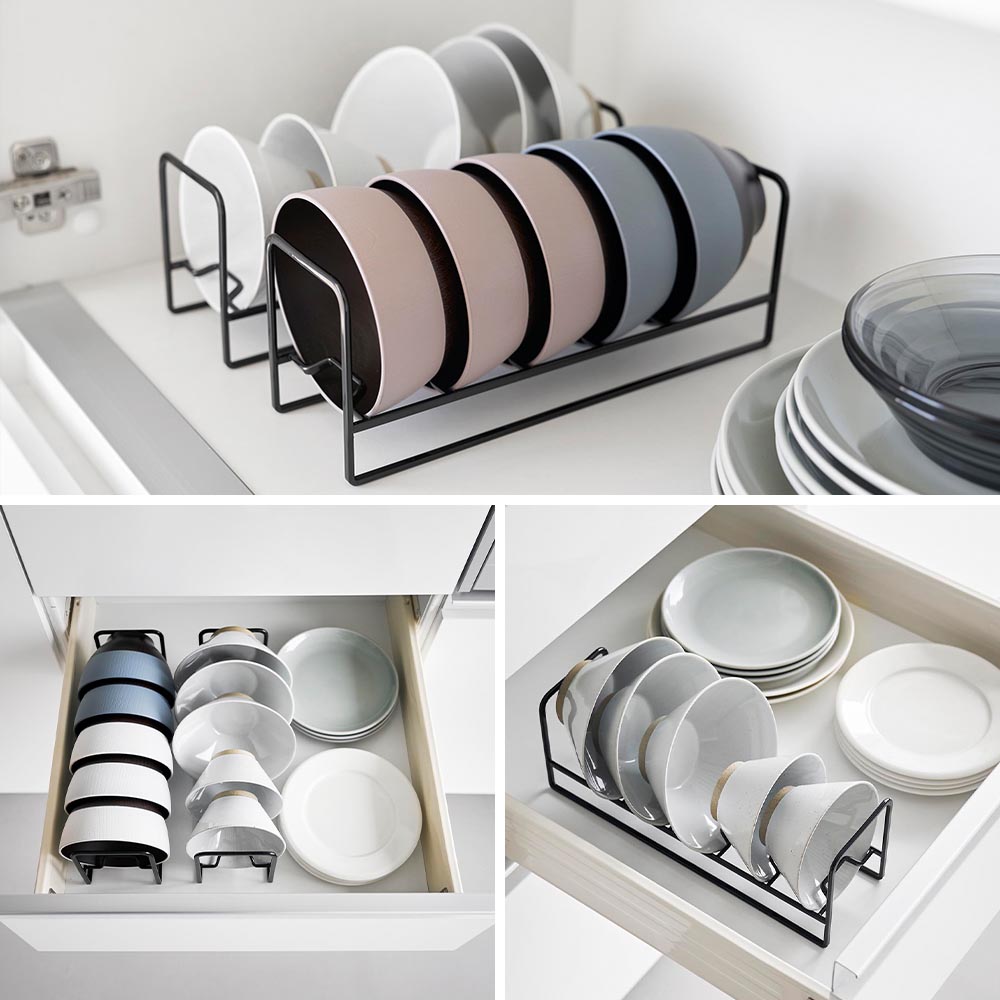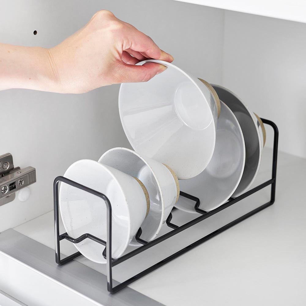 深さのある汁椀やお茶碗などを最大5個までスリムに立てて整頓できます。ひとつずつ仕切りに引っ掛けて並べられるため、真ん中のお椀もスムーズに出し入れできます。