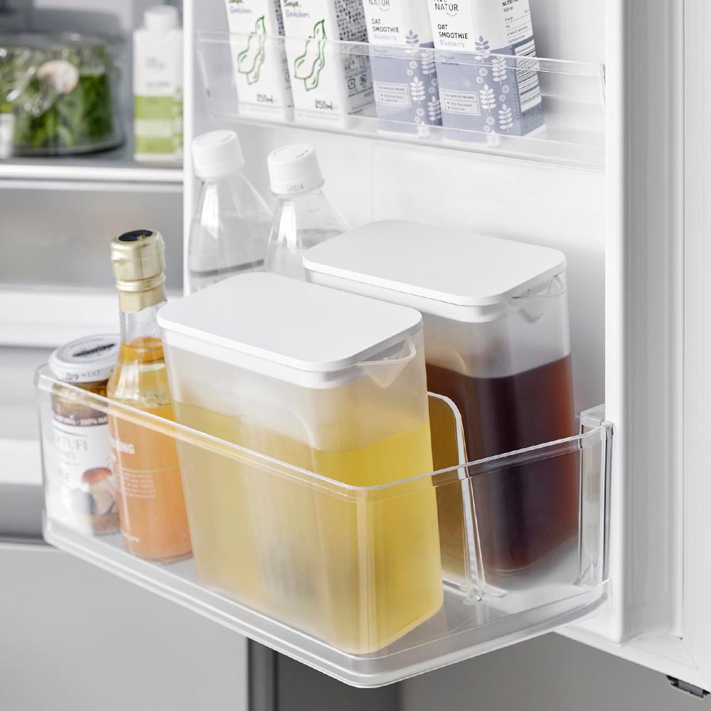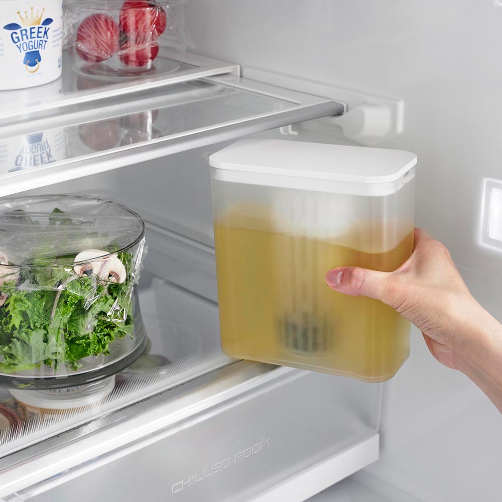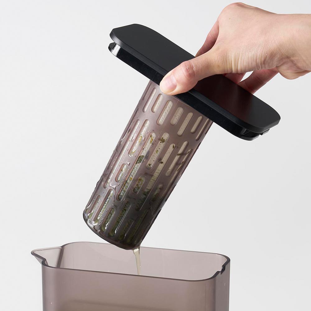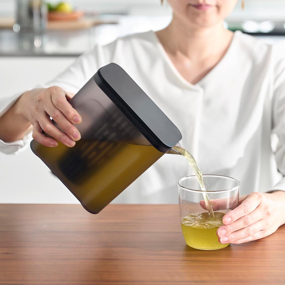 冷蔵庫の棚とドアポケットの両方に収まるコンパクトな冷水筒です。茶葉をそのまま入れられるメッシュタイプのフィルター付き。茶葉を入れたフィルターを蓋に取り付けるだけで簡単に使えます。フィルターが底まで届くので少量の水でも抽出が可能。お好みの濃さになったら、蓋を引き上げて容器の縁に掛けておくと、最後の一滴まで注ぎきることができます。お茶だけでなく、お出汁を水出しする際にも便利です。