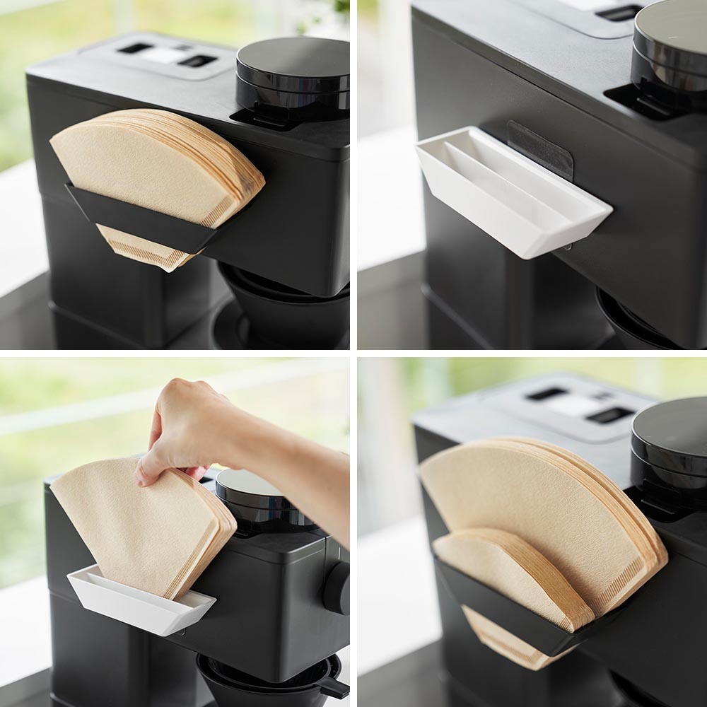 コーヒーメーカーに簡単設置 コーヒーメーカーに直接取り付けられる、コーヒーペーパーフィルターストッカー。コーヒーペーパーフィルターを取り出しやすい位置に簡単に取り付けできるフィルムフックタイプのホルダーです。収納部に底がない形状で、扇形と円すい形のフィルターに対応しており、用途に合わせた収納ができます。ペーパーフィルターのよれを防止する仕切り付きで、フィルターの枚数が少なくなっても使いやすいのが◎ 最大90枚まで収納可能です。キッチンパネルなどにも取り付けてお使いいただけます。 ![]() ![]() ![]() ![]() ![]() ![]() ![]() ![]() ![]() ![]() ![]() ![]() ![]() ![]() |