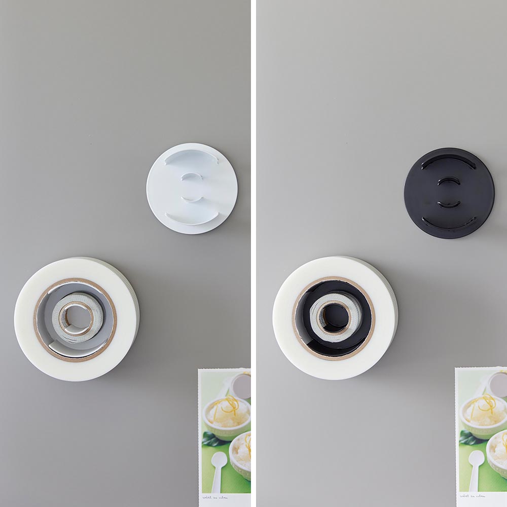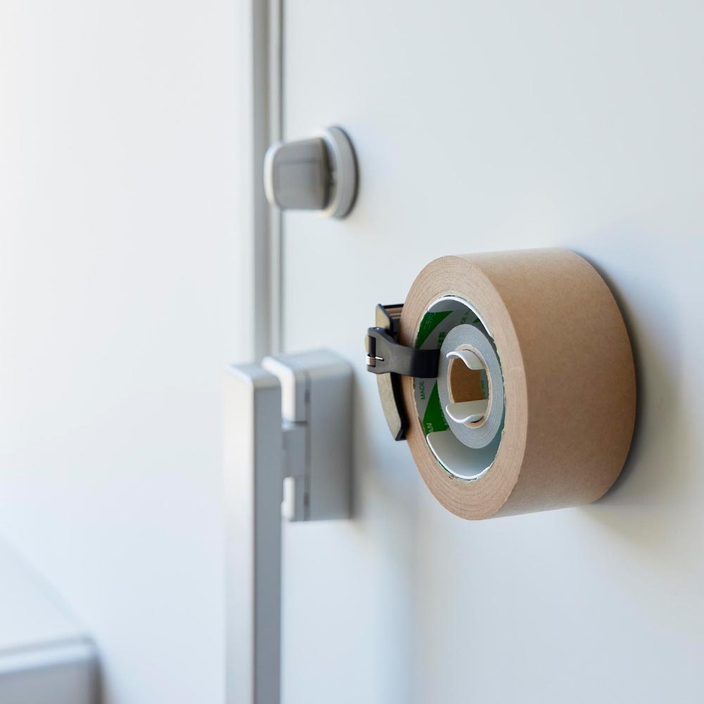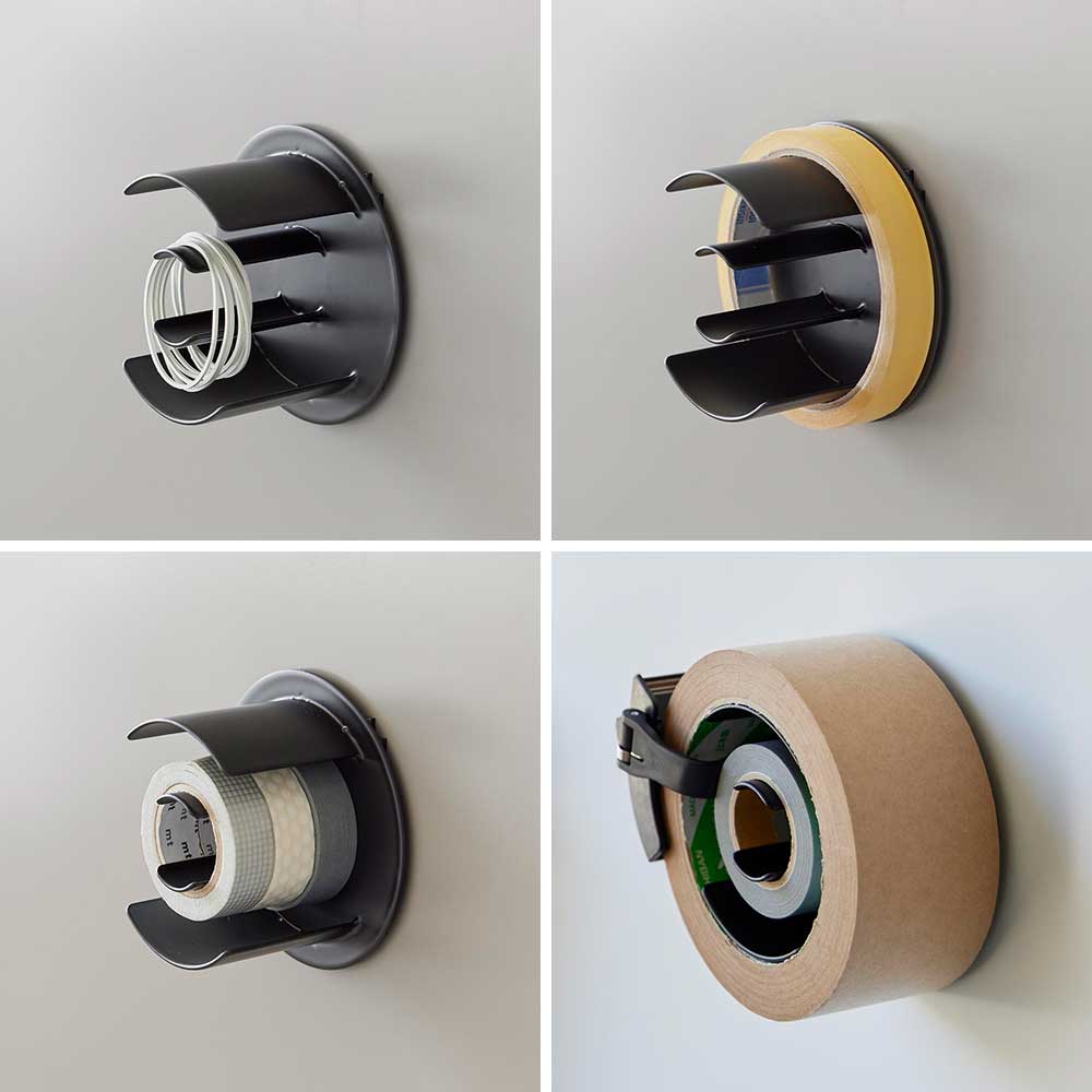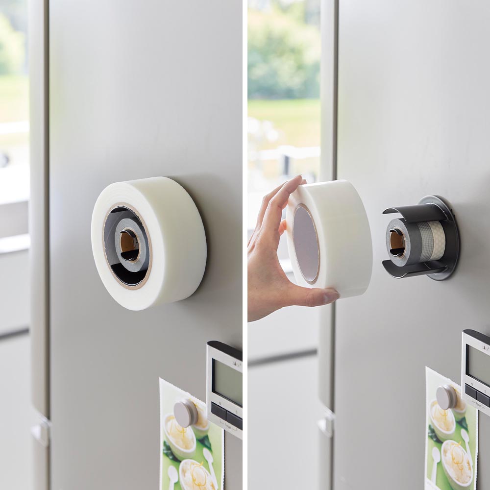玄関扉やガレージなどの作業場、冷蔵庫横など、テープ類をよく使う場所にマグネットで設置できるテープホルダーです。