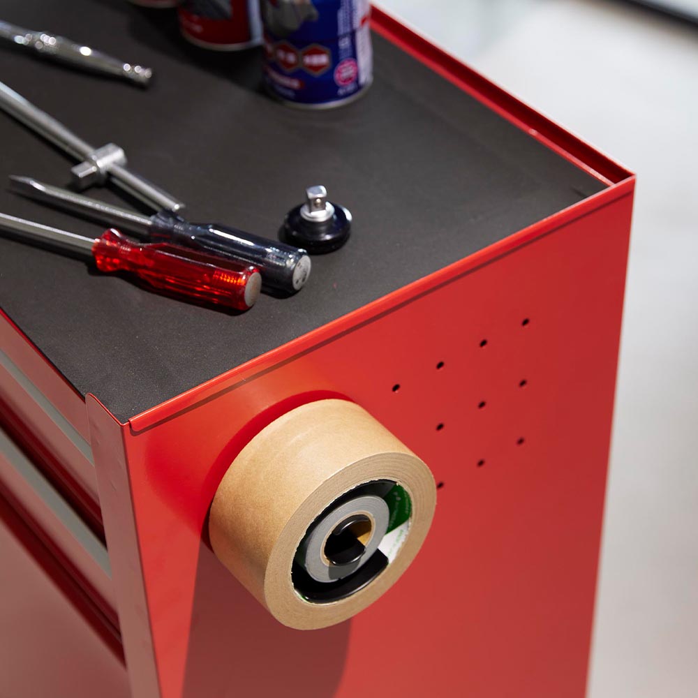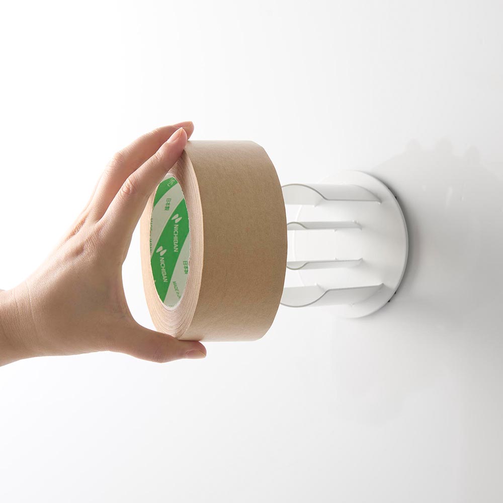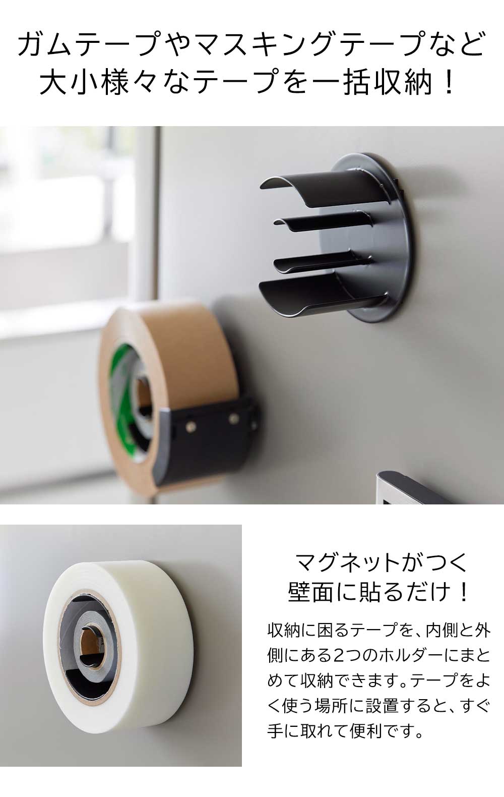 玄関扉やガレージなどの作業場、冷蔵庫横など、テープ類をよく使う場所にマグネットで設置できるテープホルダーです。