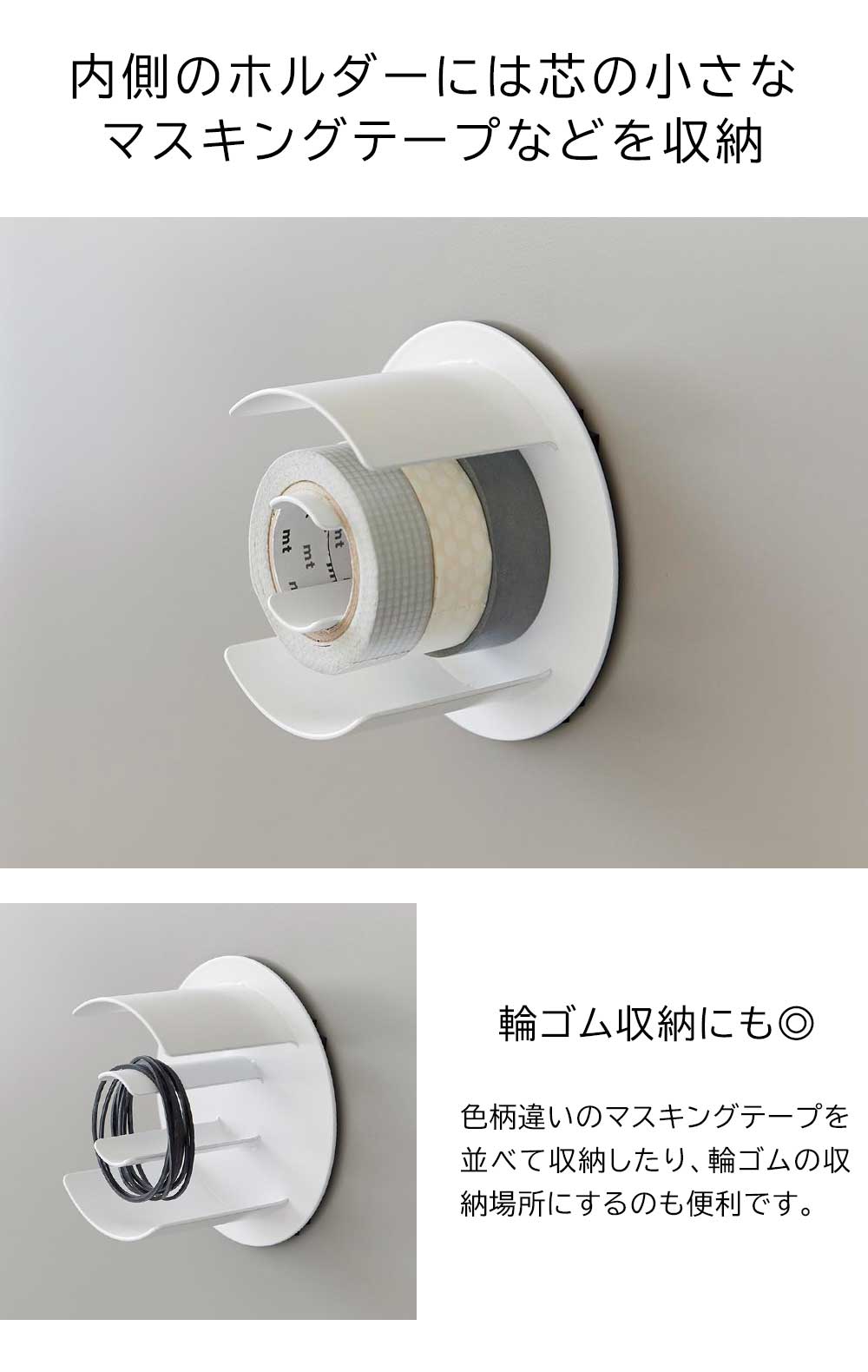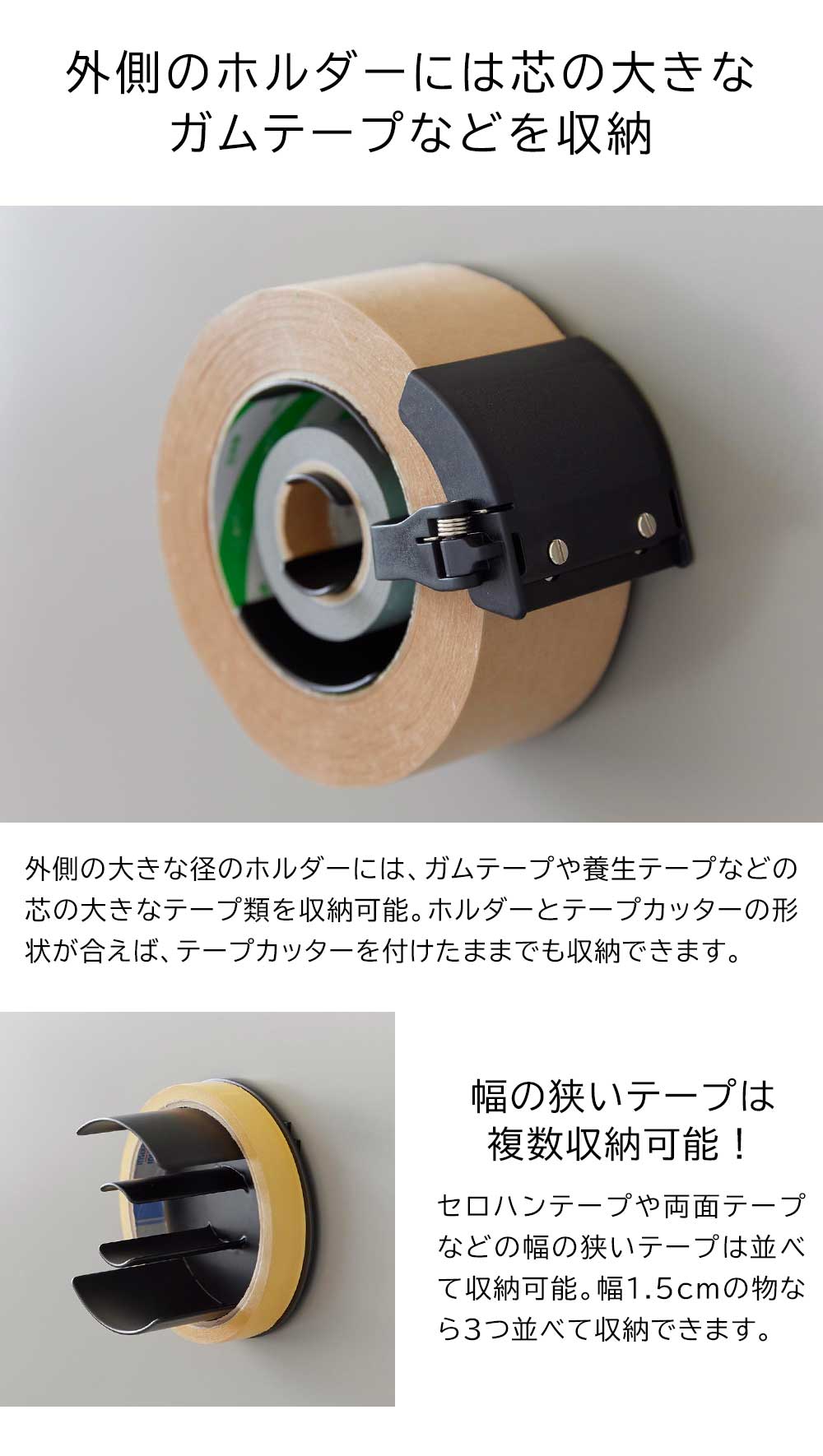ガムテープやセロハンテープ、マスキングテープなどの大小様々なテープ類を、内側と外側の2つのホルダーにまとめて収納できます。外側の大きなホルダーにはガムテープや養生テープなどの芯の大きなテープを、内側の小さなホルダーにはマスキングテープなどの芯の小さなテープや輪ゴムなどを収納できます。