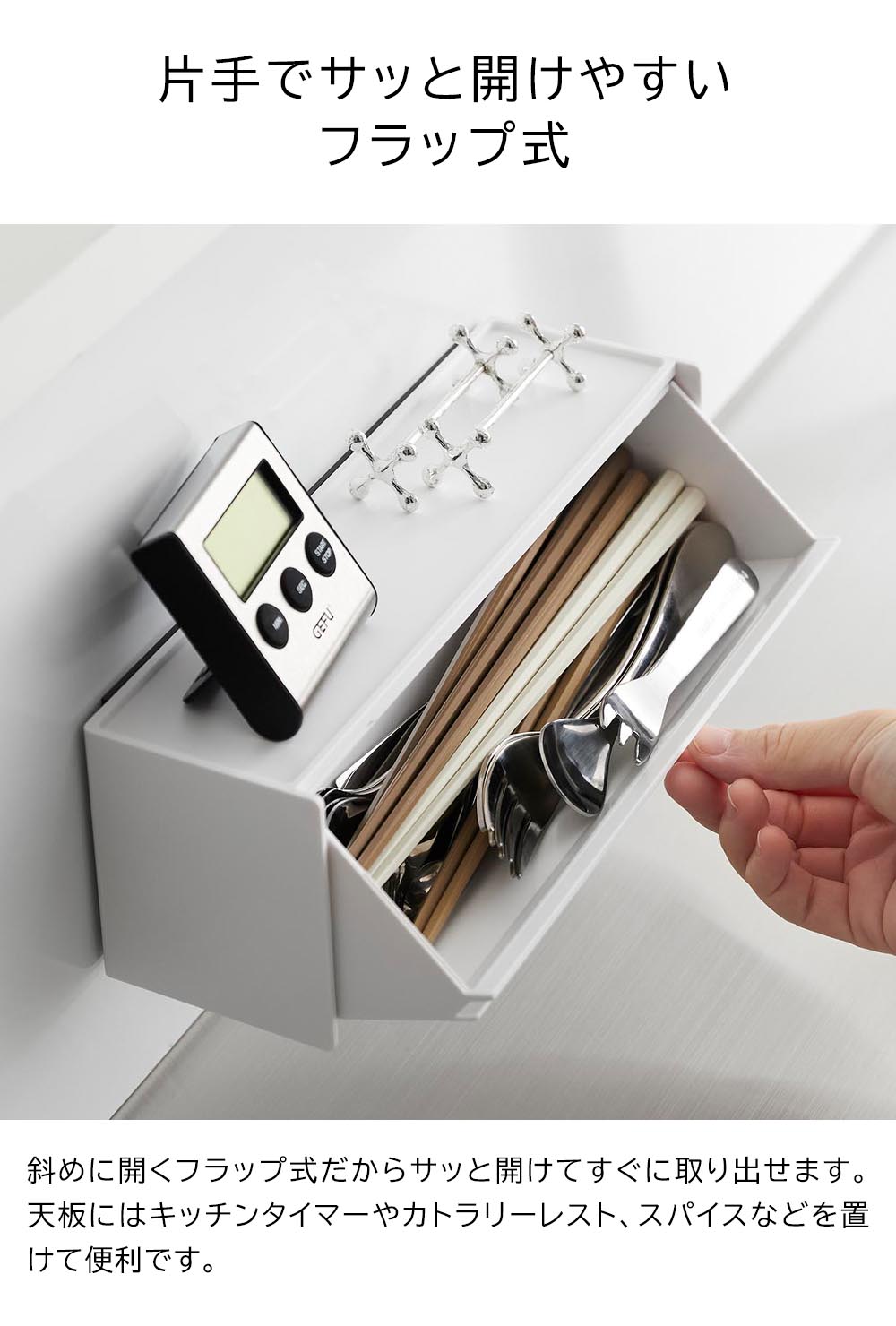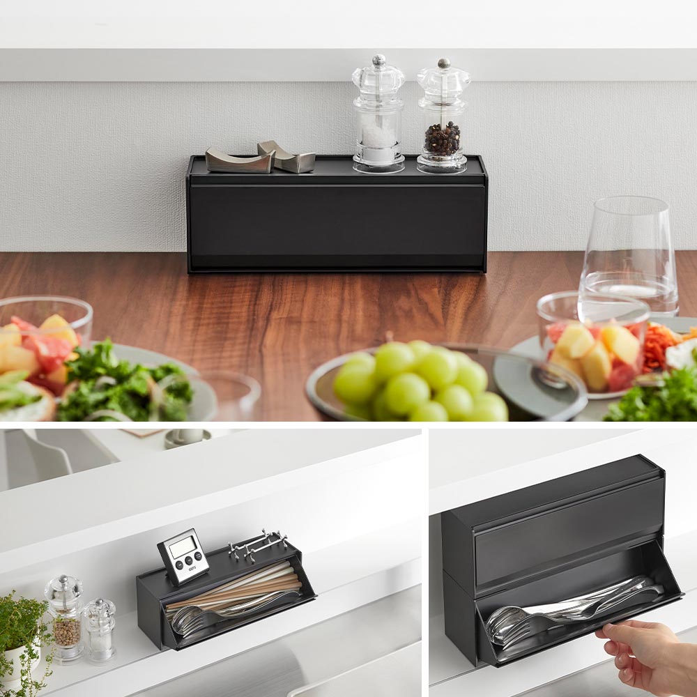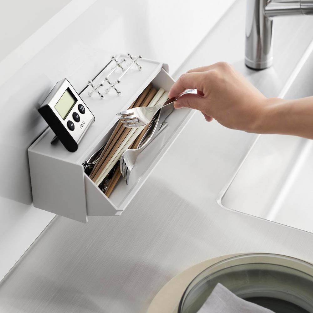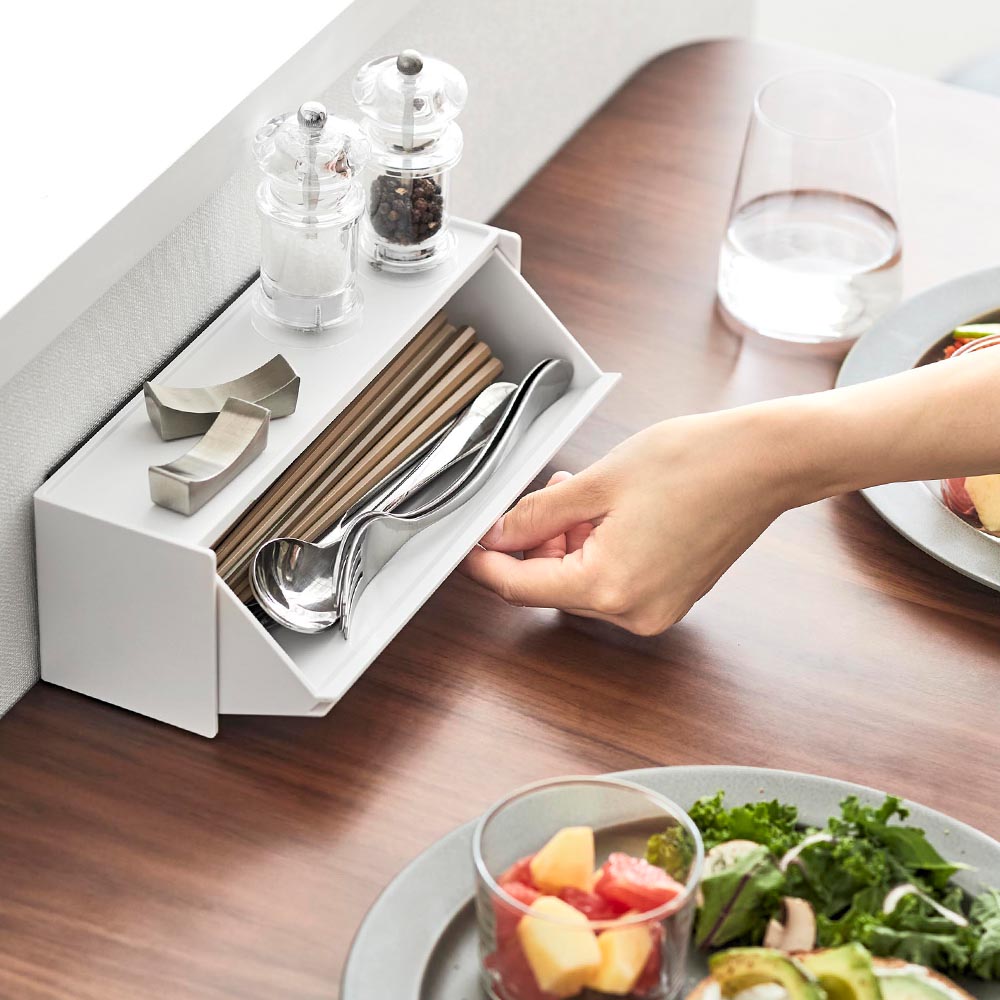 斜めに開くフラップ式だから、中のカトラリーを片手でラクに取り出せます。使わない時は閉まっているので、埃やゴミが中に入ることもなく衛生的です。