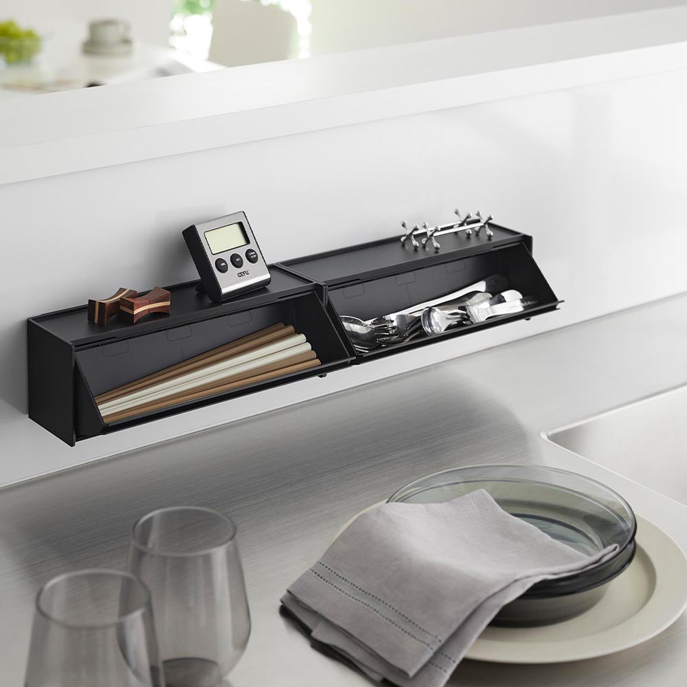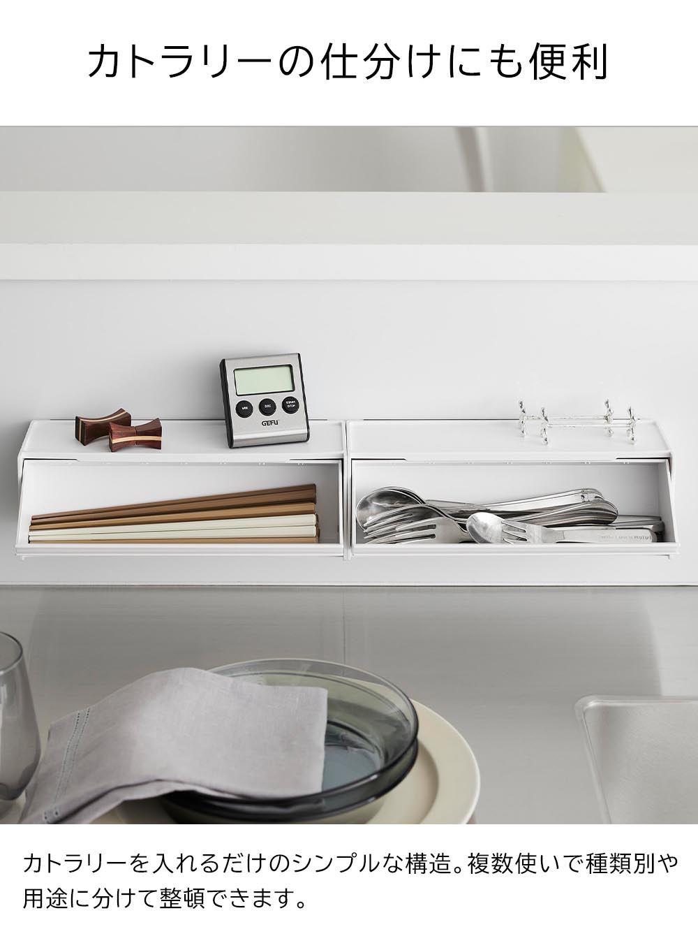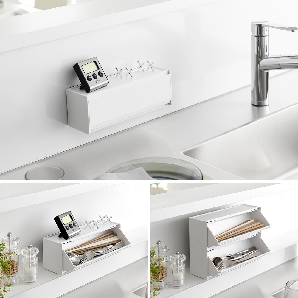 斜めに開くフラップ式だから、中のカトラリーを片手でラクに取り出せます。使わない時は閉まっているので、埃やゴミが中に入ることもなく衛生的です。