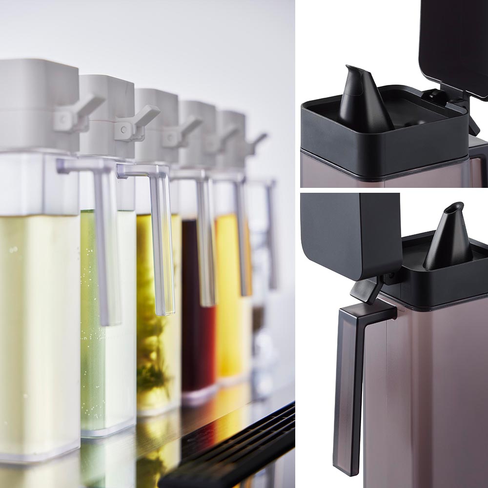 使用時の動作もスムーズでラクラク!取っ手を持ち、蓋に付いた開閉つまみを親指で押すだけで蓋が開き、そのままボトルを傾ければ調味料が流れ出てきます。