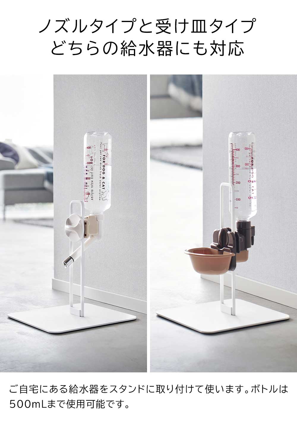 500mLまでのボトルが設置でき、ノズルタイプと受け皿タイプ、どちらの給水器にもお使いいただけます。