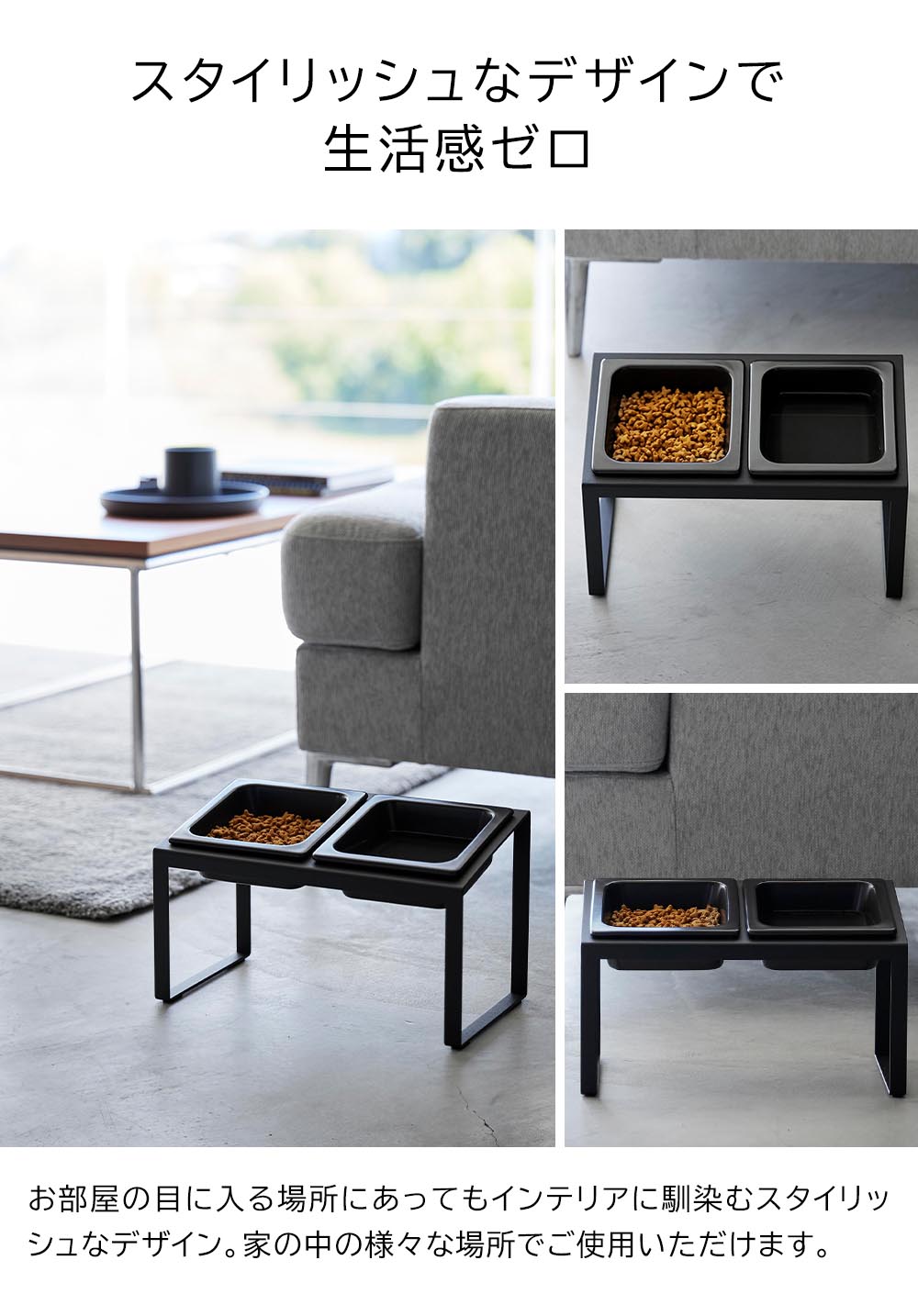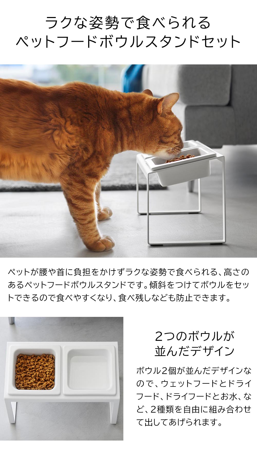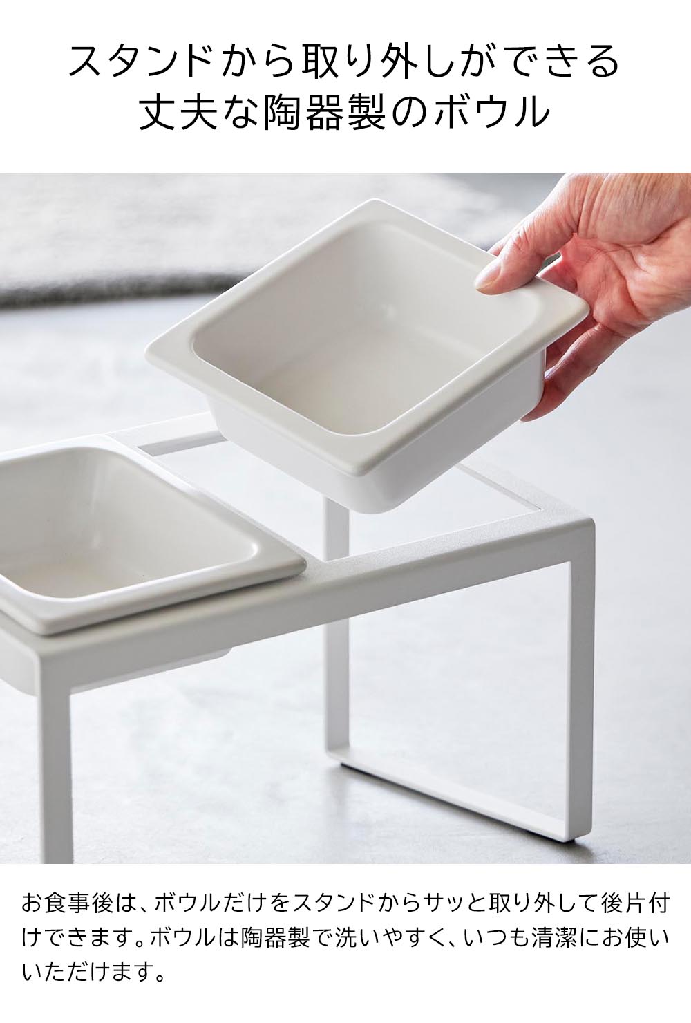 ボウルの位置が高く ペットが頭を下げずに食べられる、高さのあるペットフードボウルスタンドです。 ボウルが2個並んだデザインで、ウェットフードとドライフード、ドライフードとお水、など、2種類を並べてセットできます。 丈夫で洗いやすい陶器製のボウルは、傾斜をつけてスタンドにセットでき、腰や首に負担をかけず、ラクな姿勢で食べられます。食べやすくなるので、食べ残しなども防止することができます。 お食事後は、ボウルだけをスタンドからサッと取り外して洗えるので、後片付けもラクラクです。 お部屋の目に入る場所にあってもインテリアに馴染むスタイリッシュなデザインで、家の中の様々な場所でご使用いただけます。 ![]() ![]() ![]() ![]() ![]() ![]() ![]() ![]() ![]() ![]() ![]() |