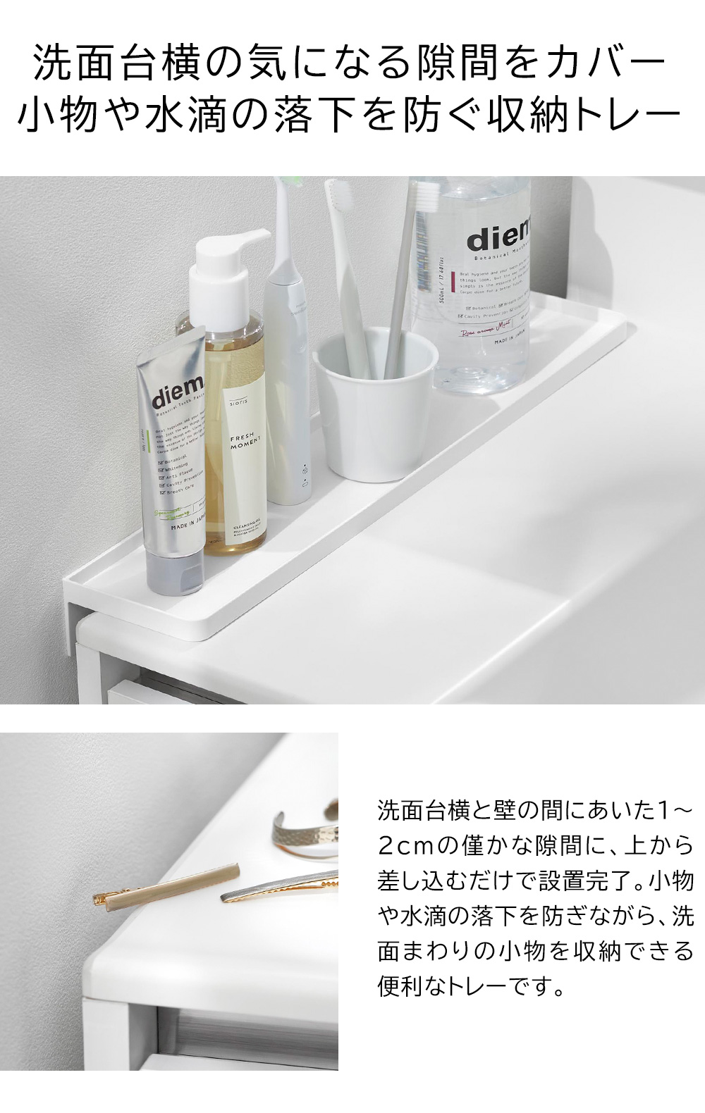洗面台横の隙間をカバーして 洗面台と壁の間にあいた1~2cmの僅かな隙間に、上から差し込むだけで設置できる隙間収納トレーです。ヘアピンなどの小物や水滴の落下を防ぎながら、洗面まわりの小物をスッキリと収納できます。洗顔や手洗いの際のスマートフォンやアクセサリーの一時置きにも便利です。トレーは奥行き44cmのロングサイズで、洗面台の奥までしっかりとカバーします。また、シリコーン製のストッパーつきで洗面台との接触面を傷つけず、柔らかくしなって隙間にしっかりとフィット。4か所についているので安定してトレーを設置できます。 ![]() ![]() ![]() ![]() ![]() ![]() ![]() ![]() ![]() ![]() ![]() |