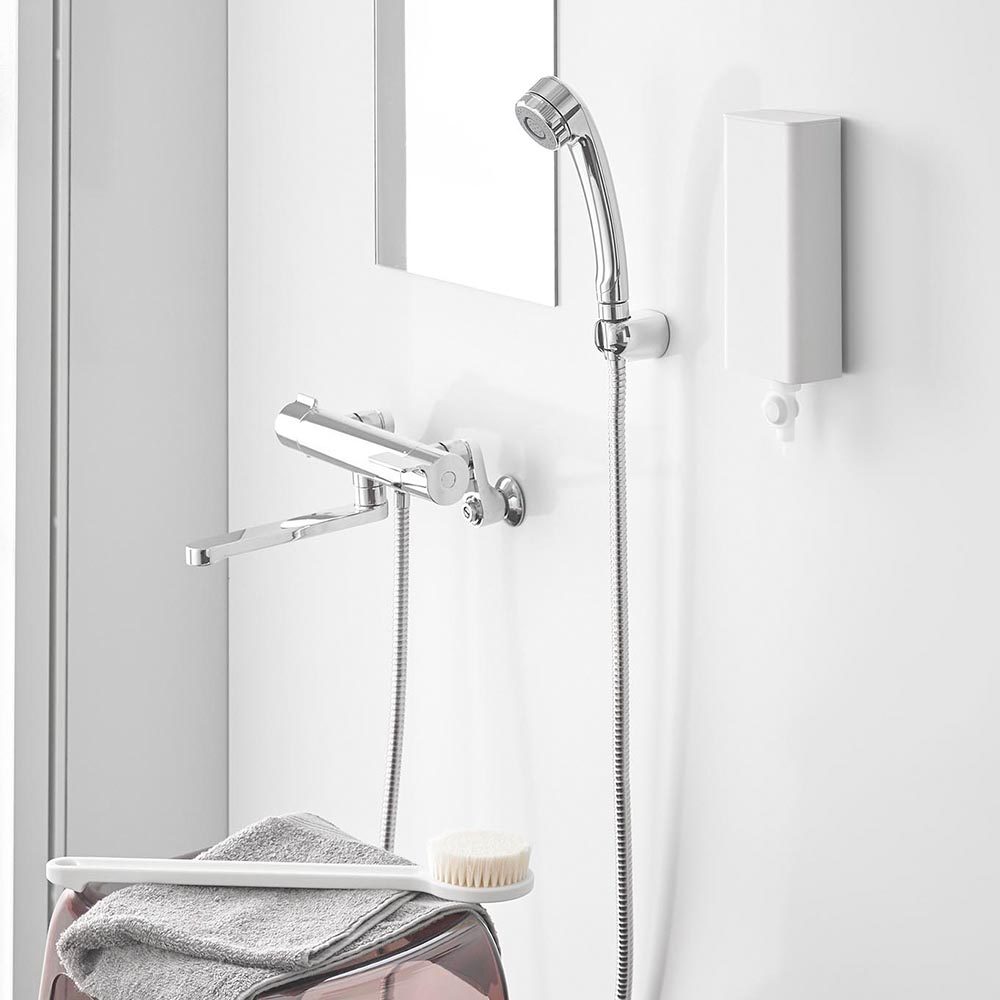 シンプルなデザインのホルダーでパウチのパッケージが目隠しされ、浴室がスタイリッシュな空間に大変身!