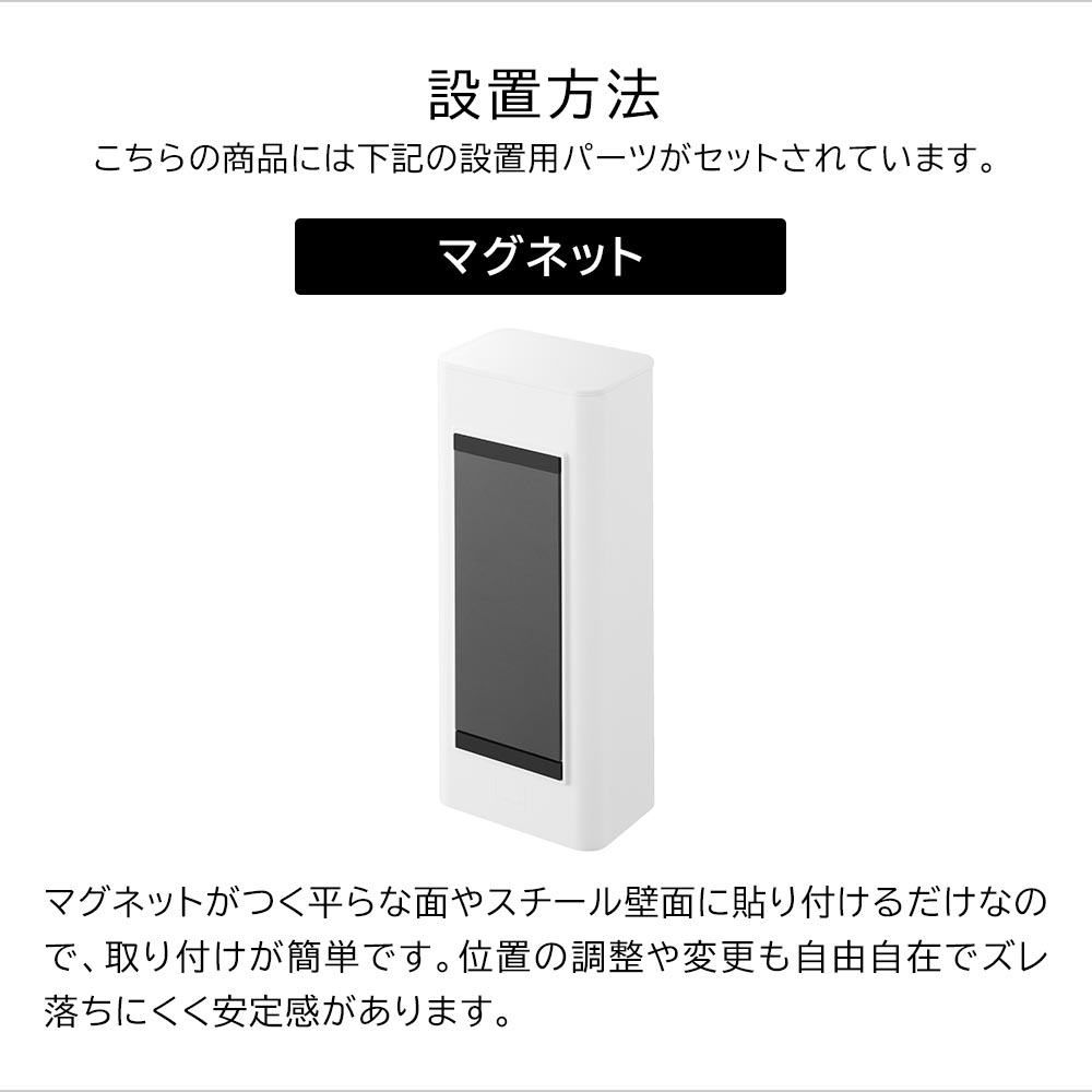 収納ホルダーをマグネットで浴室壁のお好みの位置に貼り付けた後、上蓋を外し、そのまま中に入れるだけでセット完了!S字フックや引っ掛けバーなどは必要ありません。