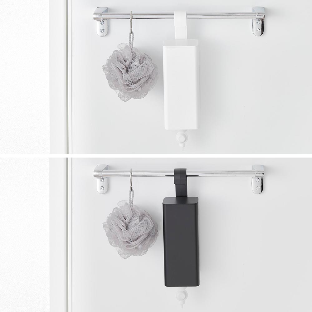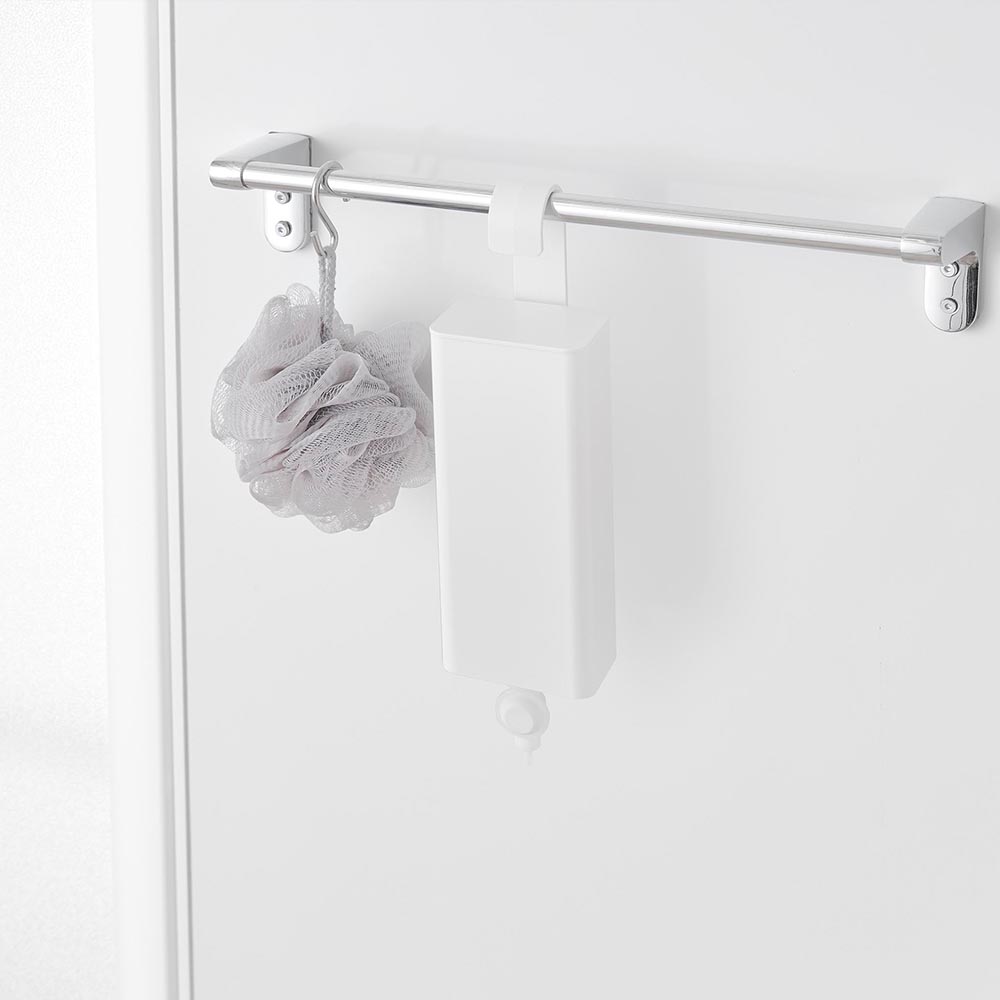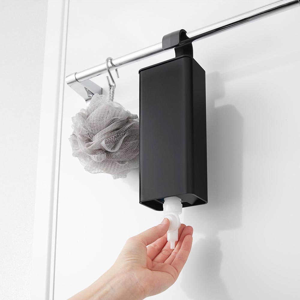 ランドリーパイプやタオルバーにぶら下げて使う、便利な詰め替えパウチディスペンサーを、丸ごと目隠しして生活感を一掃できるカバー型の収納ホルダーです。