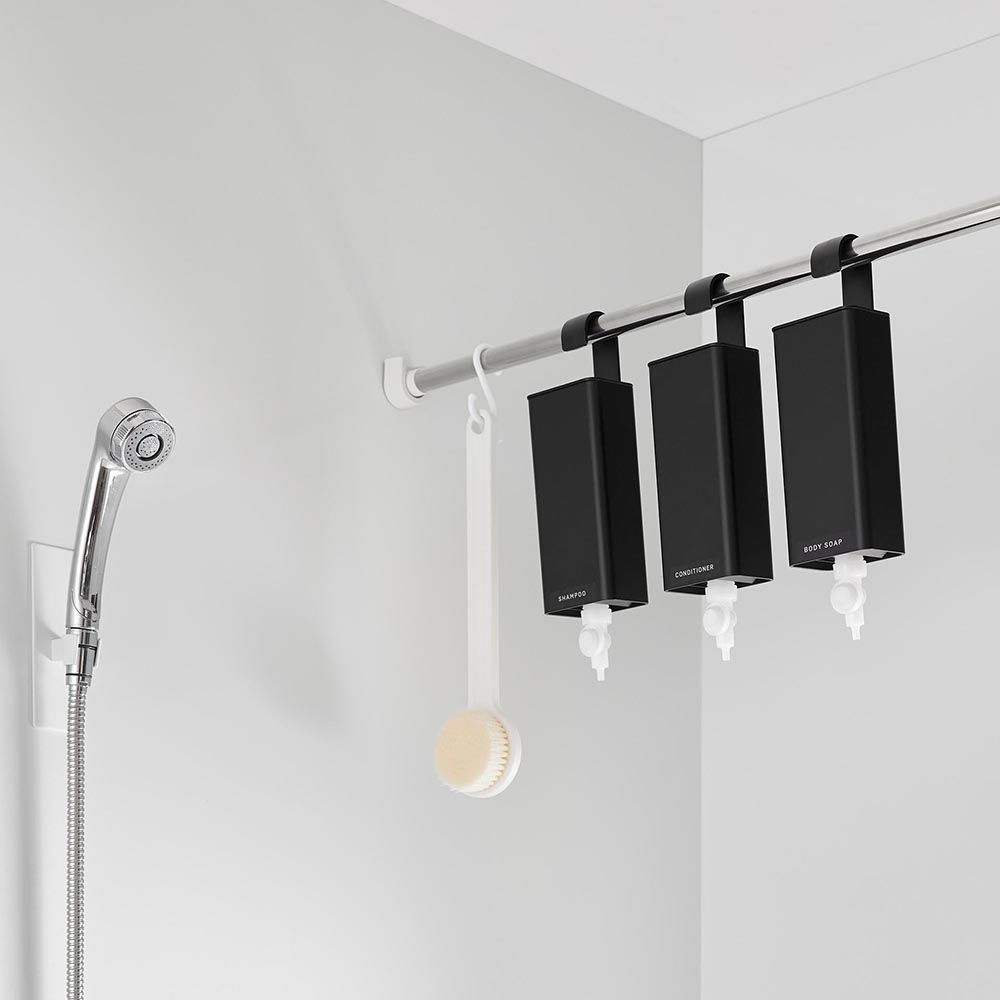 シンプルなデザインのホルダーでパウチのパッケージが目隠しされ、浴室がスタイリッシュな空間に大変身!