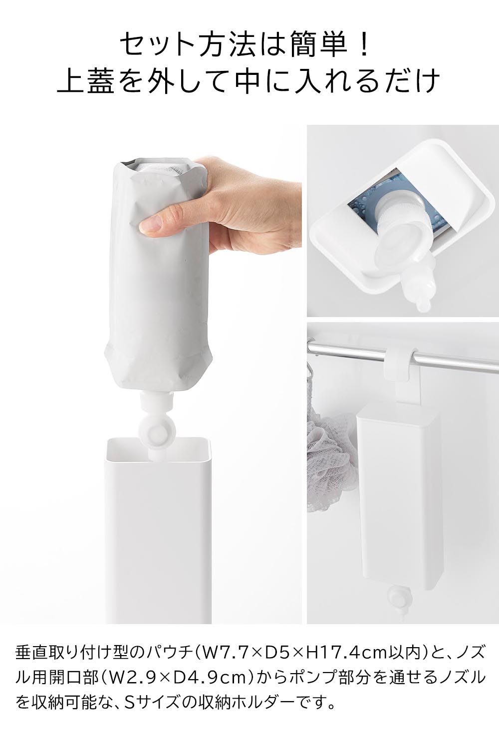 こちらは、垂直取り付けタイプのパウチ(幅7.7×奥行5×高さ17.4cm以内)と、ノズル用開口部(幅2.9×奥行4.9cm)からポンプ部分を通せるノズルを収納できる、Sサイズのホルダーです。