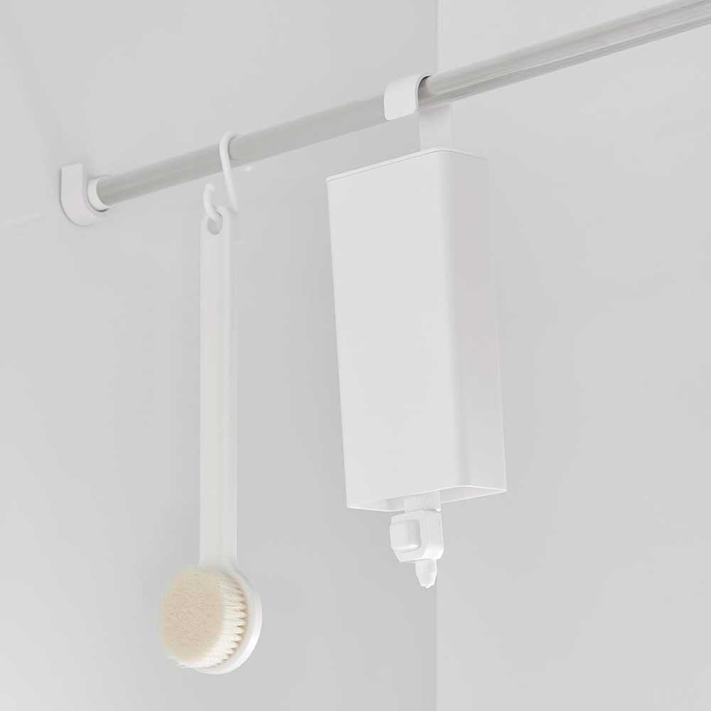 シンプルなデザインのホルダーでパウチのパッケージが目隠しされ、浴室がスタイリッシュな空間に大変身!