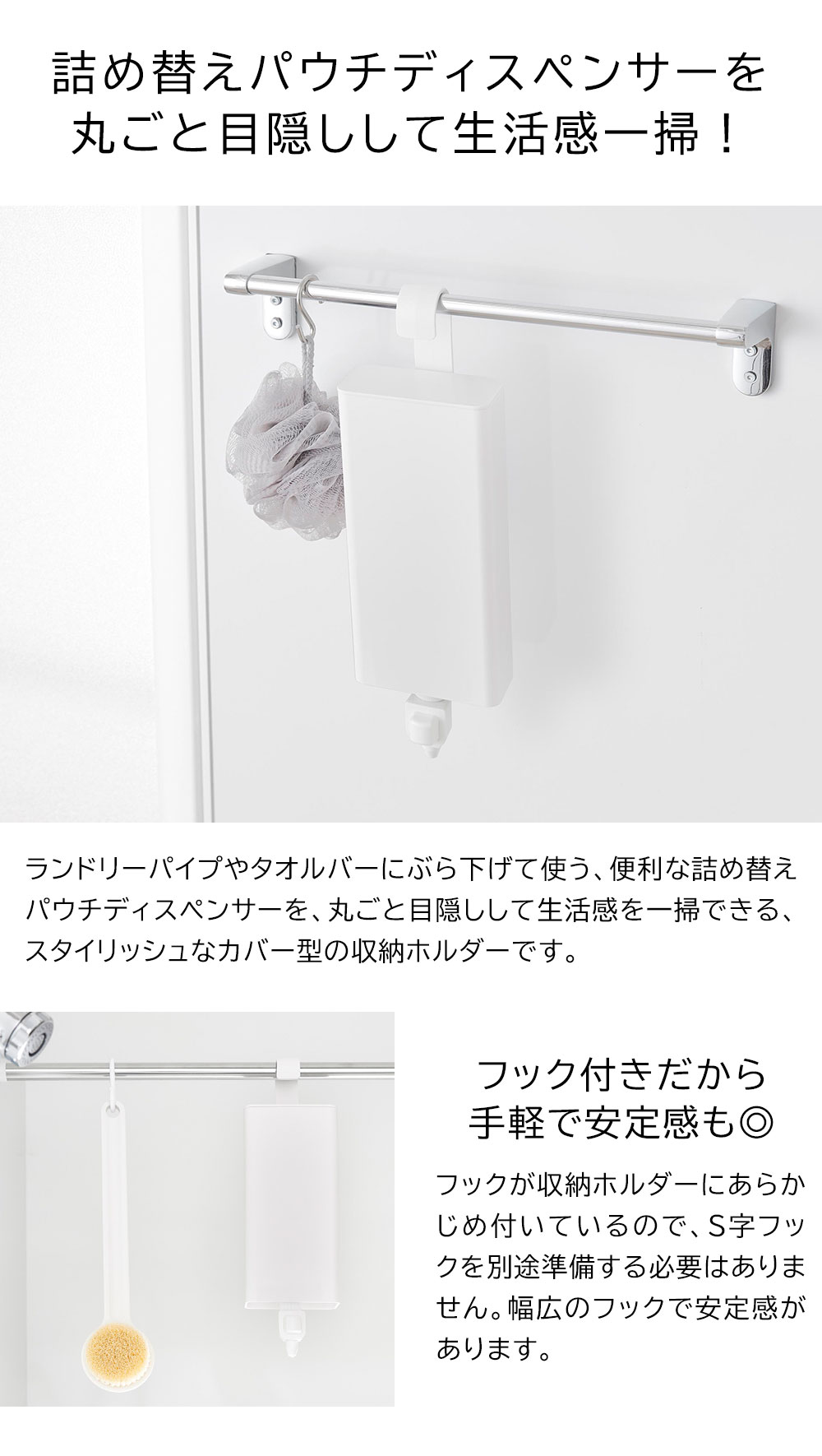 ランドリーパイプやタオルバーにぶら下げて使う、便利な詰め替えパウチディスペンサーを、丸ごと目隠しして生活感を一掃できるカバー型の収納ホルダーです。