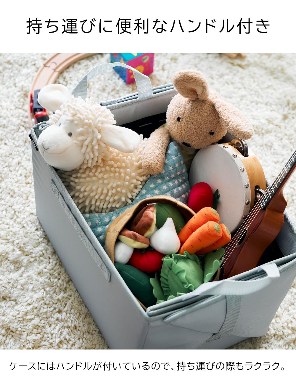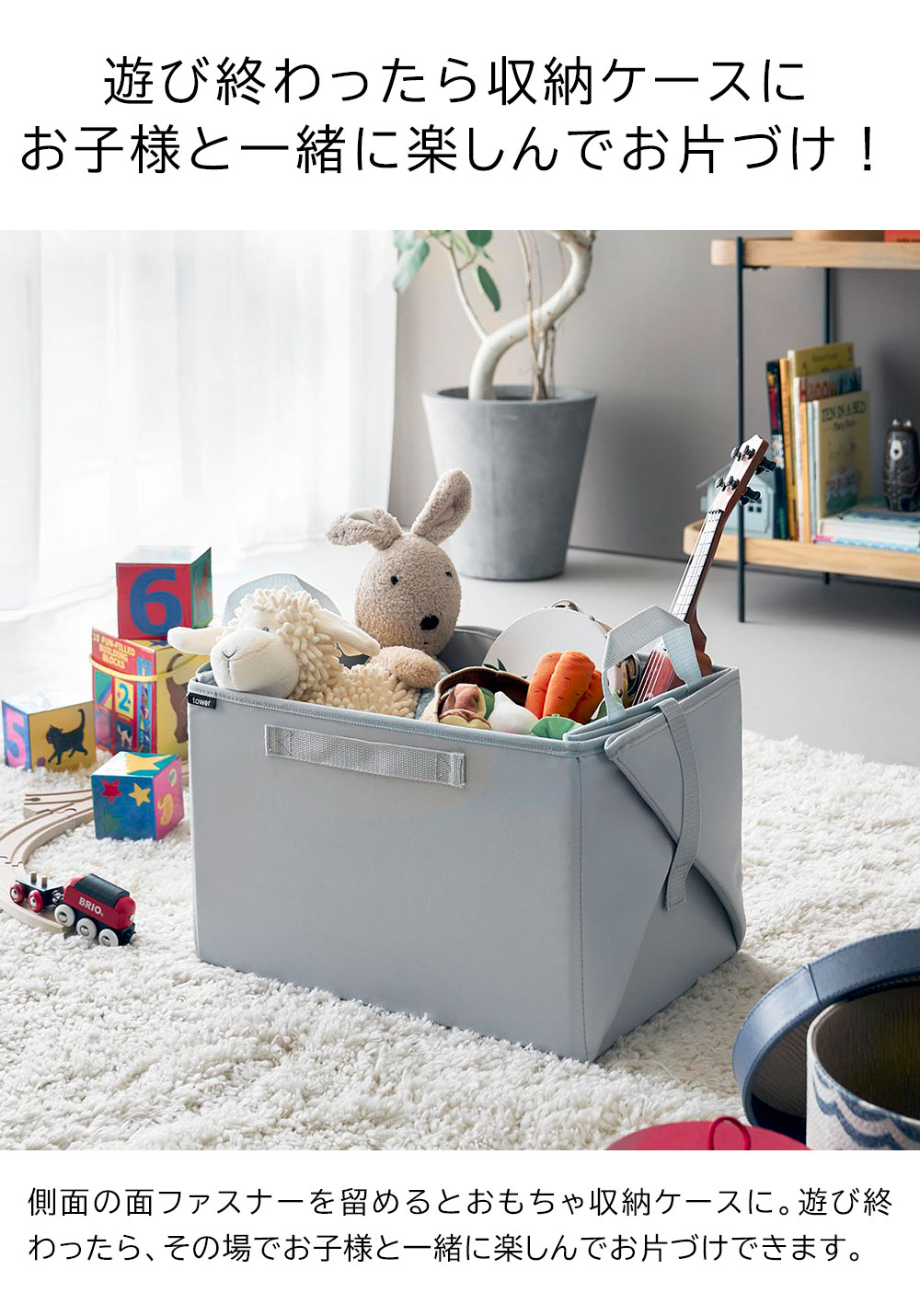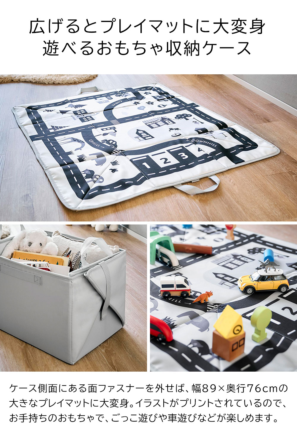 広げるとプレイマットとして遊べるおもちゃ収納ケースです。ケース側面の面ファスナーを外すだけで、大きなプレイマットになります。マットにはイラストがプリントされており、お手持ちのおもちゃでごっこ遊びや車遊びが楽しめます。面ファスナーを止めるとおもちゃ収納ケースに。遊んだ後もお子様と一緒に楽しんでお片づけできます。ハンドルが付いているので持ち運びに便利。カラーボックスにピッタリ収まるサイズで、おもちゃのゴチャゴチャを隠してスッキリと収納できます。