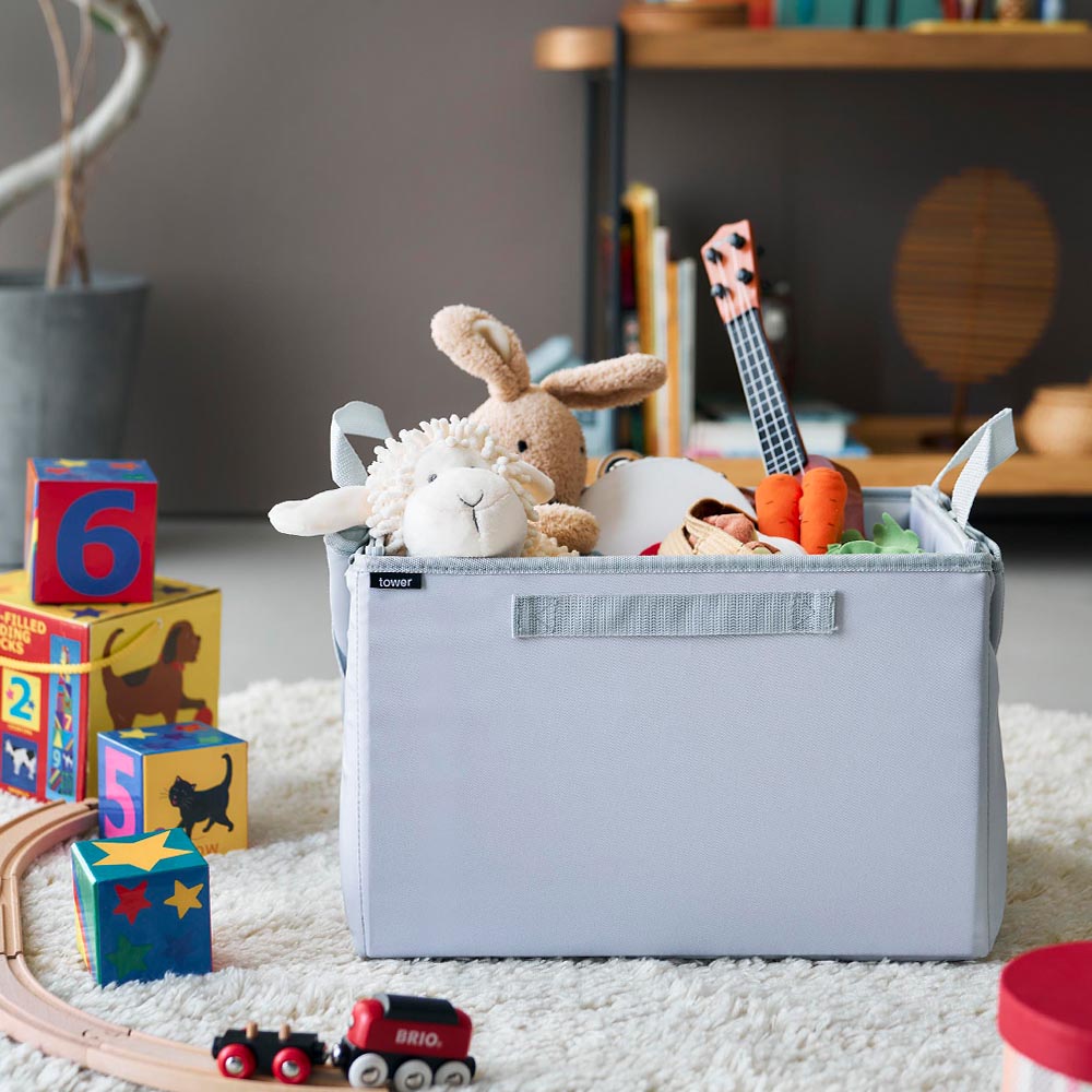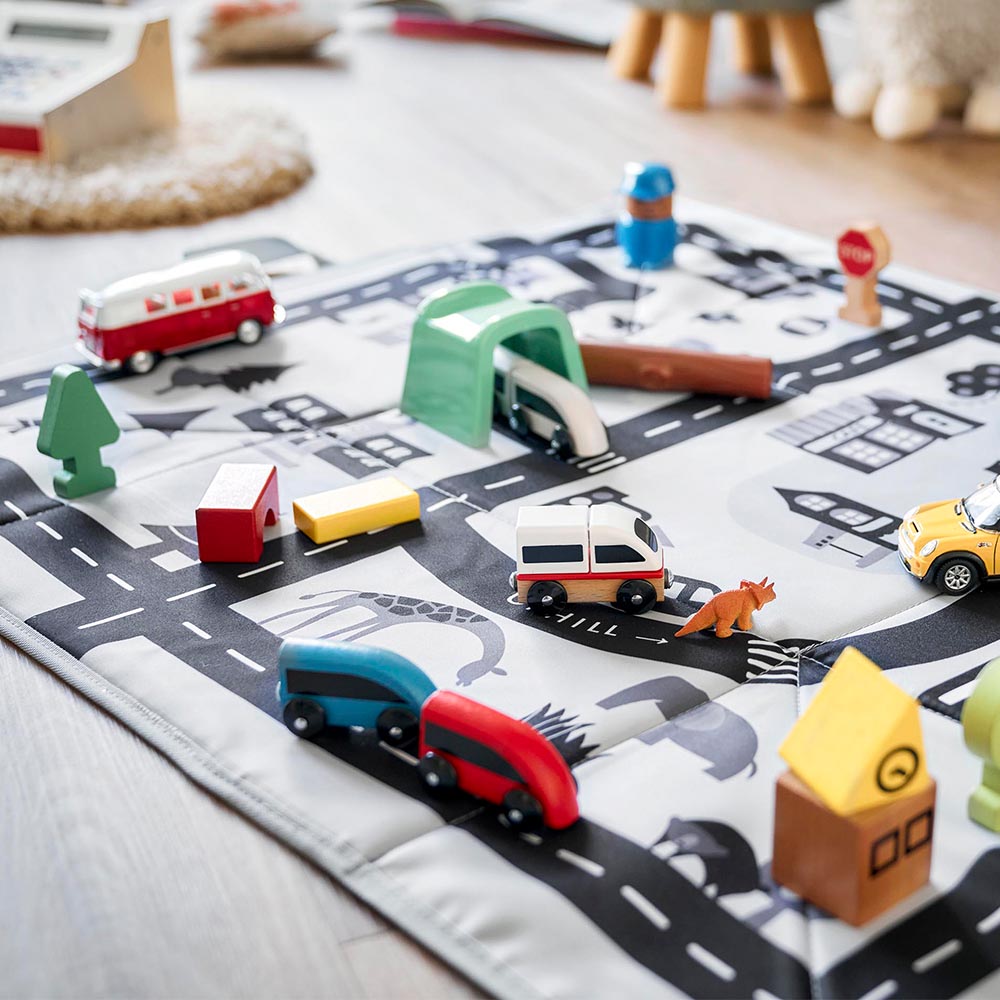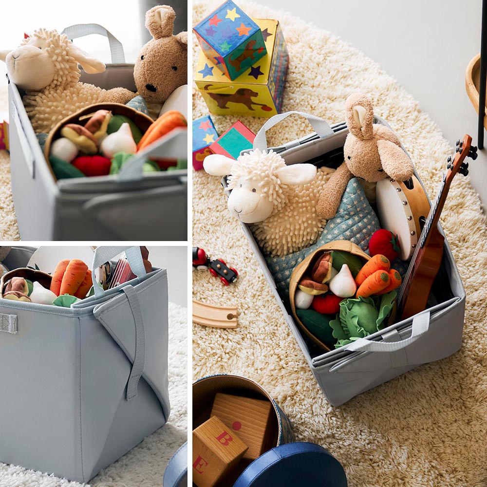 広げるとプレイマットとして遊べるおもちゃ収納ケースです。ケース側面の面ファスナーを外すだけで、大きなプレイマットになります。マットにはイラストがプリントされており、お手持ちのおもちゃでごっこ遊びや車遊びが楽しめます。面ファスナーを止めるとおもちゃ収納ケースに。遊んだ後もお子様と一緒に楽しんでお片づけできます。ハンドルが付いているので持ち運びに便利。カラーボックスにピッタリ収まるサイズで、おもちゃのゴチャゴチャを隠してスッキリと収納できます。