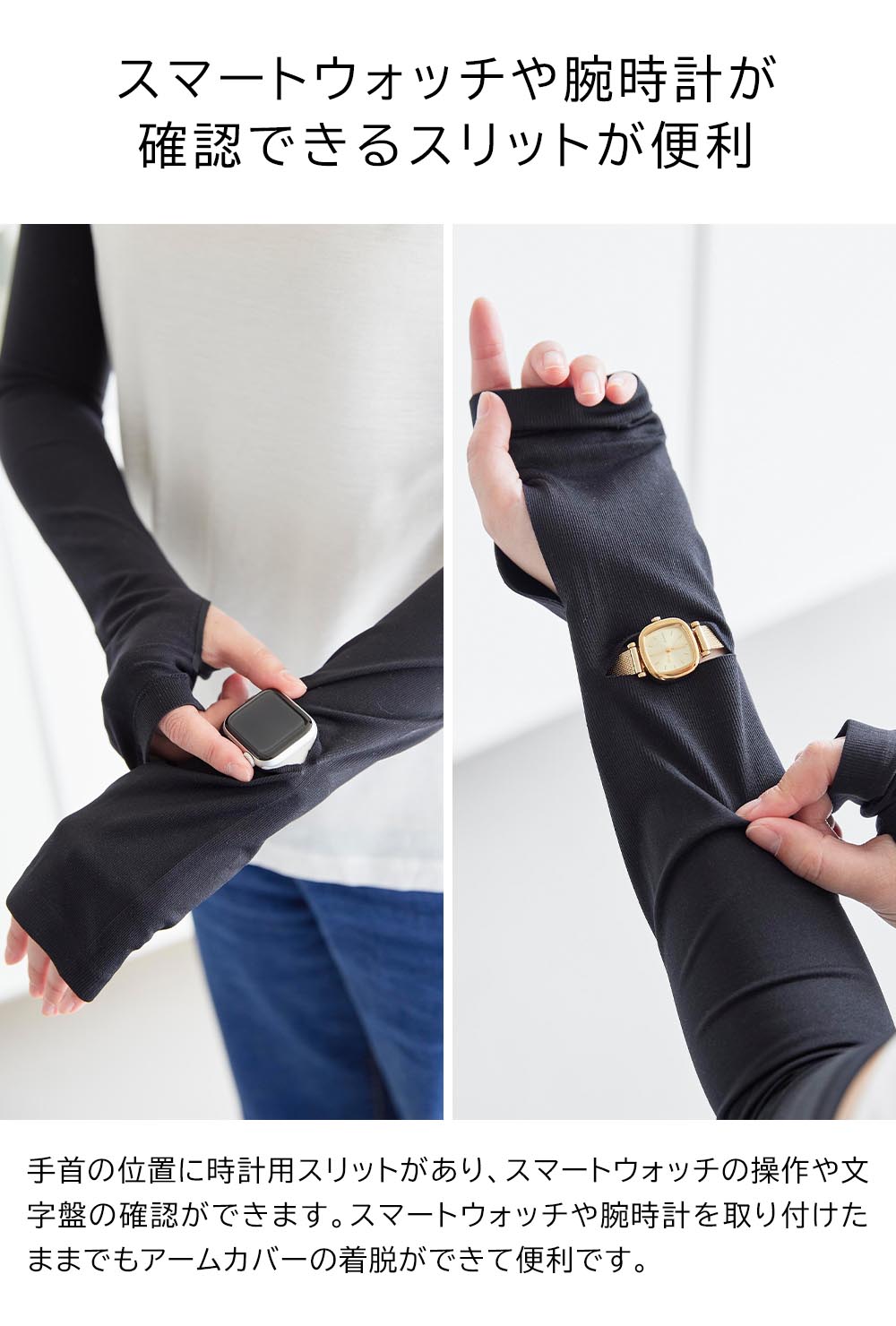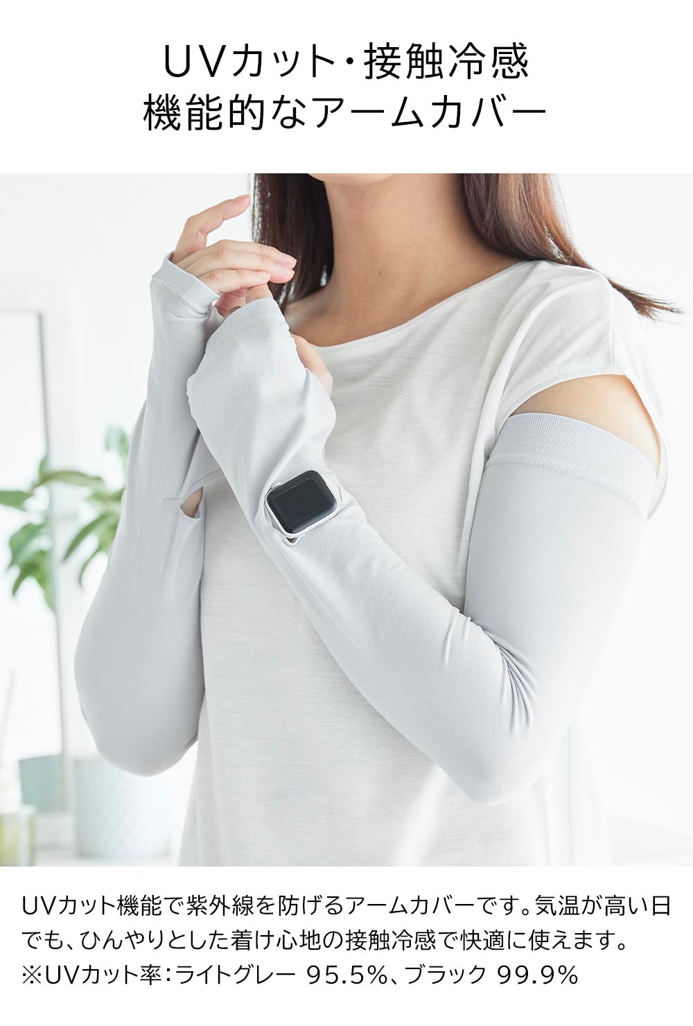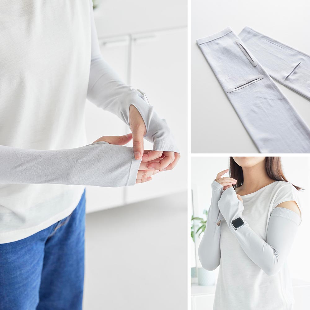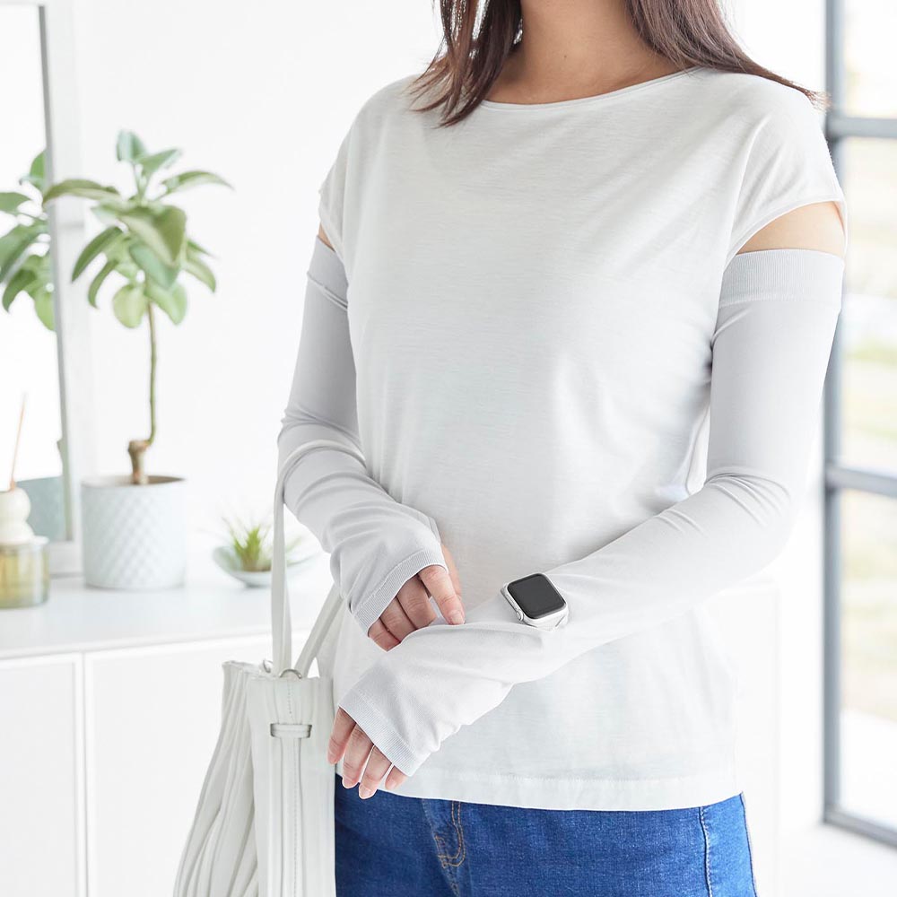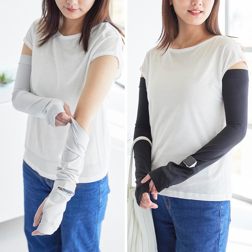 ロング丈で二の腕までガード 二の腕までしっかりと紫外線対策ができるロング丈のアームカバーです。 UPF50+取得済みで、しっかりと紫外線をカットできる素材で作られています。 肌に触れた時にひんやり冷たい接触冷感機能で、強い日差しでも快適な着け心地。 両面使えるリバーシブルタイプだから着脱の際に裏返す手間がなく、裏表を気に出ずそのまま着用できます。 スマートウォッチや腕時計を付けてから着用しても、画面や文字盤が見れる、時計用スリットが便利です。 汗などで汚れてもネットに入れて洗濯機でお手入れができます。 ![]() ![]() ![]() ![]() ![]() ![]() ![]() ![]() ![]() ![]() ![]() |
