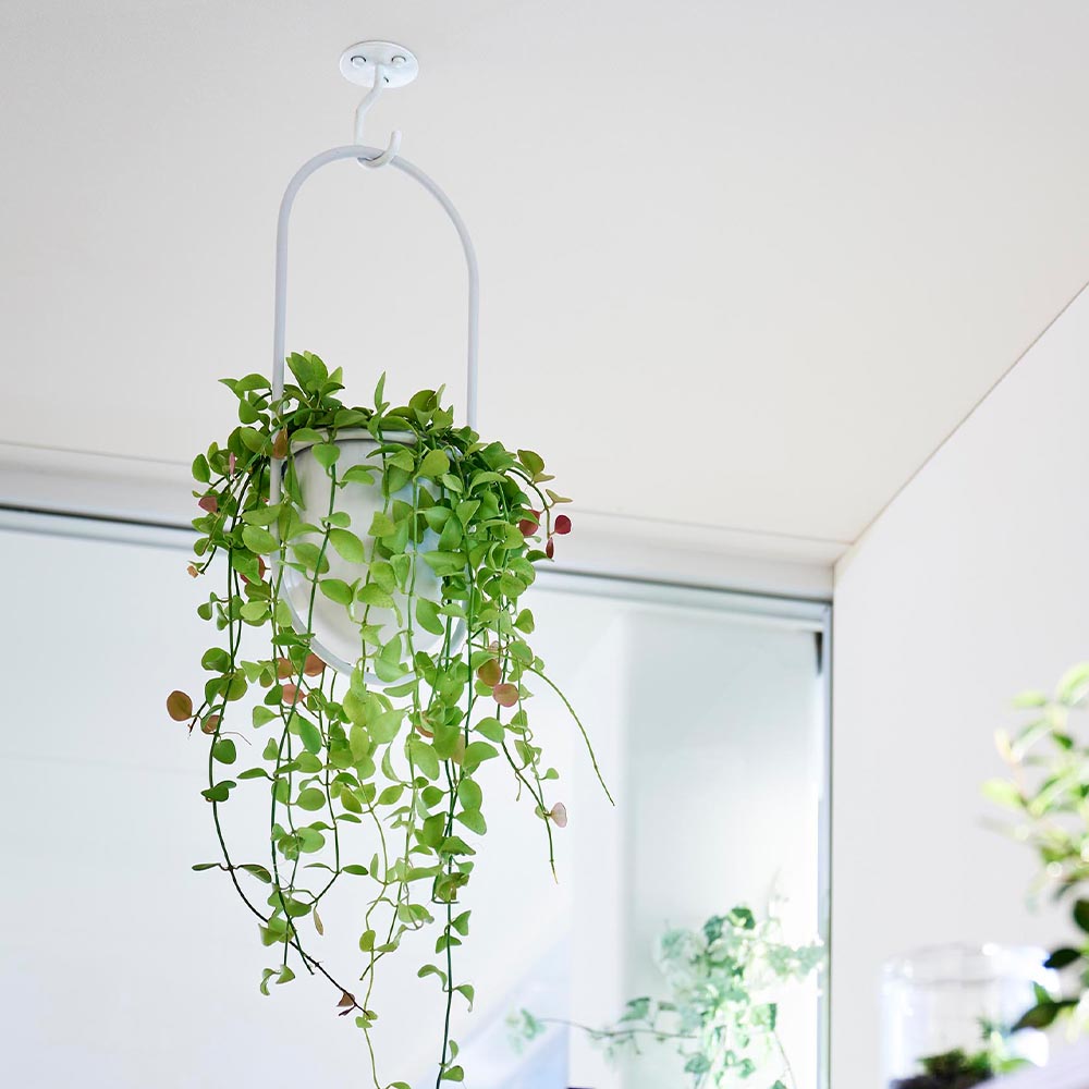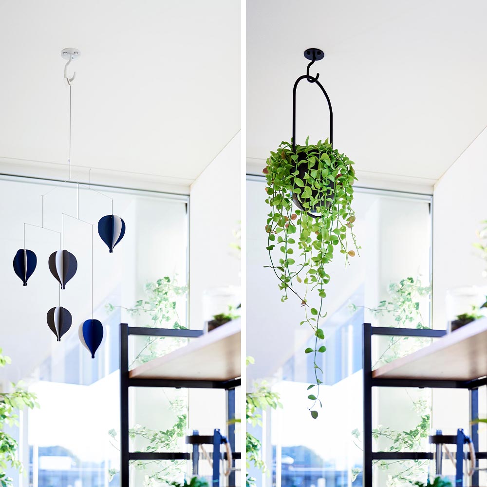 付属の石こうボードピンで天井に取り付けて、つる性植物やインテリアモビールなどを掛けられます。