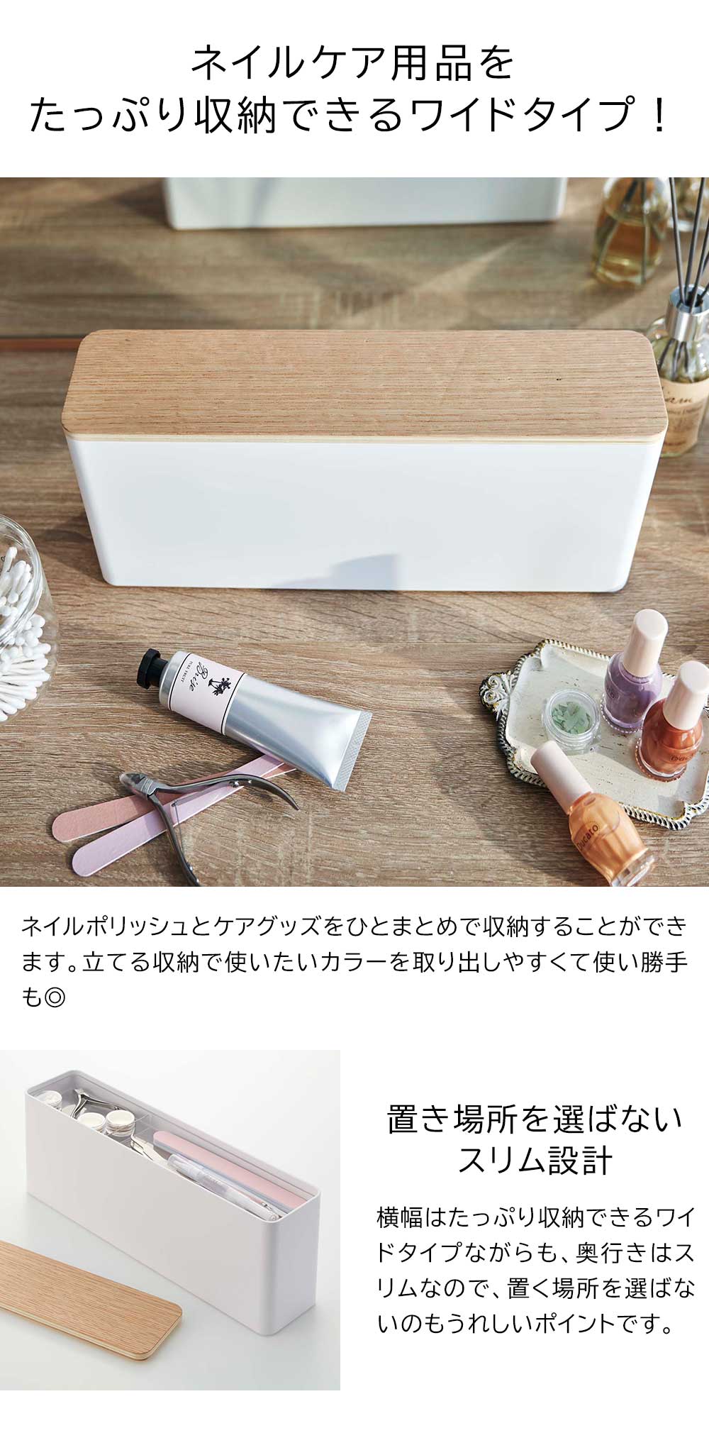 たくさんのネイルケア用品を たくさんのネイルポリッシュとケアグッズを一括で収納することができるネイル収納ケース。たっぷり収納できるワイドな横幅ながらも、奥行きはスリムなので置く場所を選びません。ケアグッズが収納できるトレーはケース本体に格納できるので、ポリッシュと分けて2層で収納可能です。シンプルな天然木の蓋がナチュラルな雰囲気で、インテリアにもよくなじみます。 ![]() ![]() ![]() ![]() ![]() ![]() ![]() ![]() |
