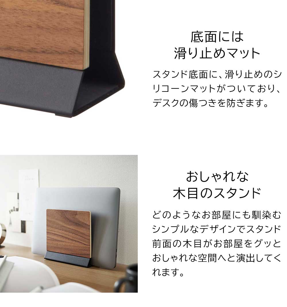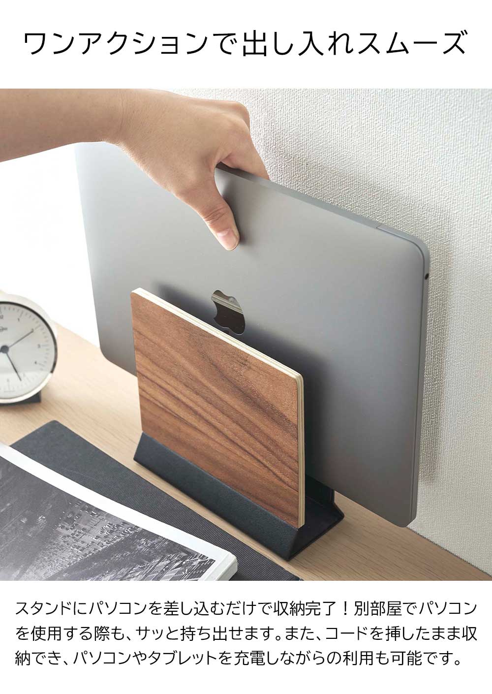 ノートパソコンを縦置き収納 ノートパソコンやタブレットを縦置き収納できるスタンド。ノートパソコンをスリムに収納し、書類や参考書を広げて仕事や勉強ができるので、デスク上を有効活用できます。パソコンの出し入れは抜き差しするだけなので、とても簡単。別部屋でノートパソコンを使用する時もサッと持ち出せ便利です。また、スタンド前面の木目が他のインテリアとマッチして、お部屋をグッとおしゃれな空間へと演出してくれるので、パソコンスタンドを出しっぱなしにしていても気になりません。パソコンやタブレットにコードを挿したままスタンドを利用できるので、充電しながらの収納が可能です。スタンド内側には緩衝材が、スタンド底面には滑り止めのシリコーンがついており、大切なパソコンやデスクに傷がつかないよう保護してくれます。 ![]() ![]() ![]() ![]() ![]() ![]() ![]() ![]() ![]() ![]() ![]() |