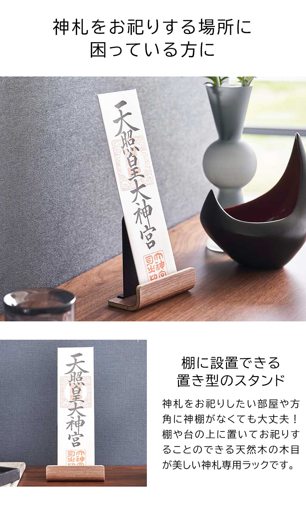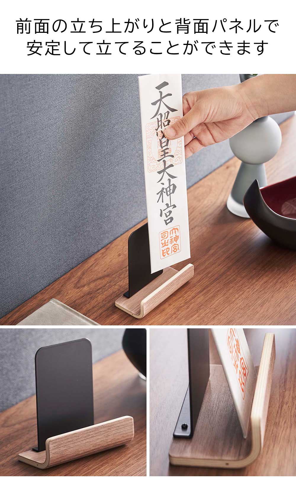 神棚がないお宅でも 神札をお祀りする場所にお困りではありませんか? こちらのスタンドを使用すれば、お祀りしたい部屋や方角に簡単に場所を作ることができます。 置き型のシンプルなスタンドで、神札を一体お祀りできるコンパクトタイプ。 前面の立ち上がり部分と背面のスチールパネルで神札を安定させ転倒を防ぎます。 木目が美しい天然木とモノトーンのスチールの組み合わせで、落ち着きのあるシンプルな佇まい。空間に自然に馴染みます。 ![]() ![]() ![]() ![]() ![]() ![]() ![]() ![]() ![]() |