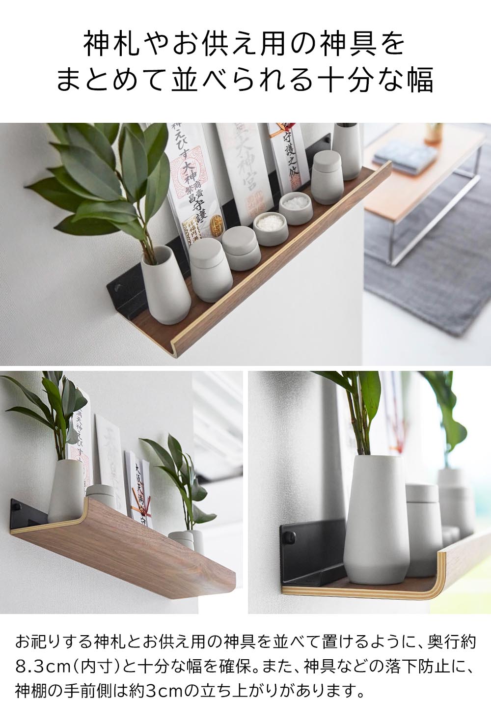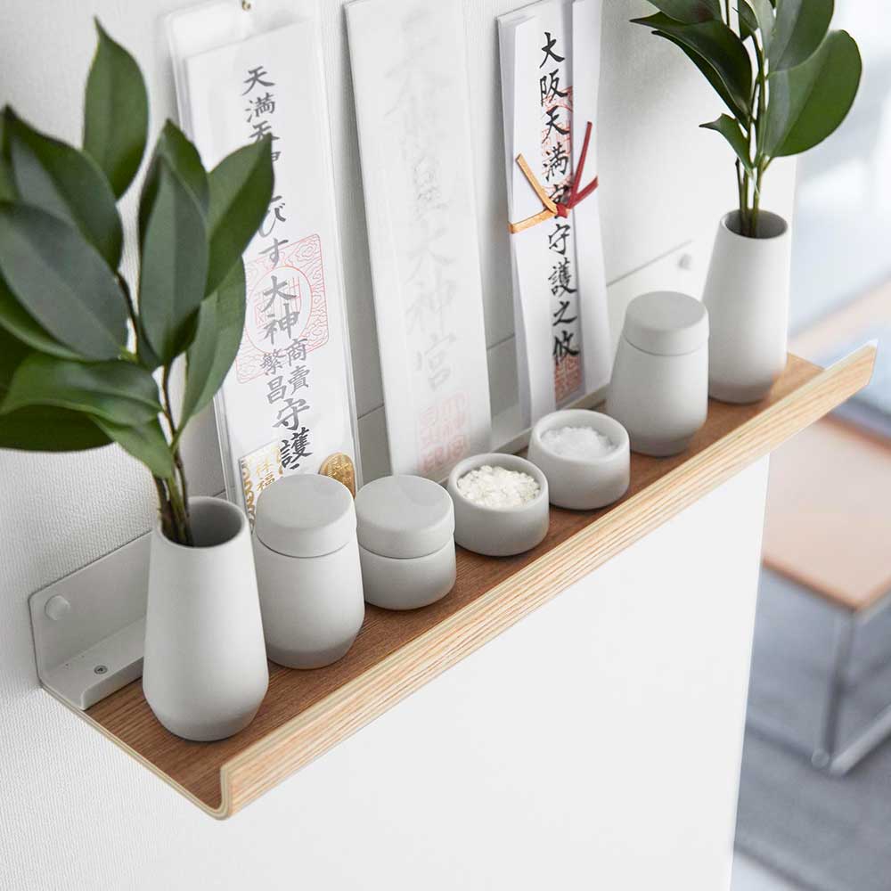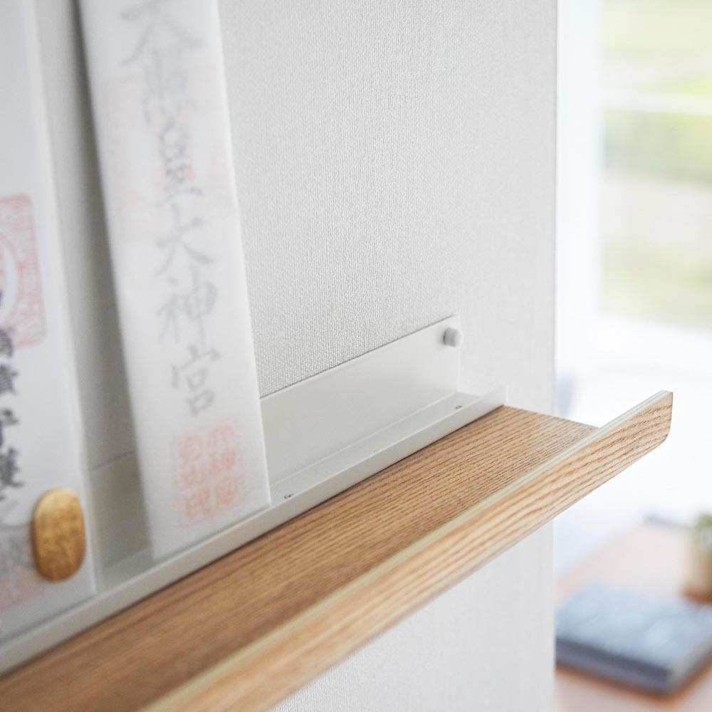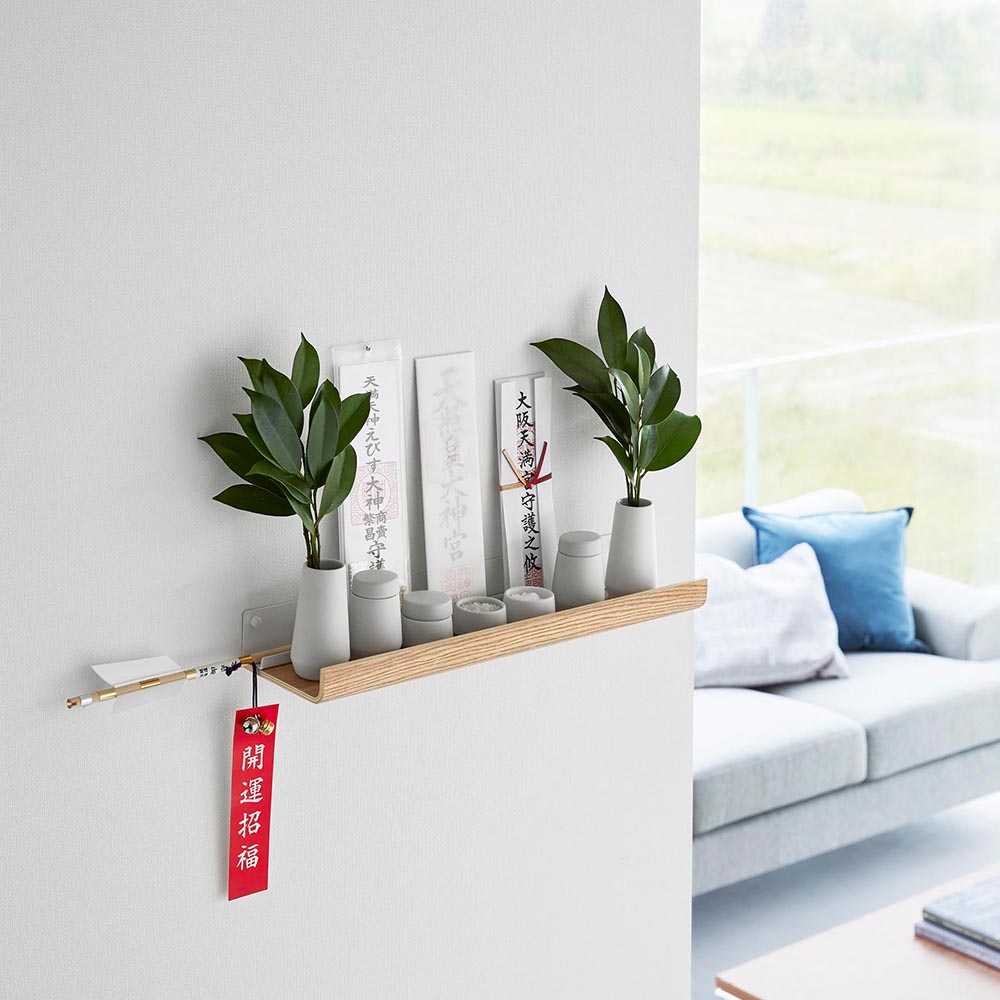 壁の穴が目立ちにくい石こうボード用ピンで取り付け簡単。壁面を活用してお祀りできる神棚です。お部屋の雰囲気やお手持ちの神具とも合わせやすいシンプルなデザイン。見上げると美しい木目が目に入り、スタイリッシュな印象のスチールとの組み合わせも良いアクセントとなっています。神具をお供えしても綺麗に収まる十分な幅と落下防止に役立つ立ち上がり。神札が倒れにくいように仕切りもついています。この仕切りに破魔矢を置いても収まり良く飾ることができて◎