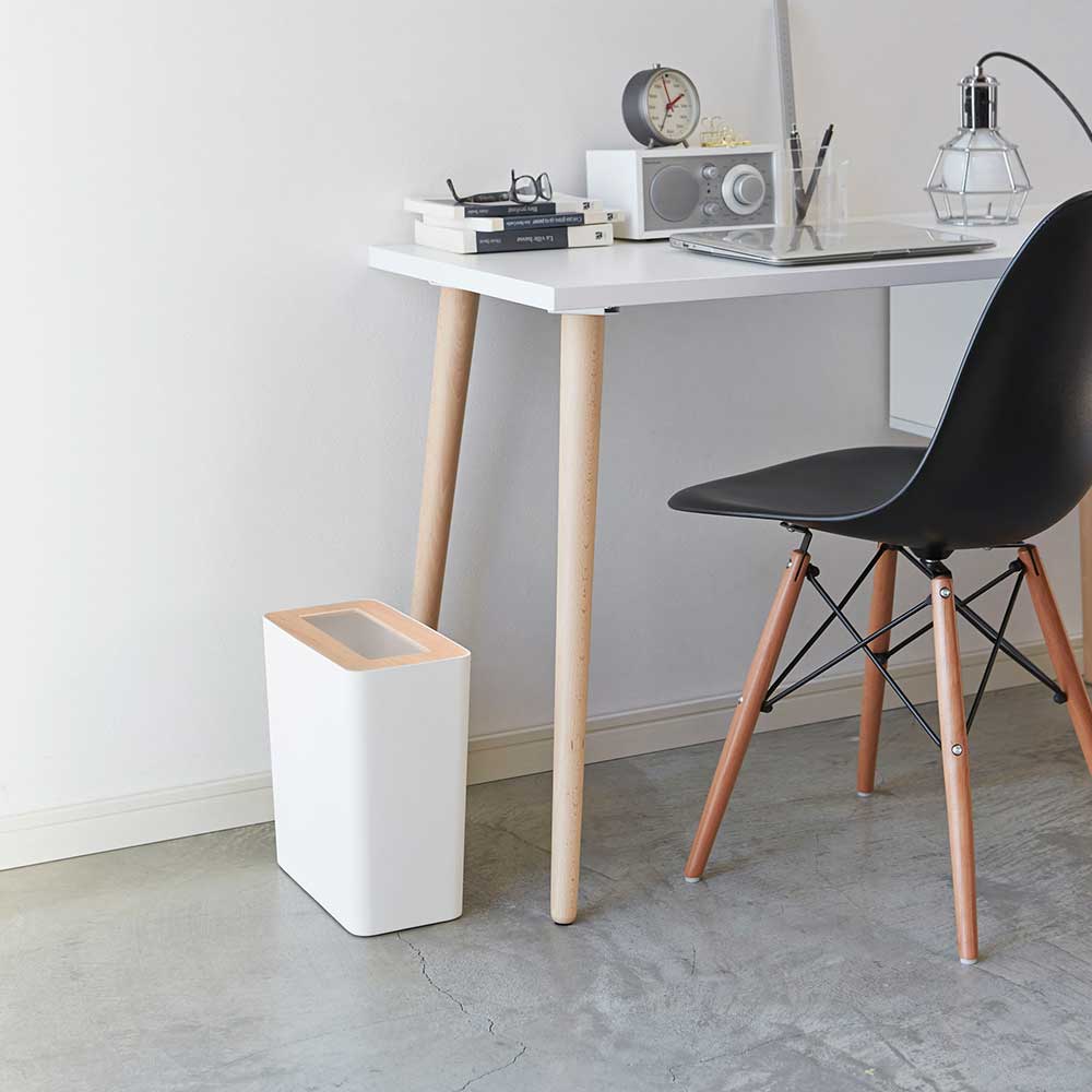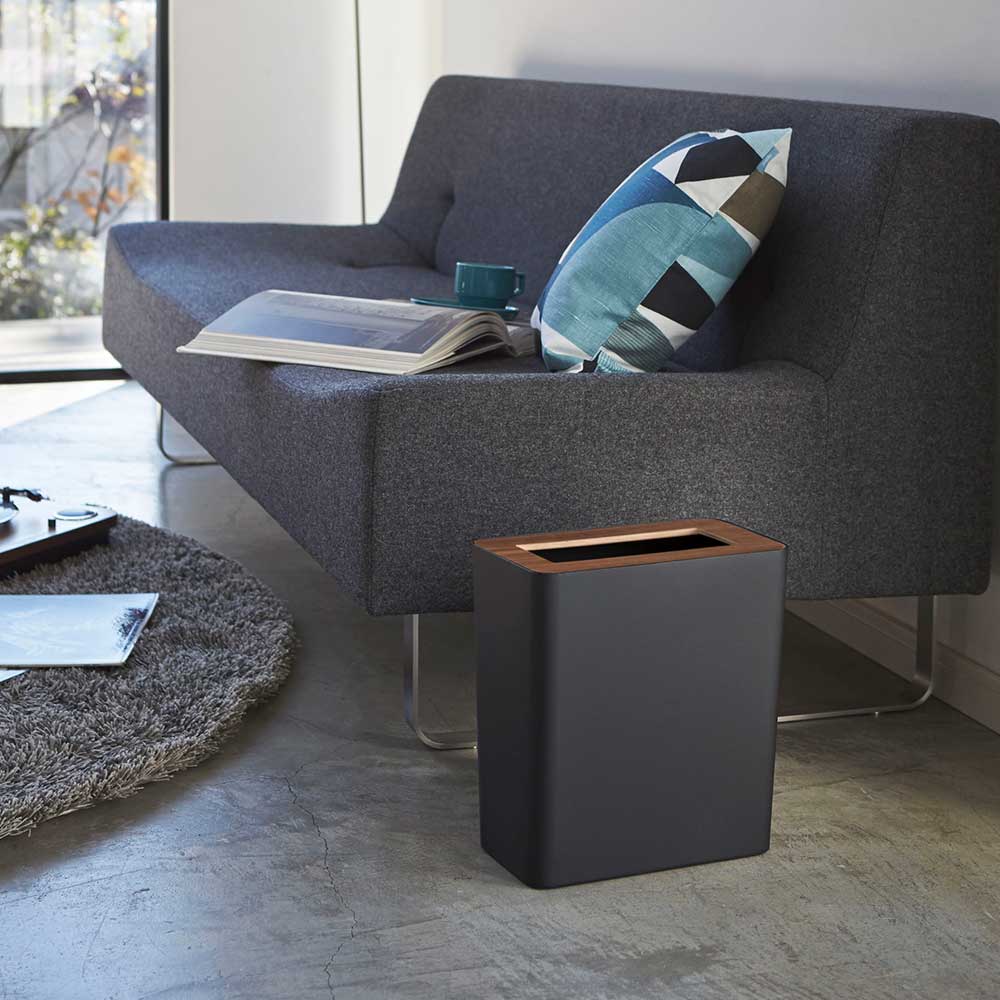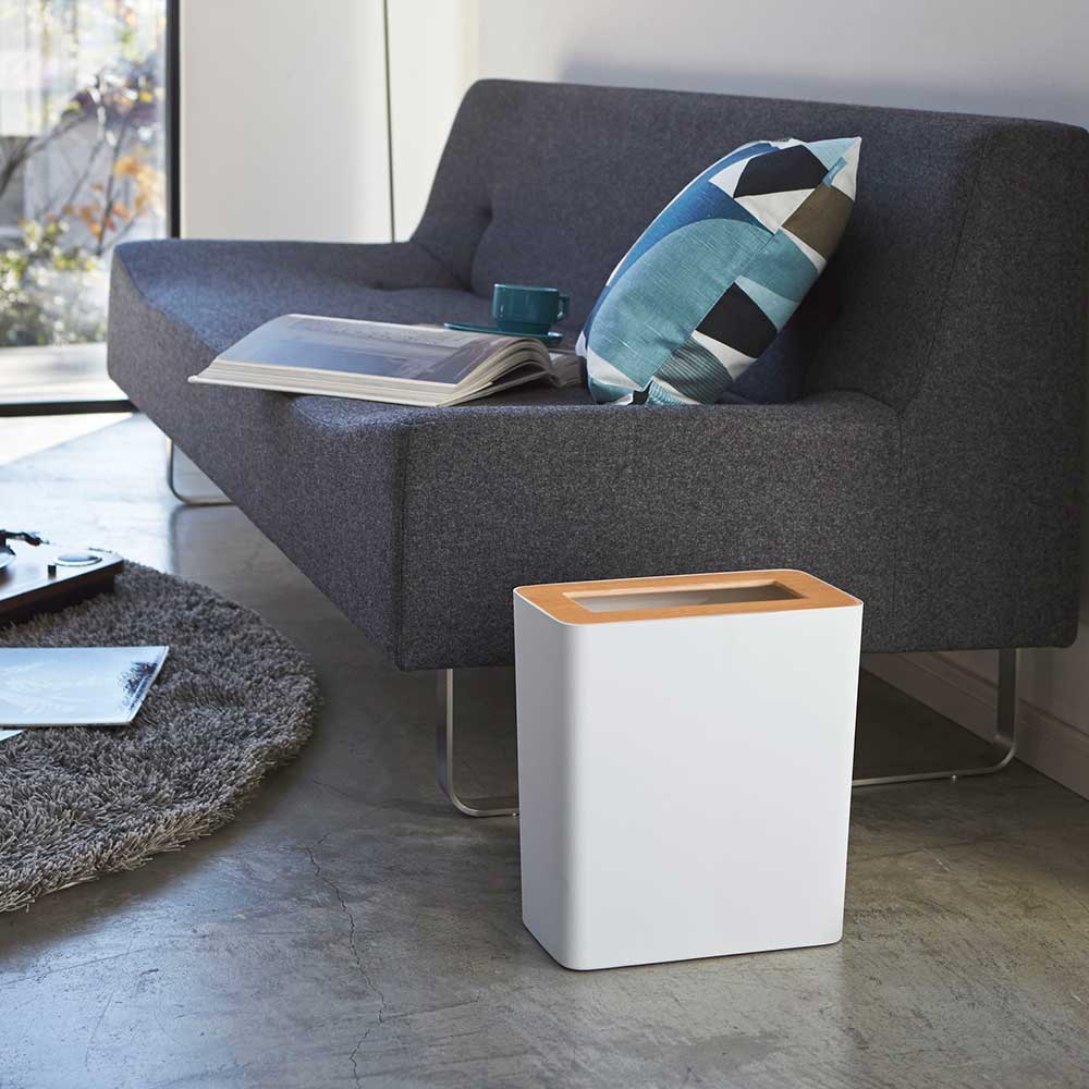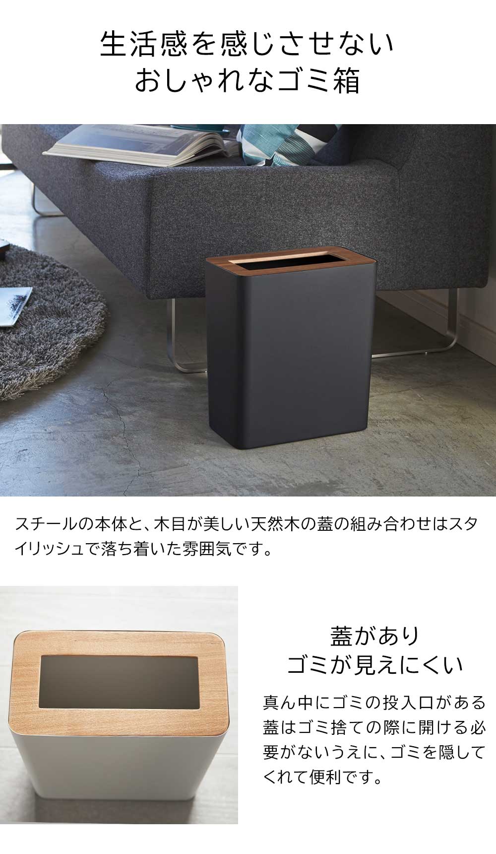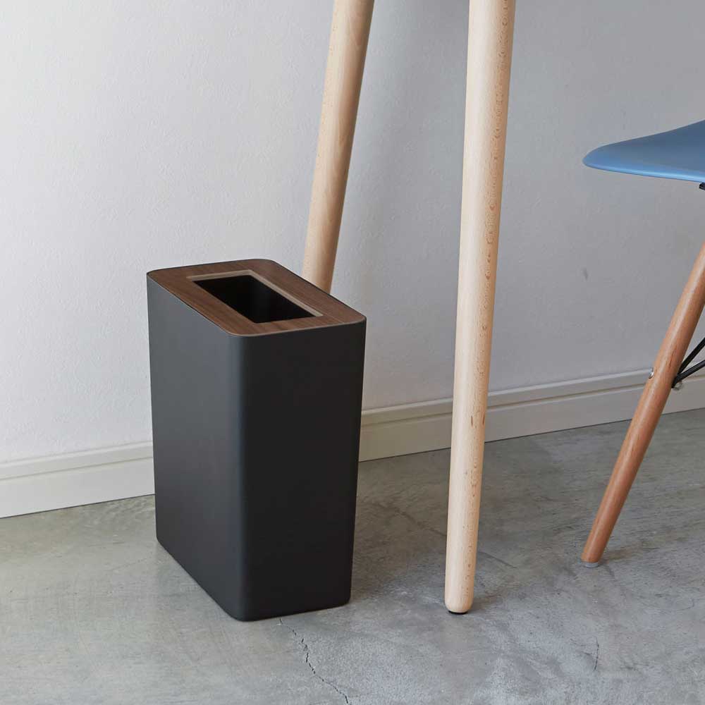重厚感のあるスチールと木目が美しい天然木の組み合わせが洗練された印象のゴミ箱です。ポリ袋は外から見えないようにセットでき生活感を感じさせません。真ん中に投入口のある蓋はゴミを隠しつつゴミ捨ての際に開ける必要がなく便利。角型のフォルムで部屋の隅やコーナーにきれいに収まります。様々なインテリアに馴染むシンプルなデザインです。