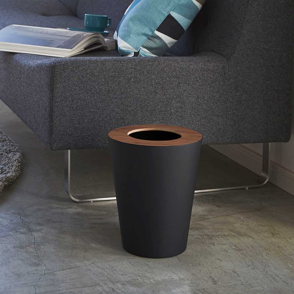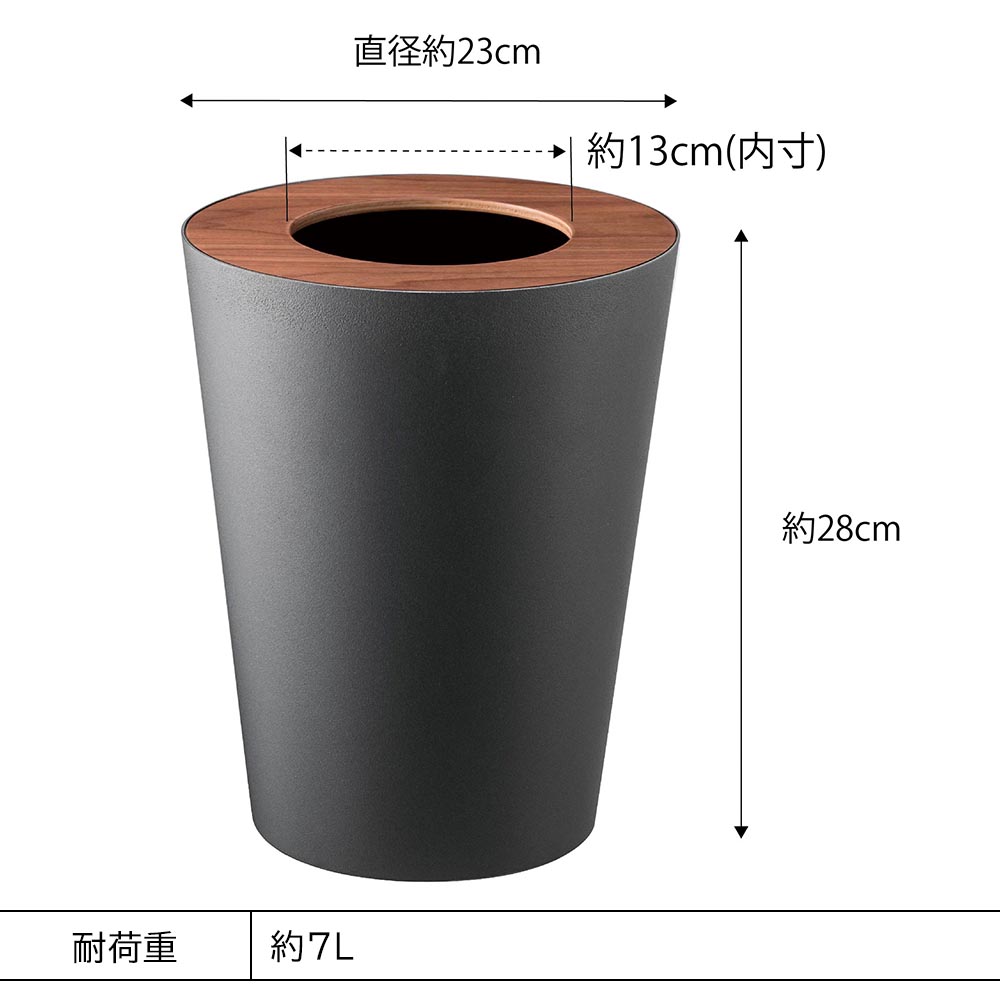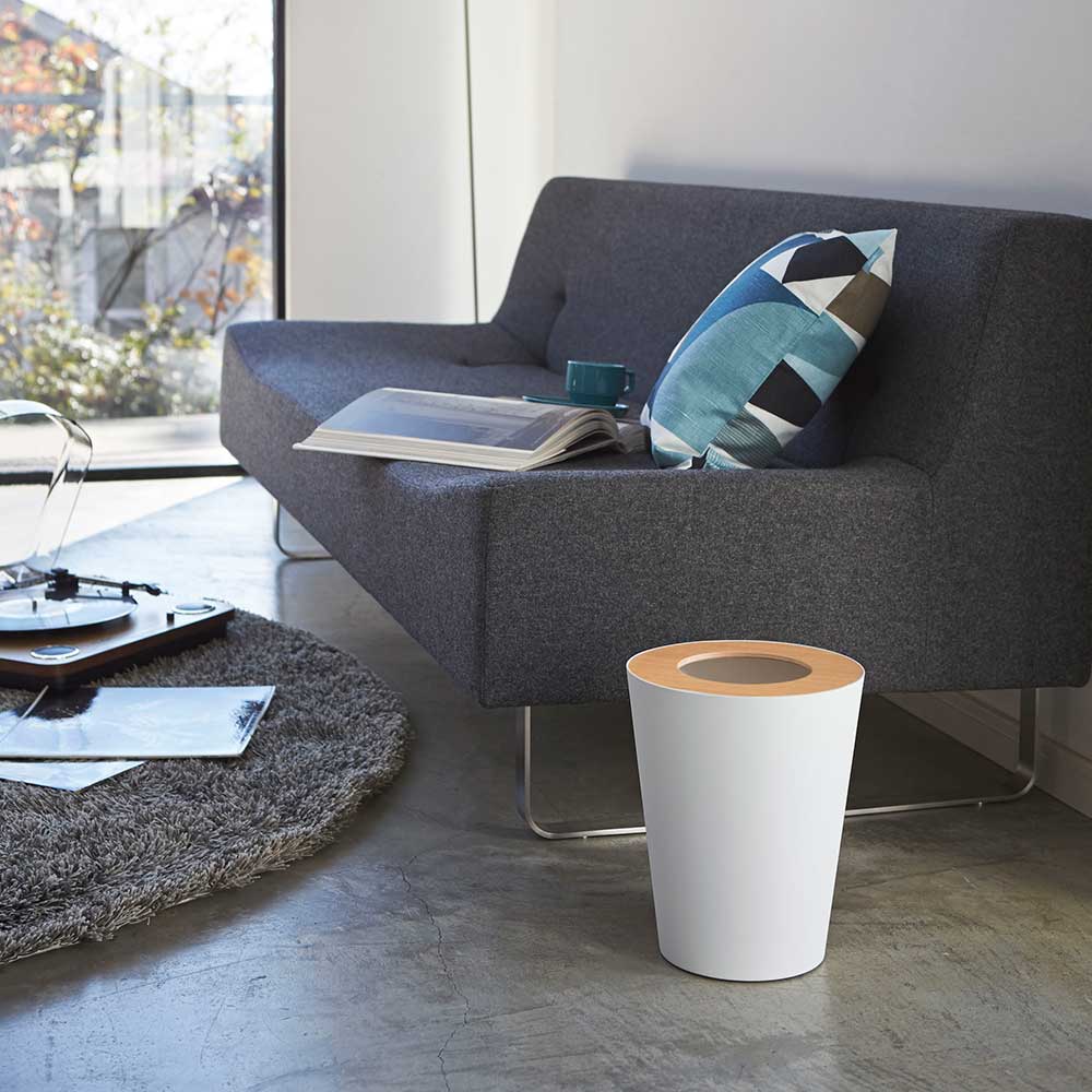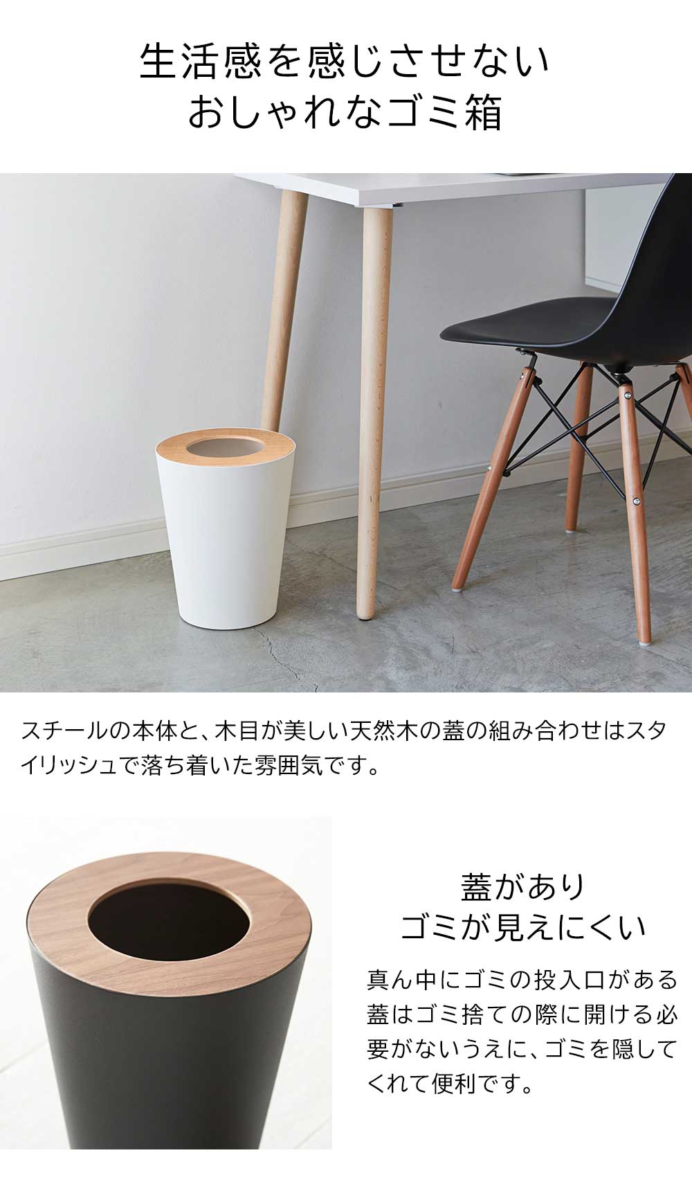 重厚感のあるスチールと木目が美しい天然木の組み合わせが洗練された印象のゴミ箱です。ポリ袋は外から見えないようにセットでき生活感を感じさせません。真ん中に投入口のある蓋はゴミを隠しつつゴミ捨ての際に開ける必要がなく便利です。丸型のシンプルなフォルムはやさしい雰囲気で、様々なインテリアに馴染みます。