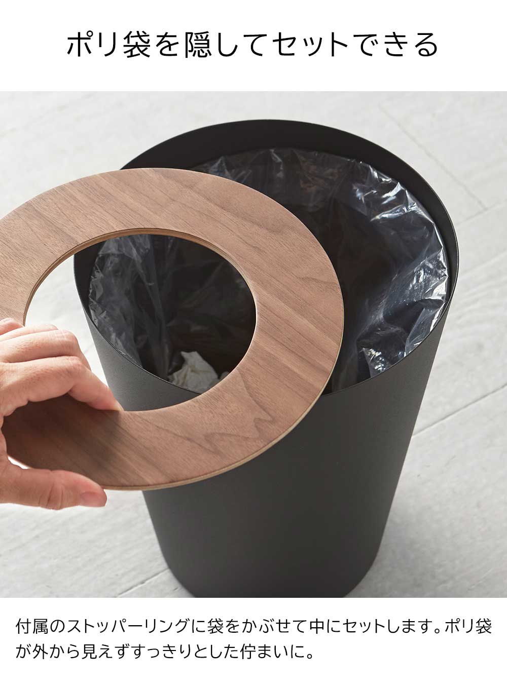 ポリ袋を隠してセットできる インテリア性の高い おしゃれな丸型のゴミ箱