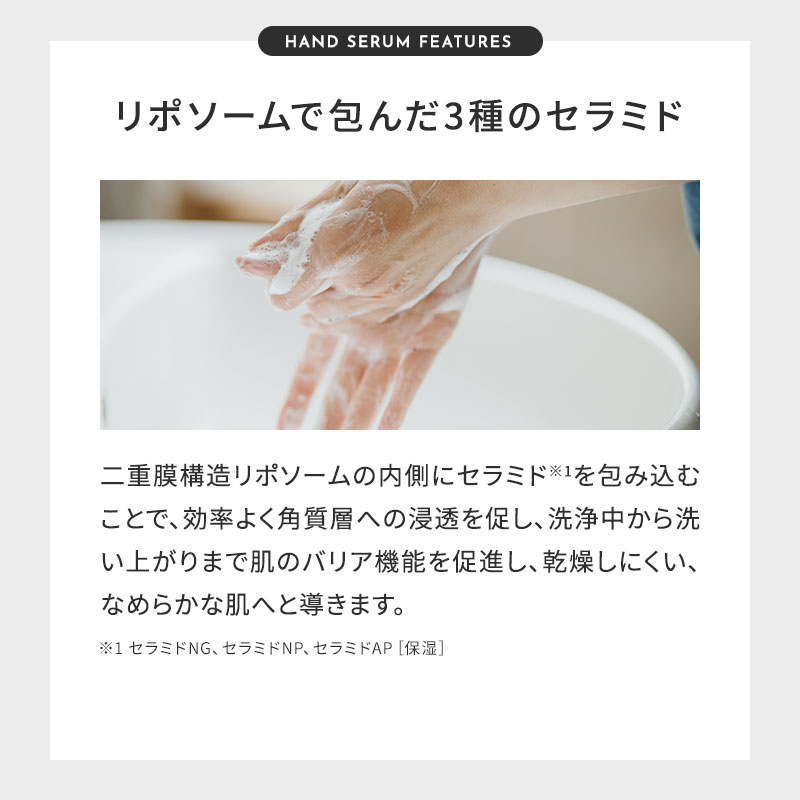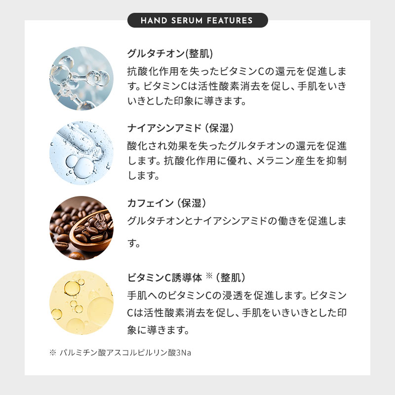 ・ビタミンC誘導体 ※2(整肌成分):肌(角質層)に浸透し、肌のキメを整えてなめらかさを与えます。潤いにより透明感のある、明るい印象の手肌へと導きます。