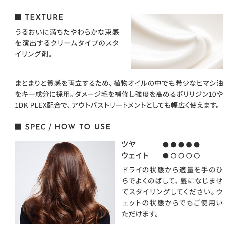 ダメージを受けた毛髪を補修し強度を高める ポリリジン10 や 1DK PLEX などのケア成分によりアウトバストリートメントとしてもマルチにお使い頂けます。
