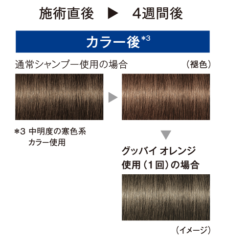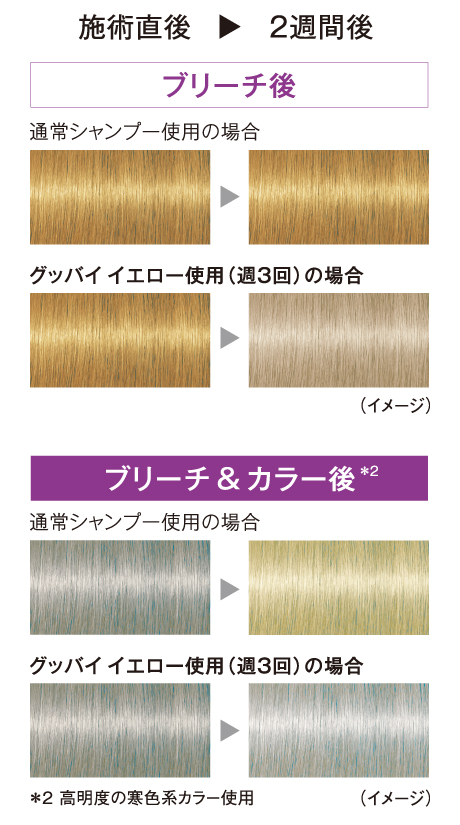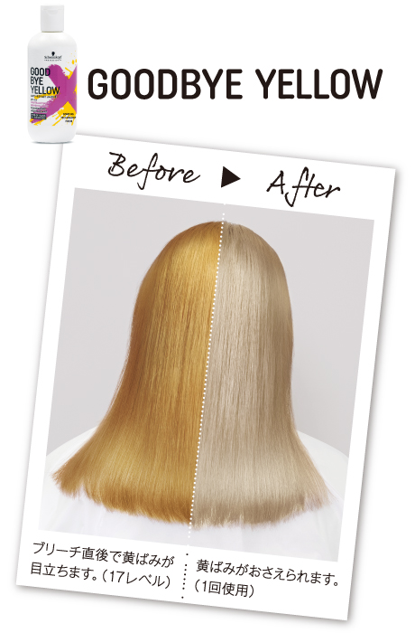 「黄ばみ」「オレンジみ」をおさえ、ブリーチ後、ブリーチ&カラー後、カラー後のキレイな髪色を長く楽しめます。
