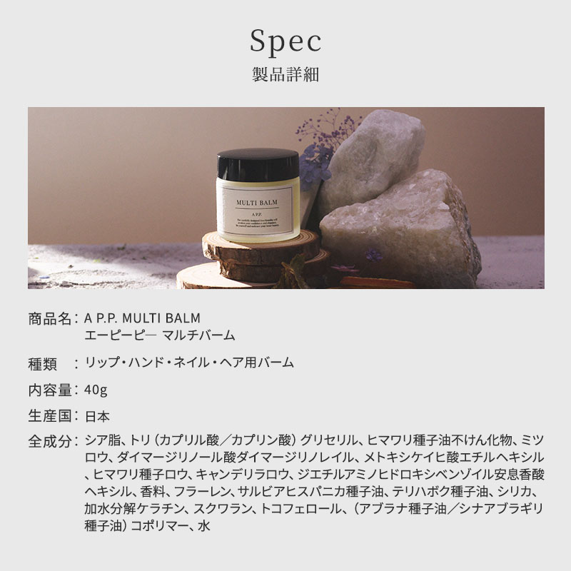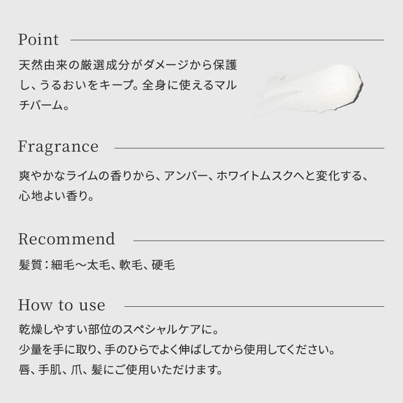 天然由来の厳選成分を配合した、髪・肌・全身に使えるマルチバームです。