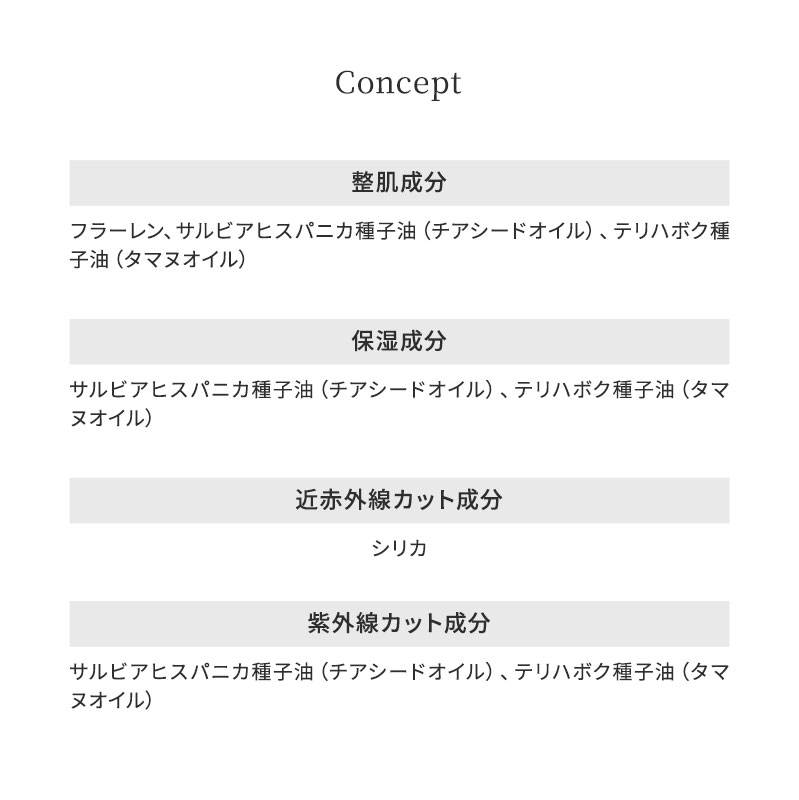 ■サルビアヒスパニカ種子油(チアシードオイル)、テリハボク種子油(タマヌオイル)が、紫外線による乾燥から保護し、うるおいを与えます。
