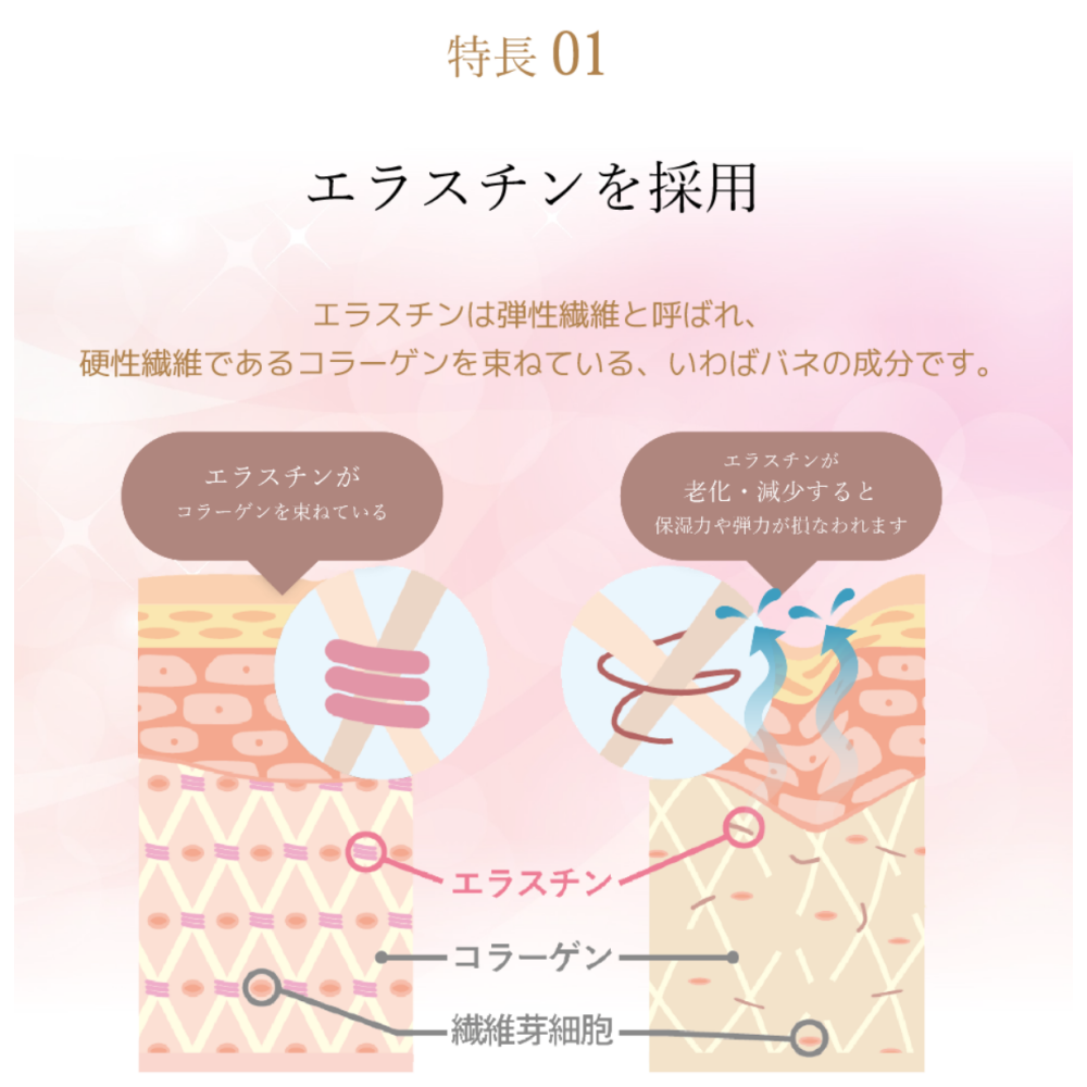 オールインワンゲルですので、化粧水、美容液、乳液、クリームの役割をこちら一つで果たします。特許製法により、低分子エラスチンがお肌をしっかり保湿、高分子エラスチンがお肌を水分蒸発や光老化から守る“本当にこれ一つで良いオールインワンゲル”として好評を得ております。また、アルコール、パラベン、シリコーン、合成香料などお肌に刺激のあるものを使わず、敏感肌にも対応しております。